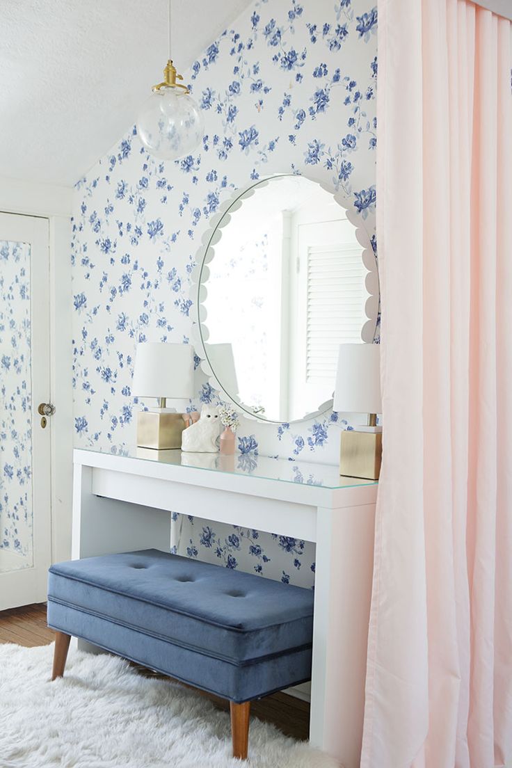 No banheiro, você também pode colar papel de parede em flor para levantar o seu espírito durante um banho. Recomenda-se escolher cores pastel que tornem a sala acolhedora e luminosa. Luz de fundo com um padrão contrastante ajudará a dar ao banheiro iluminação adicional, assim você não terá que usar lâmpadas de alta potência.