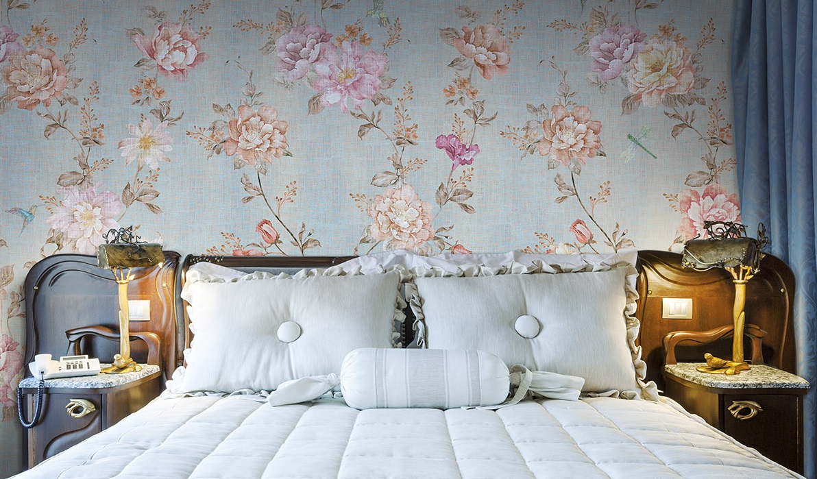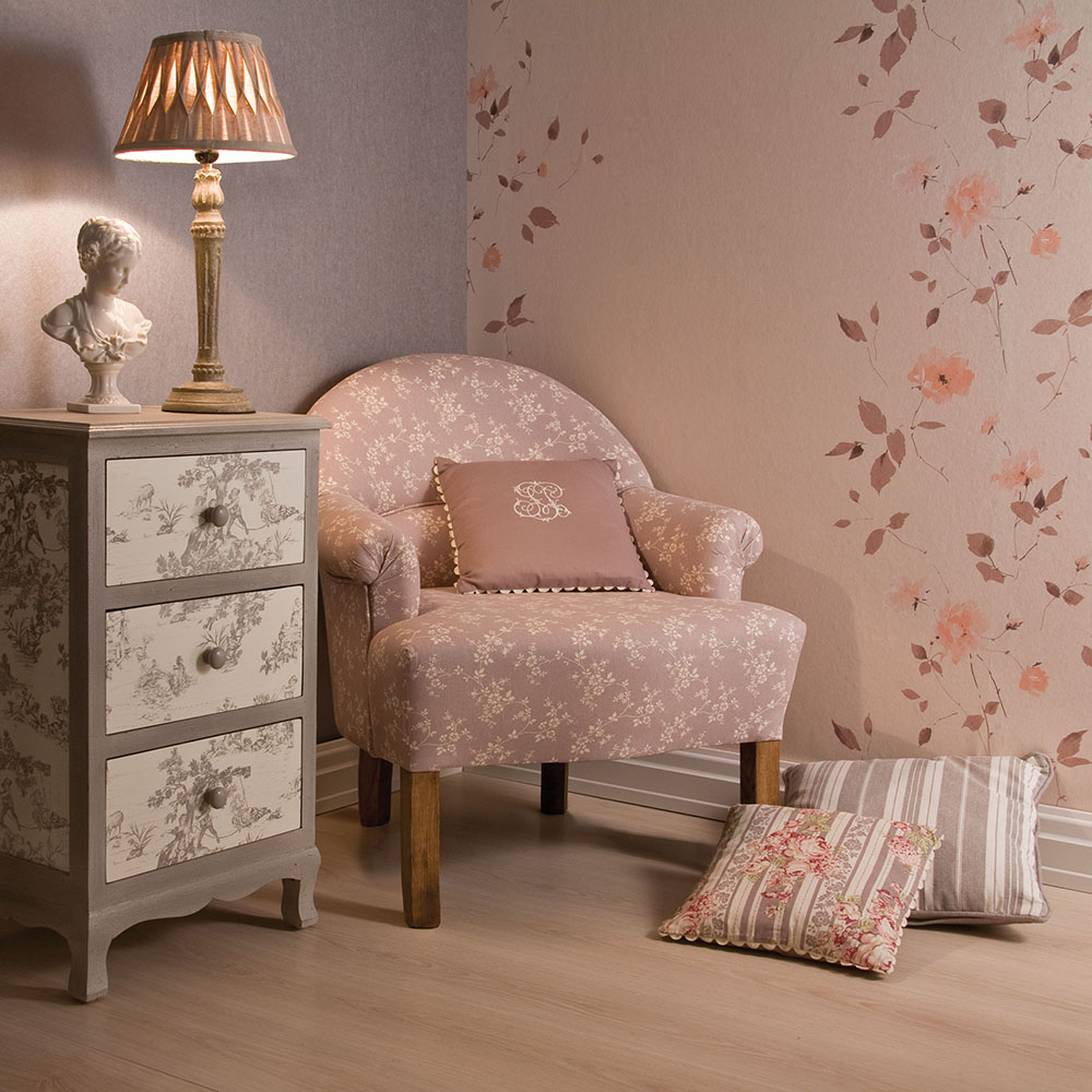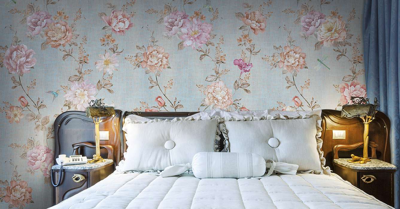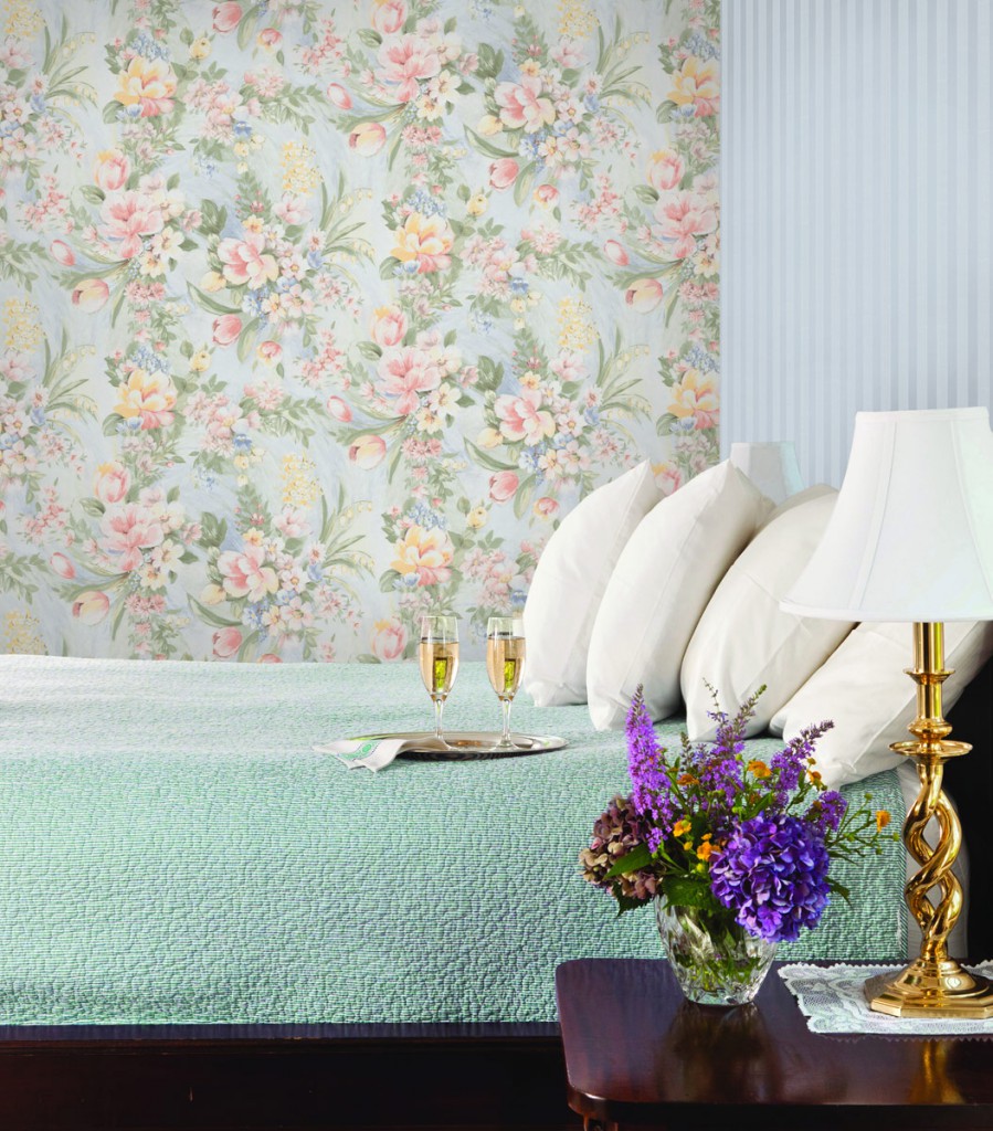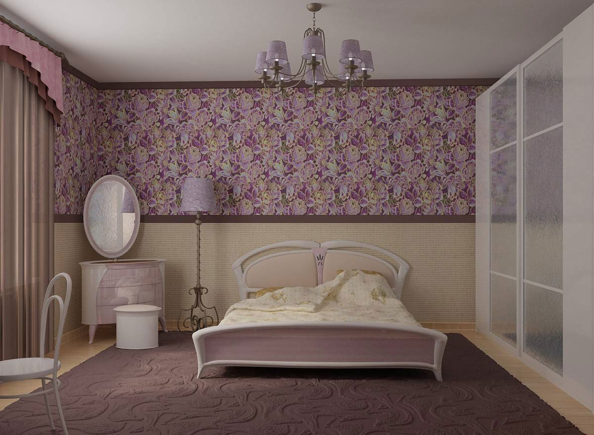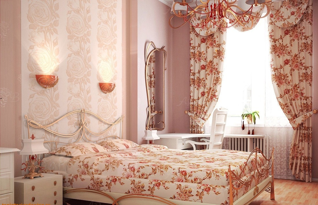 Recomenda-se que o quarto seja apresentado com um estilo calmo - Provence, Classic e outros, o que requer a colagem de paredes em uma pequena flor. Eles não toleram frieza - o calor na combinação de fundo e estampa floral é bem-vindo.