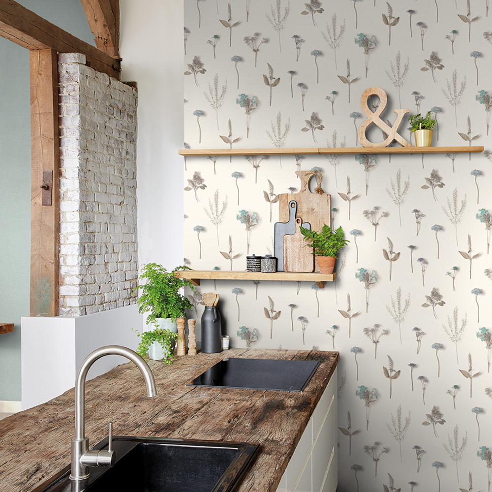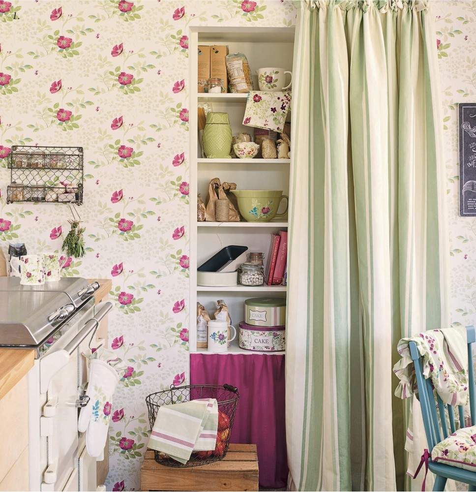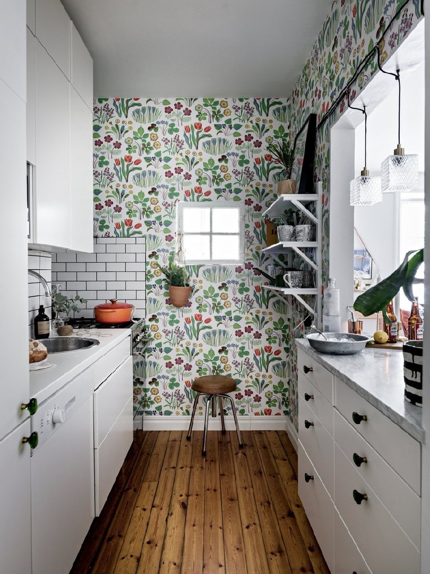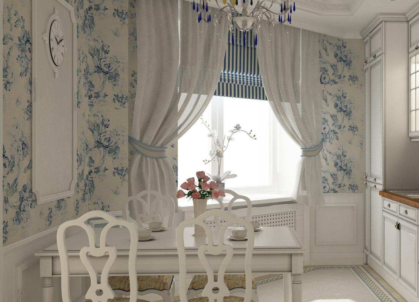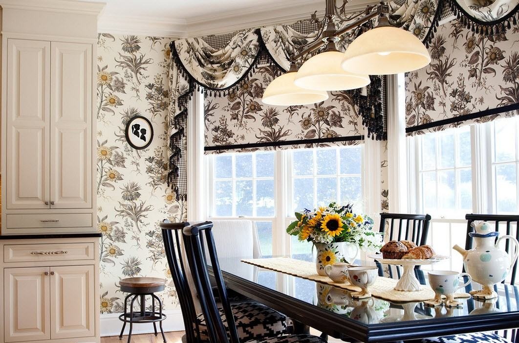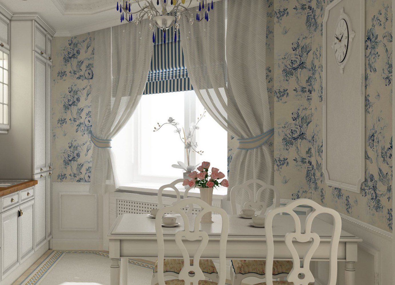On a cozinha Esta opção parece incomum, mas muito bem. Escolha flores pequenas em uma pequena cozinha em um fundo claro, e grandes em grandes. Escolha um papel de parede com um padrão brilhante, colando-o em uma parede livre da sala. Flores na cozinha é preferencialmente usado no estilo de Provence ou Country.