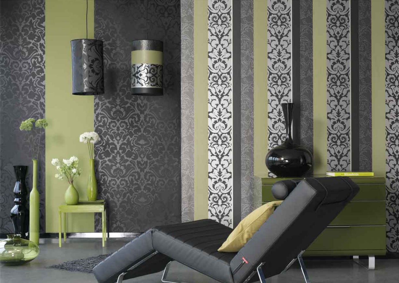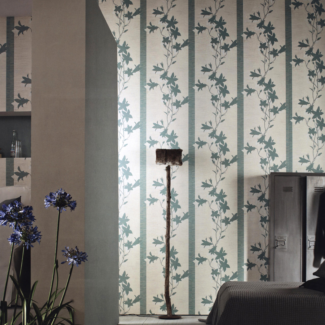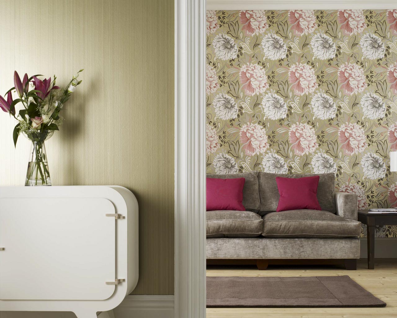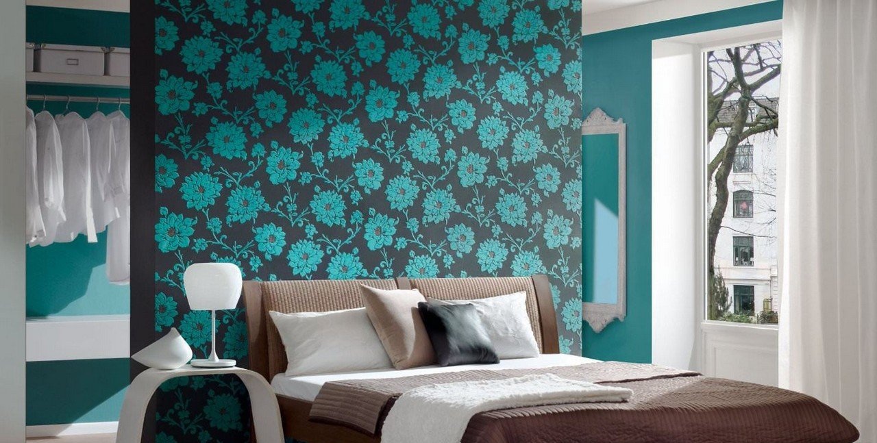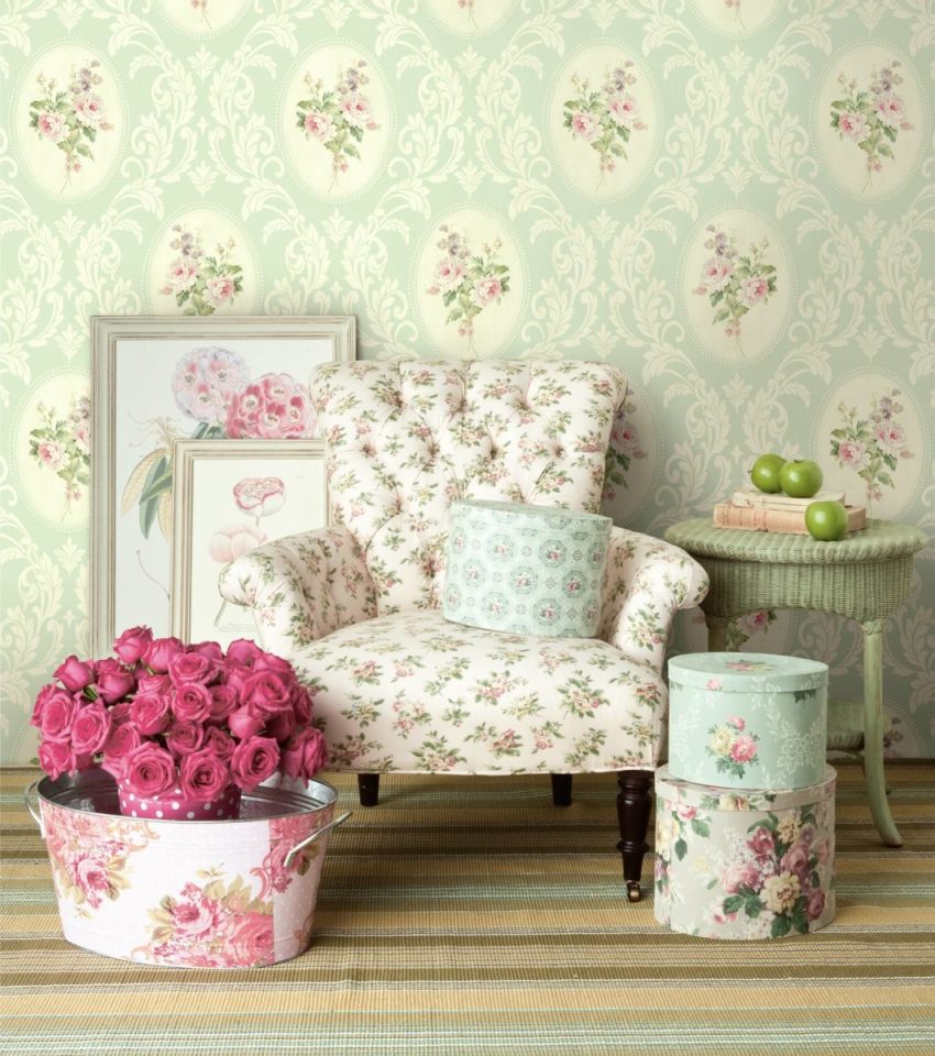 Papel de parede verde com flores, muitas vezes apenas complementam o interior, e não atraem a atenção dos moradores. Portanto, você pode colar sobre elas todas as paredes.