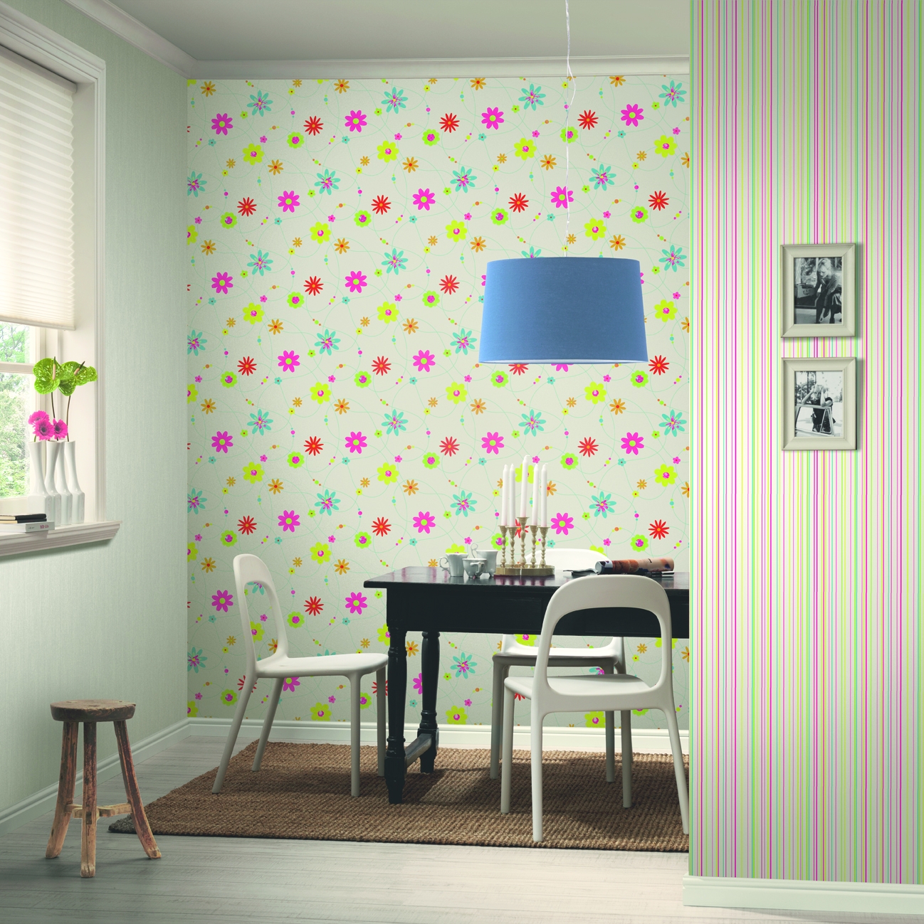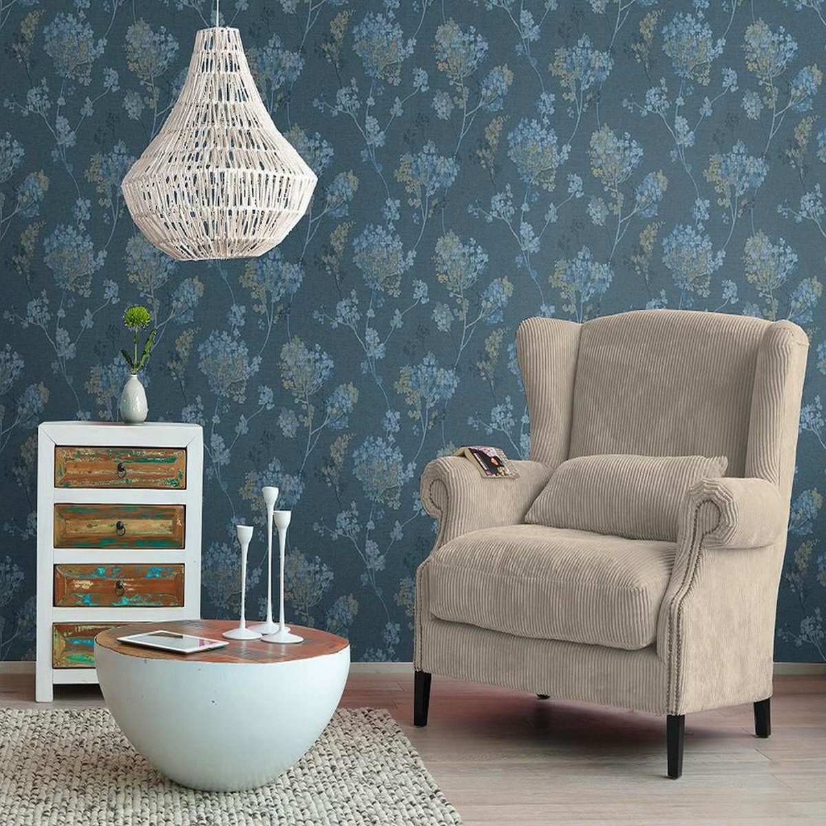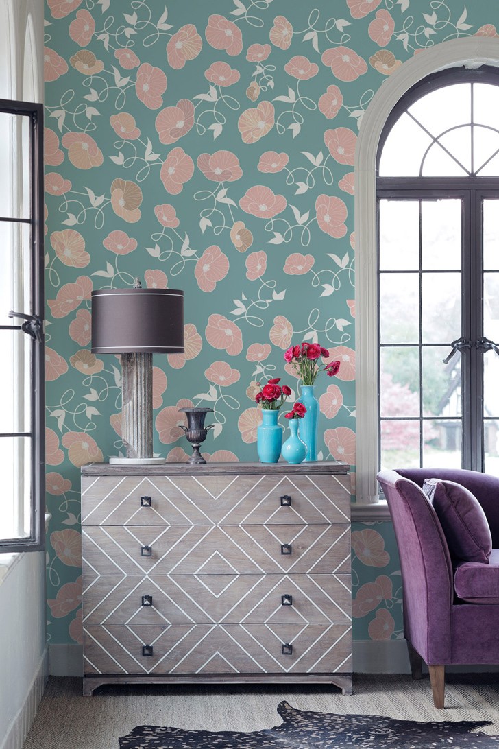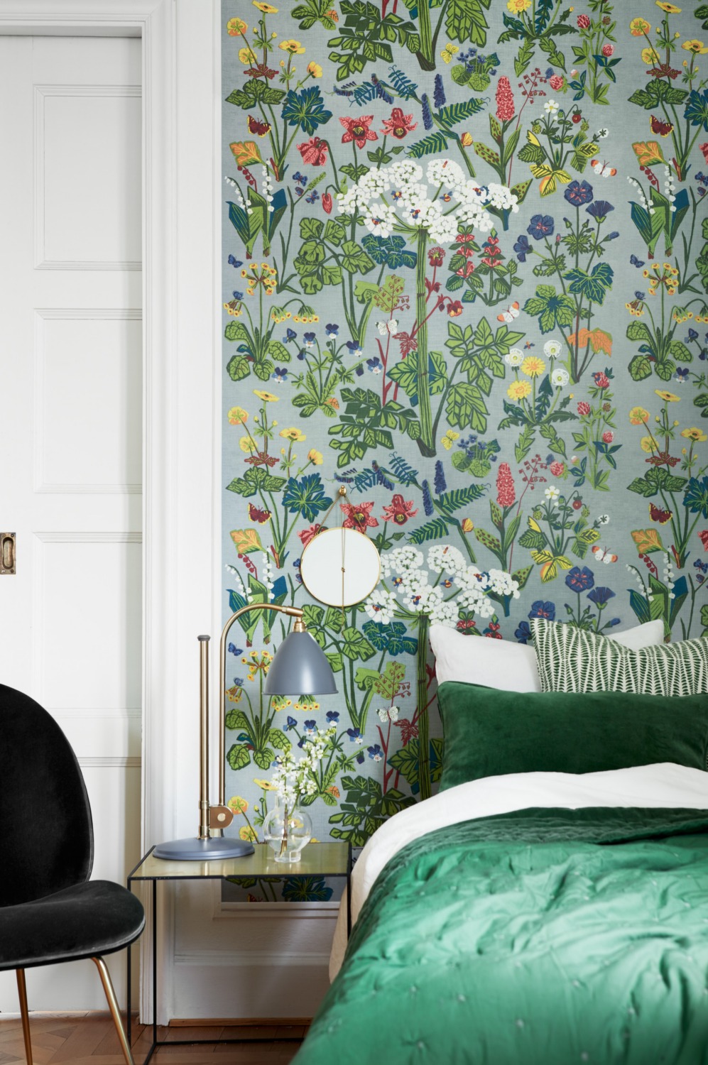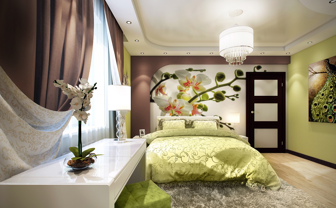 Papel de parede verde com flores, muitas vezes apenas complementam o interior, e não atraem a atenção dos moradores. Portanto, você pode colar sobre elas todas as paredes.