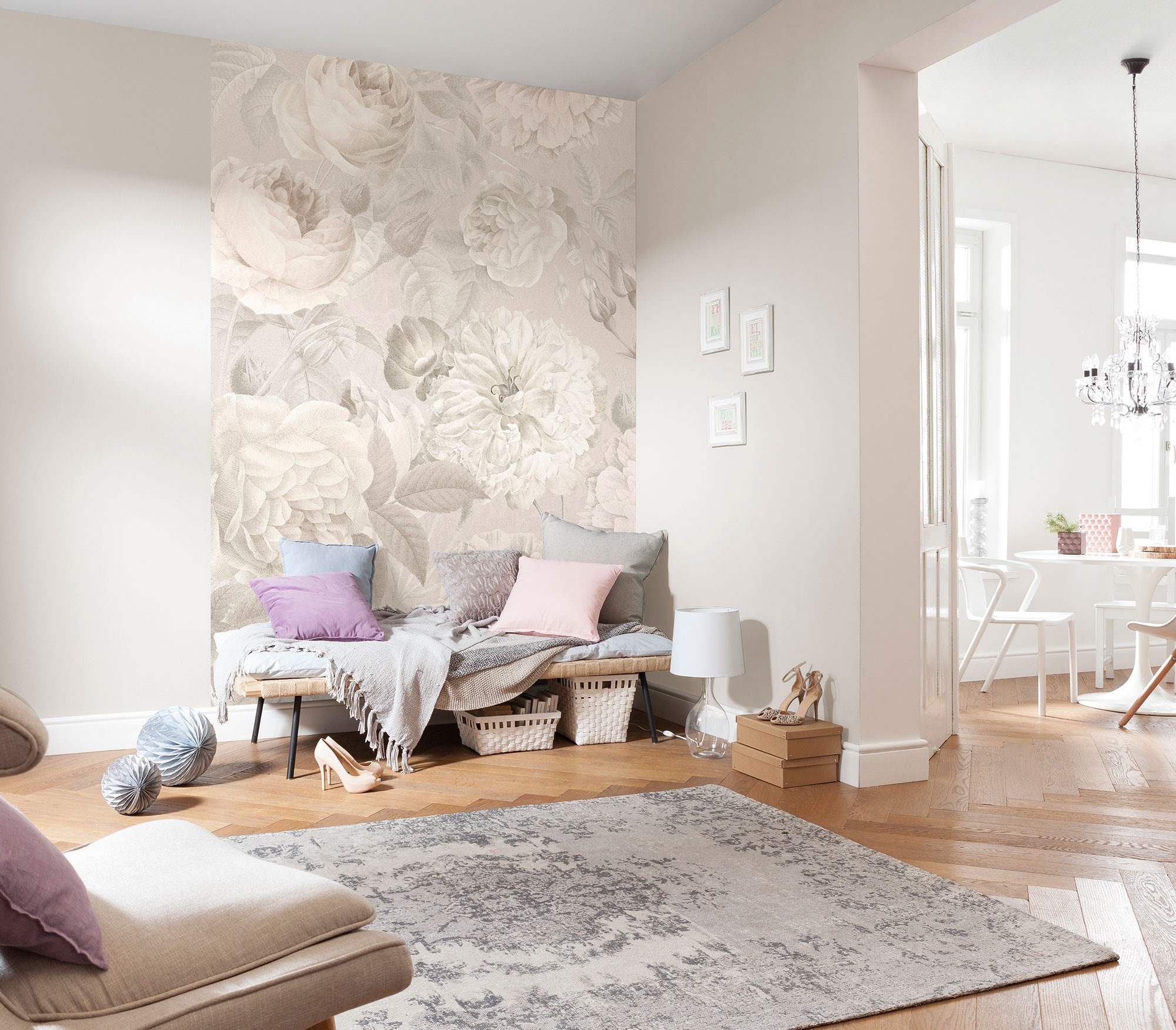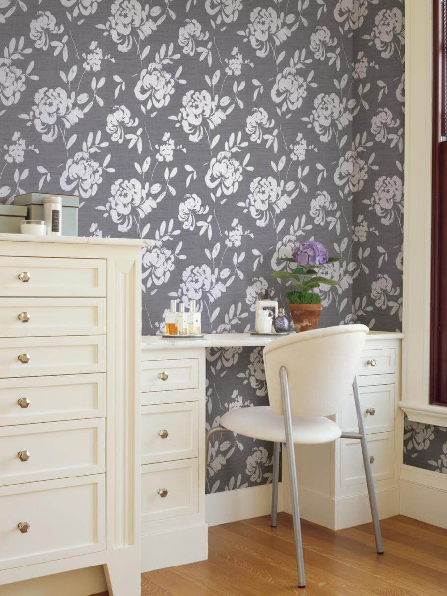 Estas são variedades atualmente conhecidas, portanto, são adequadas para o estilo moderno. Fundo cinza combinam com tons quentes de estampa floral, bem como com paredes claras, se você usar o método de combinar vários tipos de papel de parede.