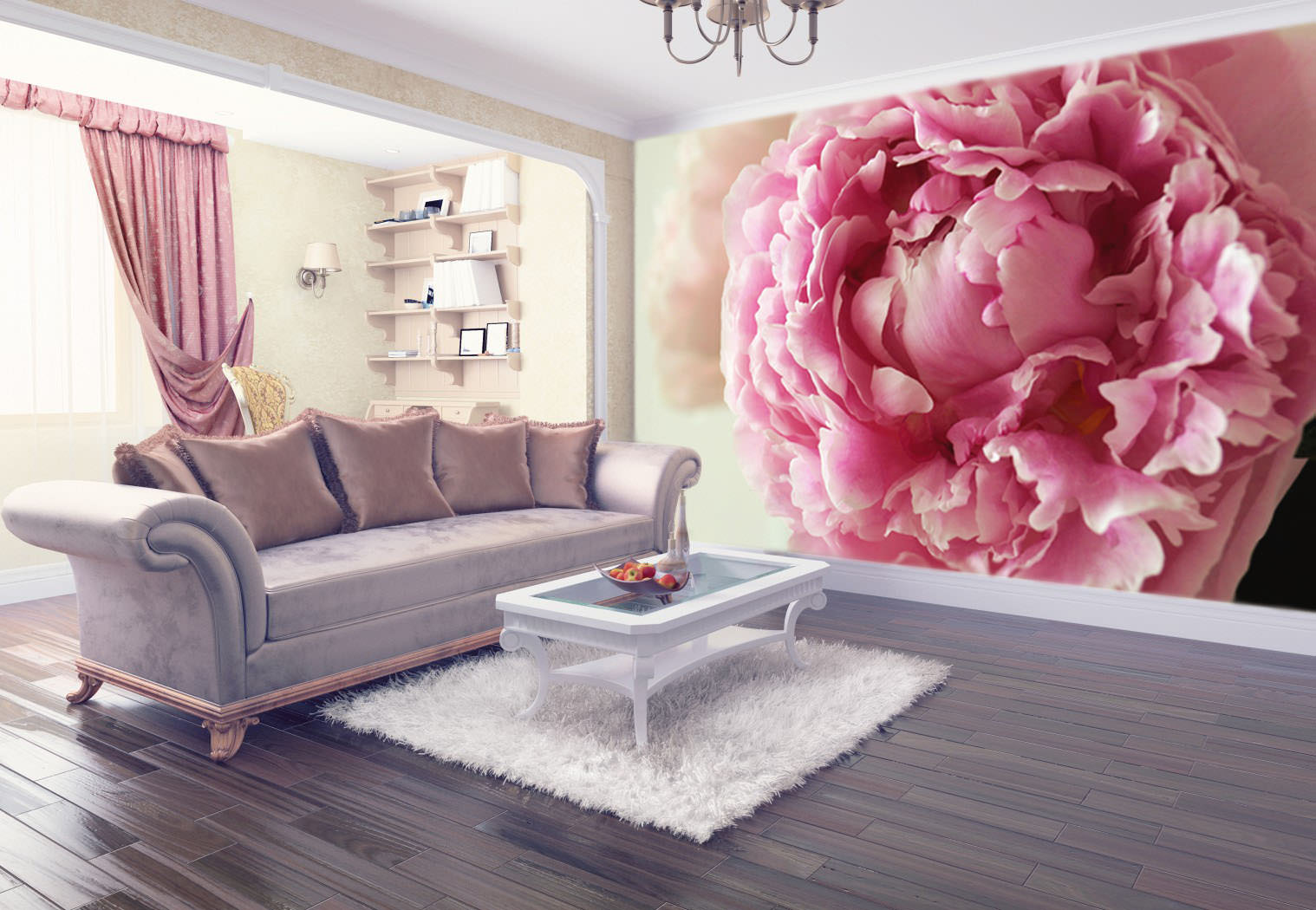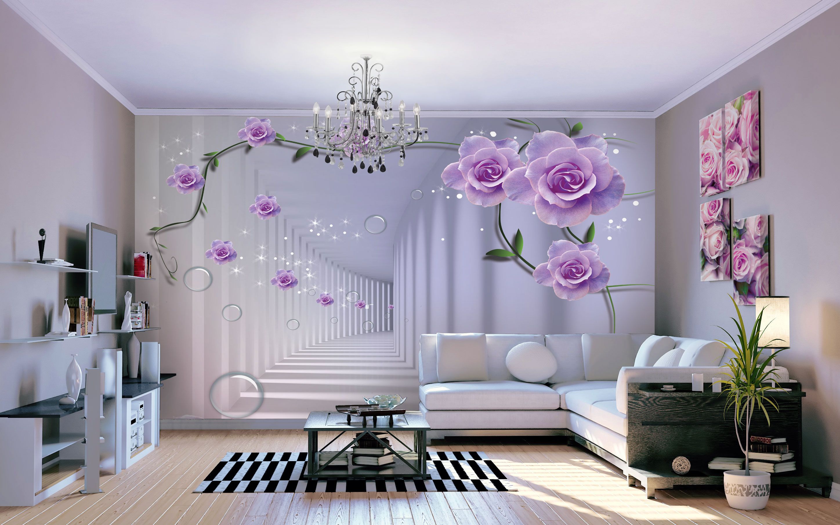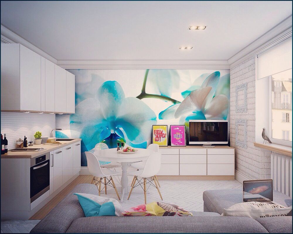 - Em uma sala grande e até em uma pequena, você pode fazer uma imagem de papel de parede em uma flor. Para fazer isso, cole uma impressão quadrada ou retangular brilhante em uma parede. Cole uma borda brilhante, formando a foto.