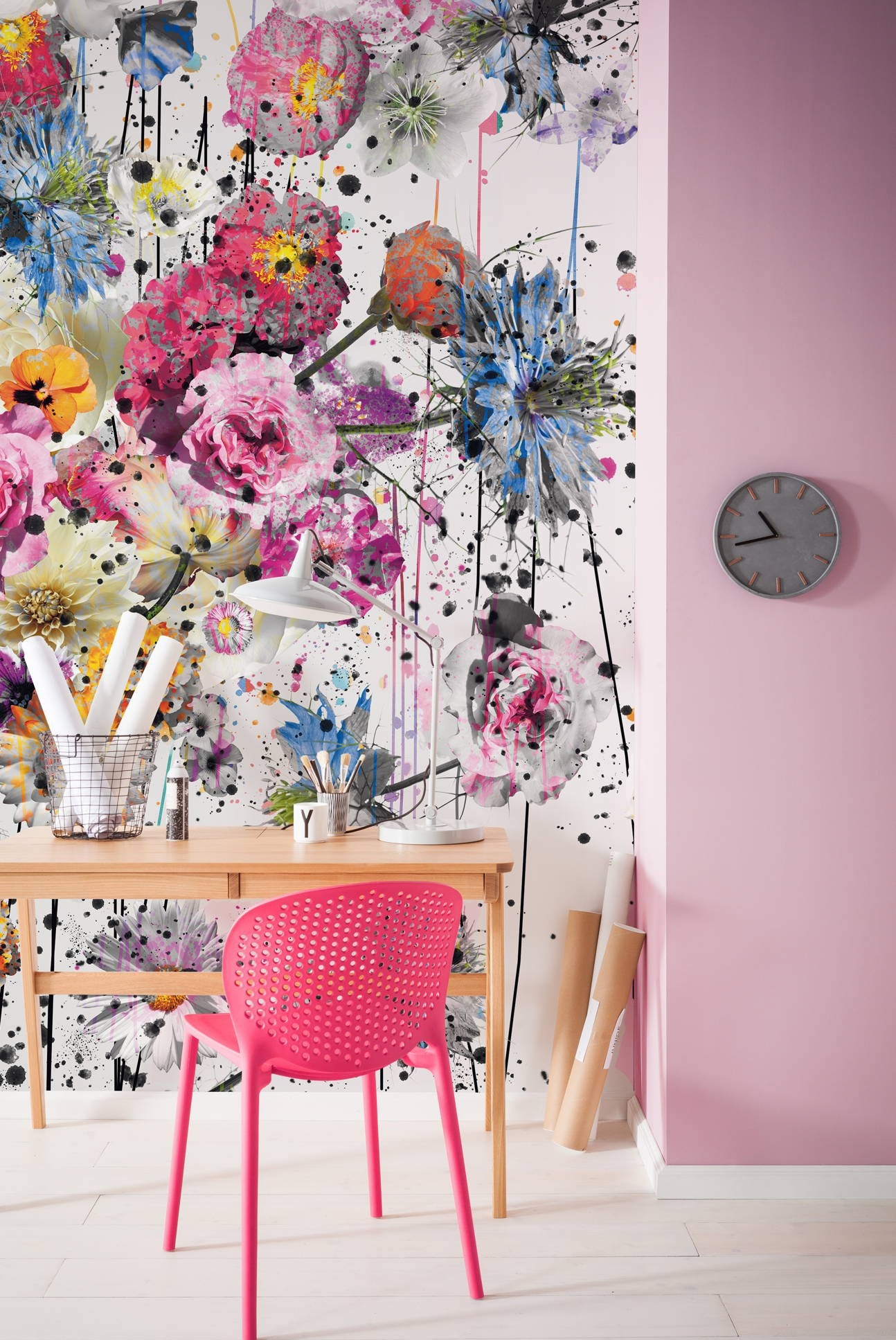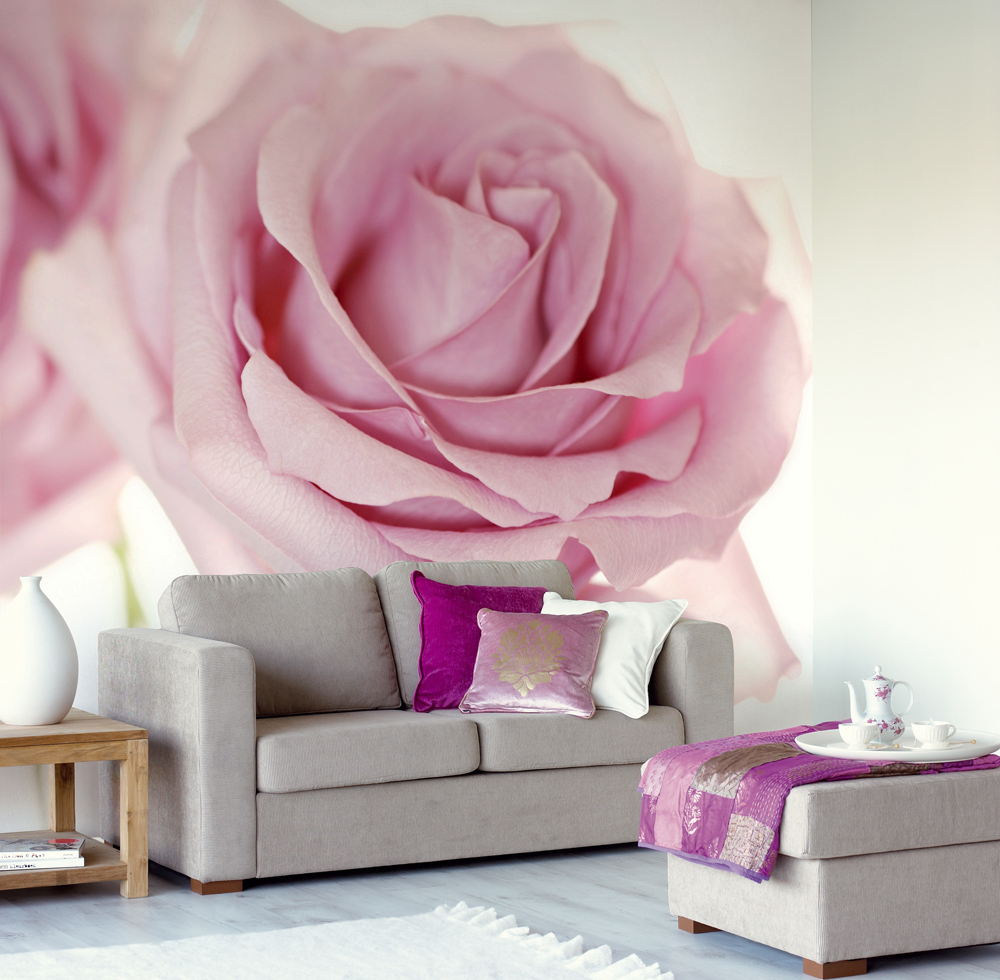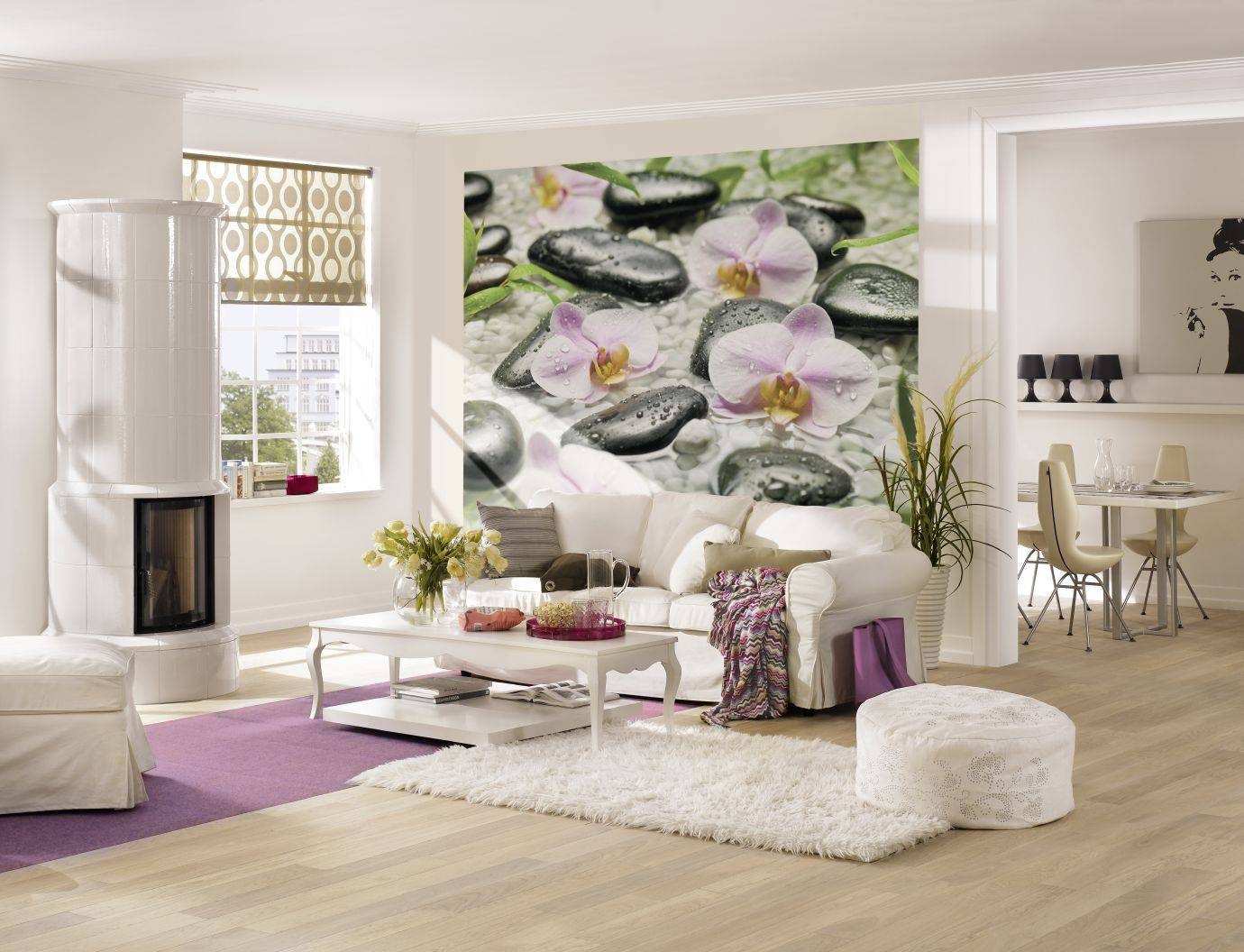 - Em uma sala grande e até em uma pequena, você pode fazer uma imagem de papel de parede em uma flor. Para fazer isso, cole uma impressão quadrada ou retangular brilhante em uma parede. Cole uma borda brilhante, formando a foto.