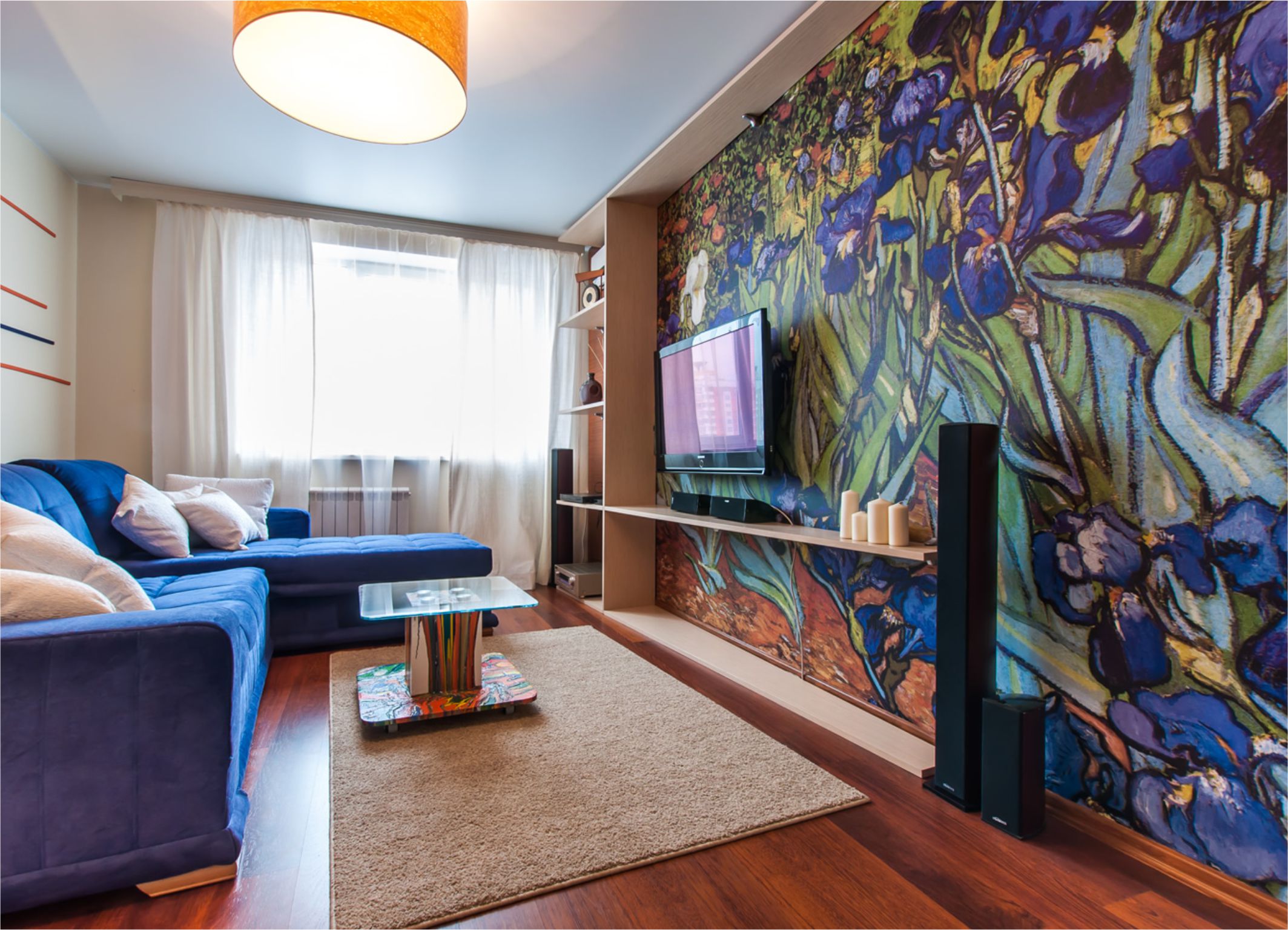 A sala de estar deve ser festiva, por isso as imagens são melhores para escolher colorido e brilhante, com um contraste nítido e transição. Se houver uma pequena área, cole apenas uma parede - atrás do sofá, para que as cores brilhantes selecionadas não prejudiquem o estado psicológico da família.