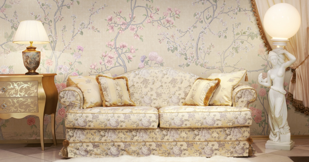 - Contraste brilhante do fundo e motivos florais é pesado para a percepção visual, afeta negativamente a psique humana. Se a escolha for feita, recomenda-se colar sobre a parede apenas atrás das costas das pessoas sofá em sala de estaratrás da cabeceira as camas em o quarto.