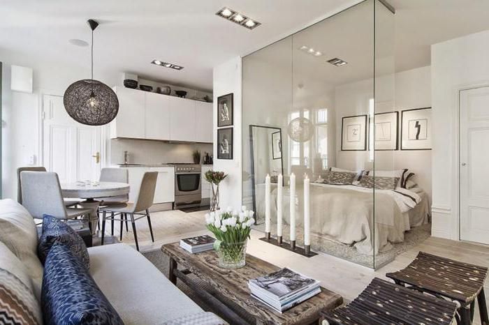Decida por si mesmo se o espaço aberto será confortável. A versão do estúdio permite aumentar a área. Neste caso, é importante escolher o zoneamento do espaço. Geralmente combinar sala de estar e cozinha casa de banho e banheiro. Neste caso, é necessário instalar um bom escape, para que os cheiros não fluam de uma sala para outra.