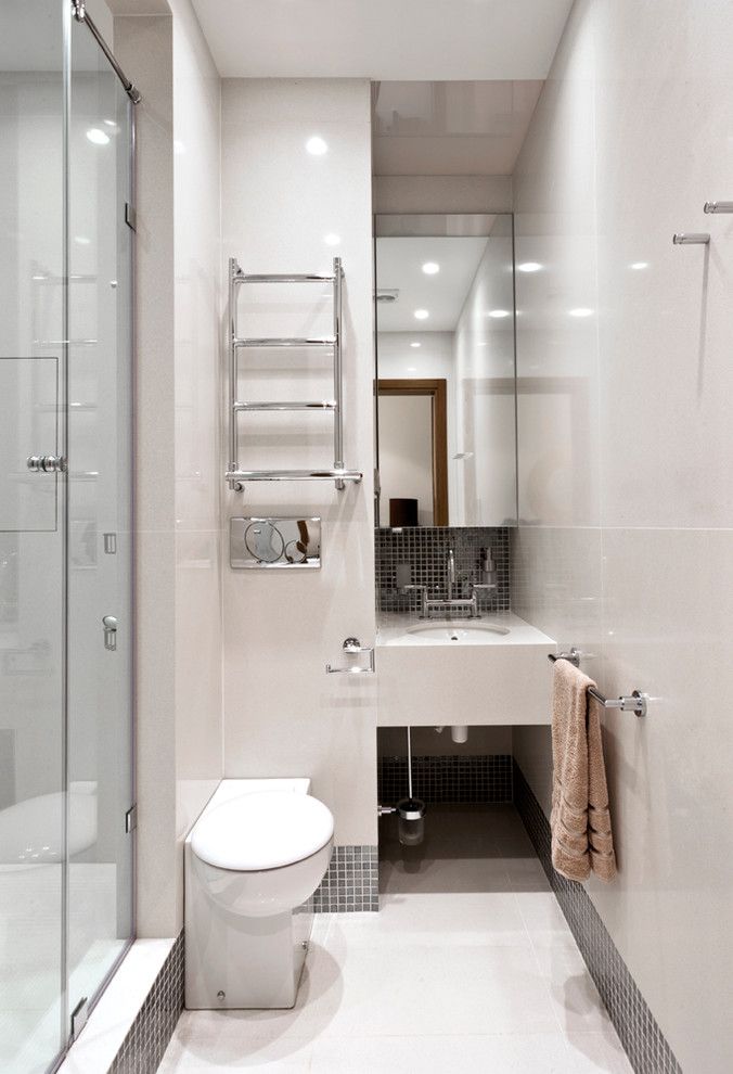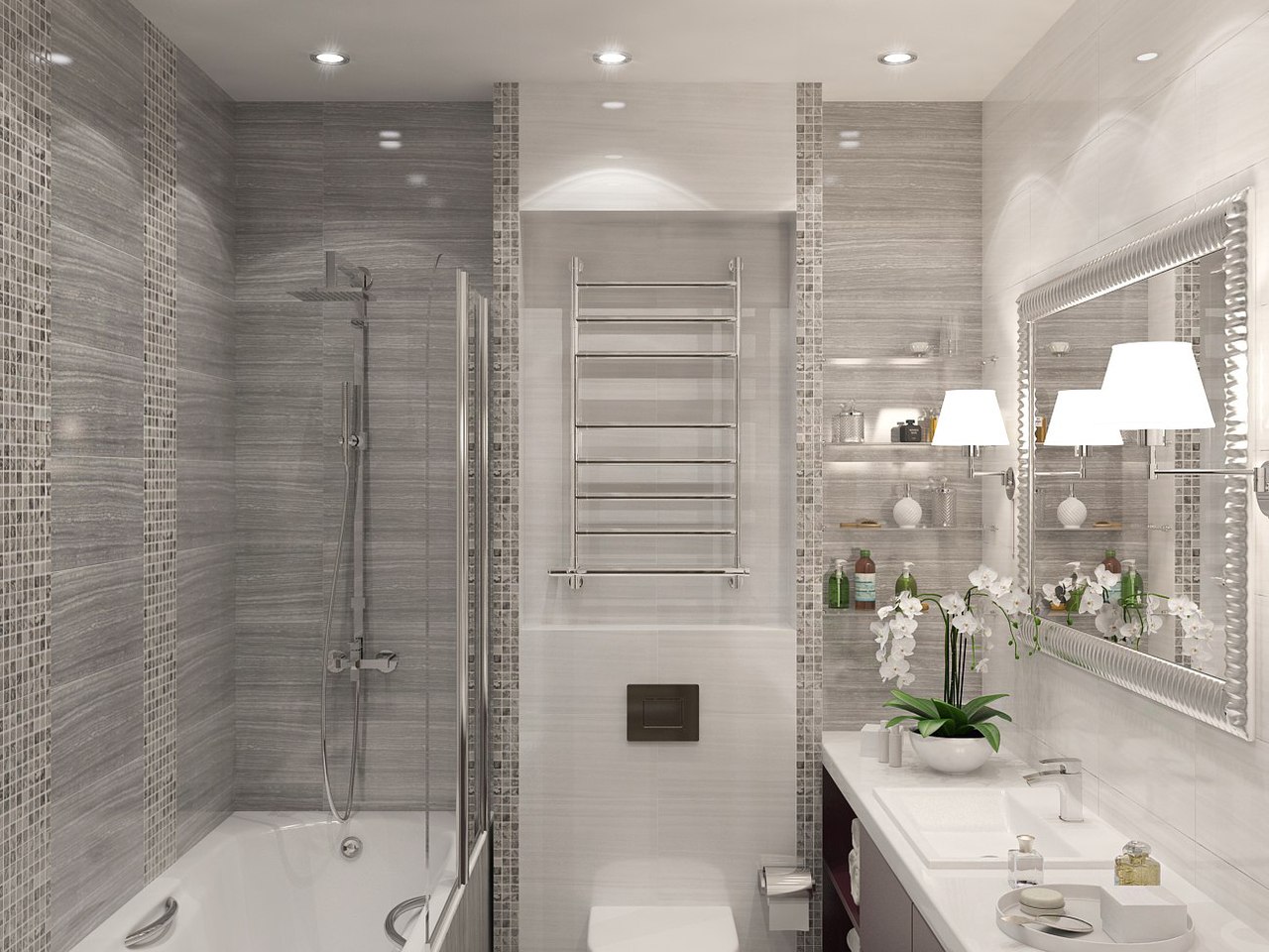 Obtenha vasos sanitários em balanço e poupe 0,5 m². Eles menos "roubam" a área da sala. Separe visualmente o vaso sanitário com uma partição baixa. Ele pode servir como um local de armazenamento e prateleira para itens decorativos, velas. Só não exagere com os detalhes.