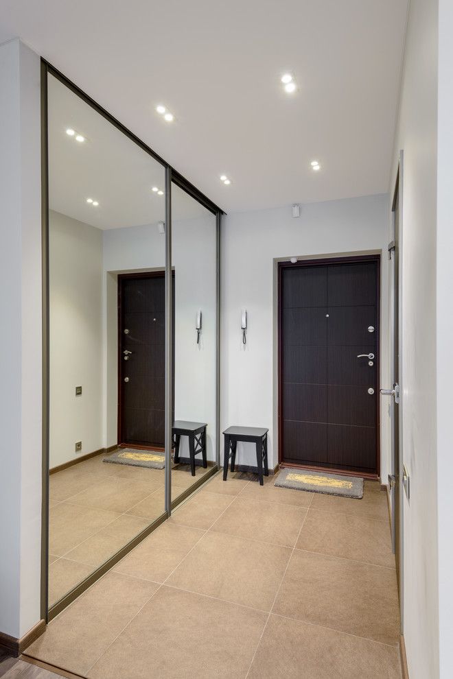 Você acha que corredores pequenos e desconfortáveis são difíceis de transformar em corredores funcionais? Eu vou compartilhar os segredos. Combine um pequeno corredor com uma cozinha ou um quarto (dependendo da localização).Por conveniência, uma área de entrada é organizada ao longo de uma parede. Instale um gabinete estreito e estreito, caixa de sapato, o topo do qual é usado como um assento. Sapatos e roupas para o uso diário se encaixam bem.
