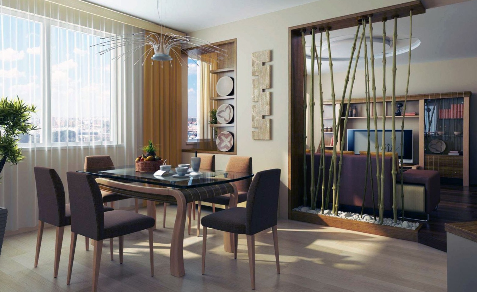 Frequentemente usado em pequenos espaços. Concisão, linhas claras, cores claras - características de estilo. Mas isso não significa que o interior seja entediante. Detalhes elegantes: decoração com papel de parede de bambu de uma ou parte da parede, introdução ao interior de pequenos elementos de cores naturais (vermelho, verde, marrom) vai fazer o truque.