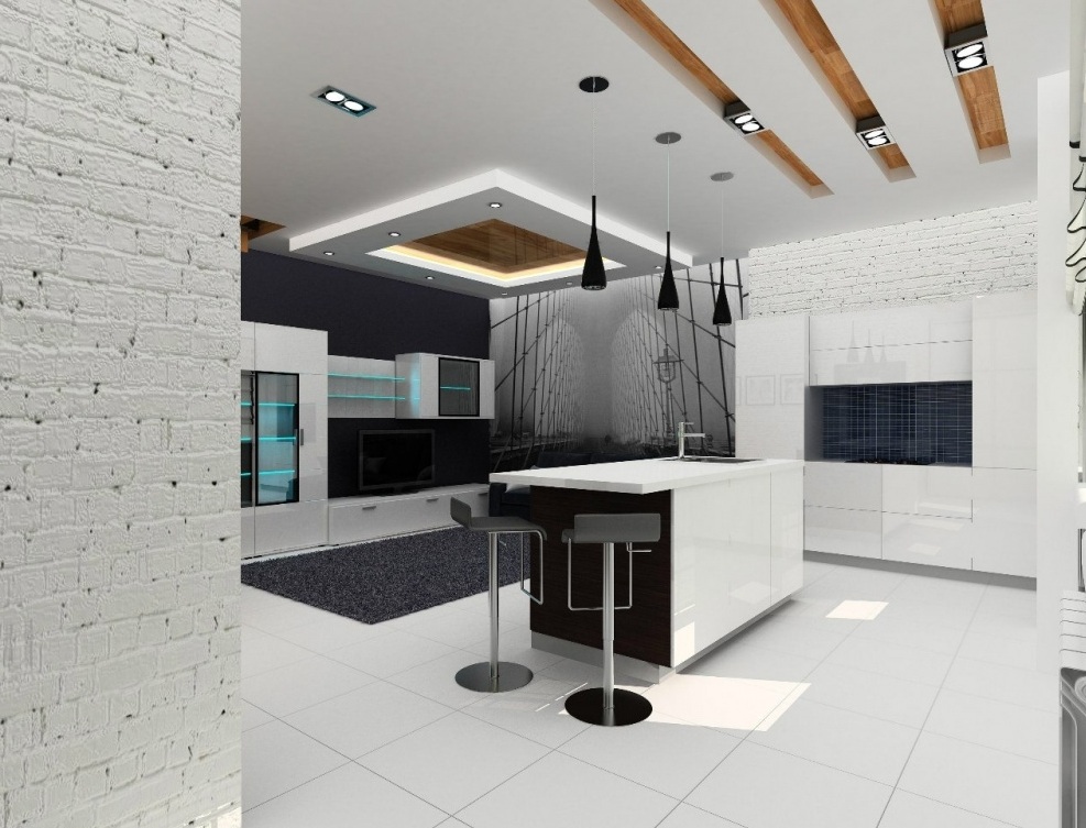 Opção maravilhosa tetos do estiramento. Montagem rápida, boa lavagem. A variedade é enorme. Estes não são apenas designs puros mate, brilhantes ou padronizados. A tecnologia moderna permite combinar materiais de diferentes texturas e cores. Isso ajuda a enfatizar o zoneamento, para complementar os materiais do acabamento da parede.