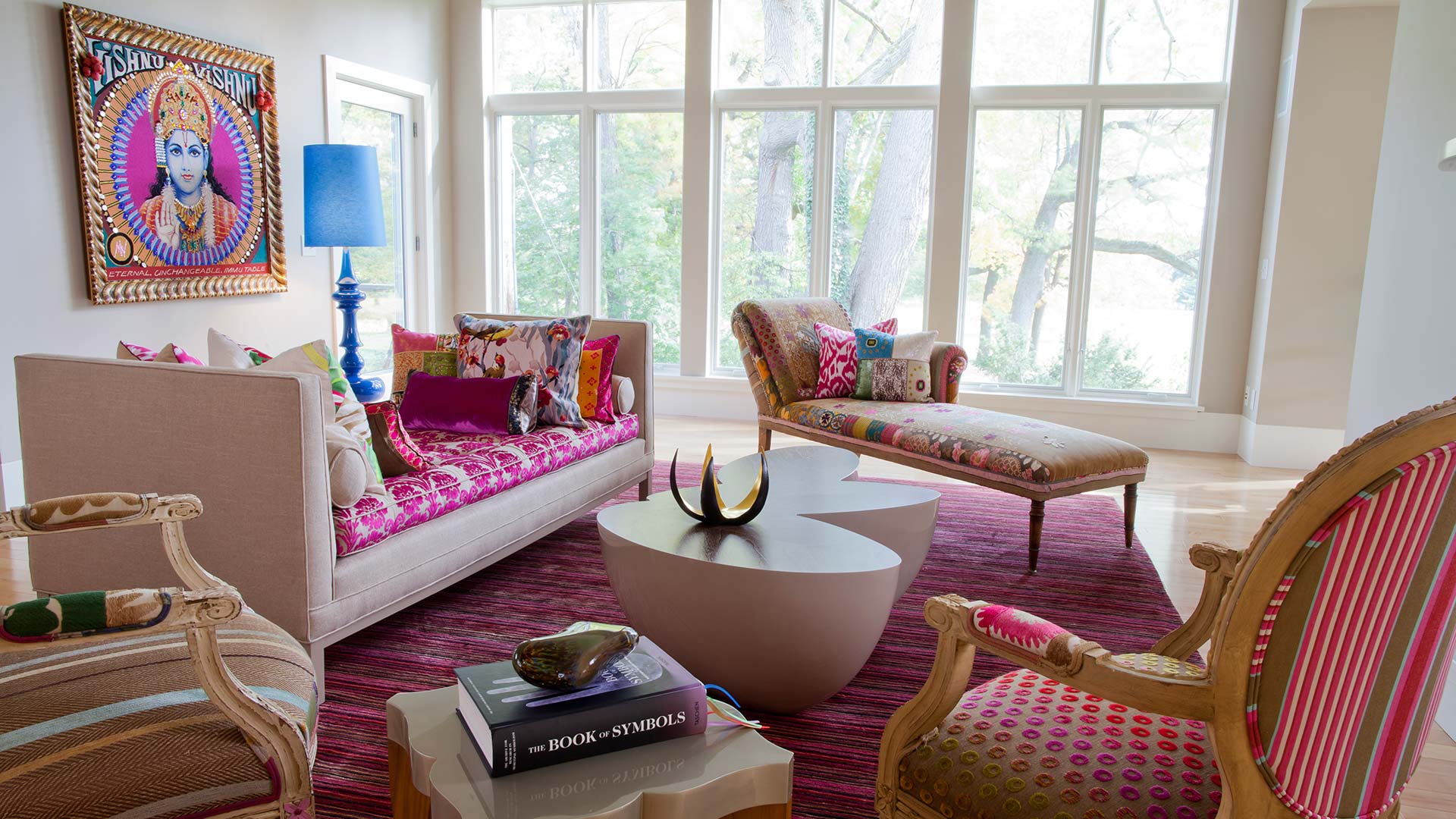 Os amantes de estilos orientais: indianos, chineses não devem entrar no interior de um grande número de elementos decorativos brilhantes. Almofadas suficientes, lâmpadas, vasos de chão e os acentos correspondentes são colocados.