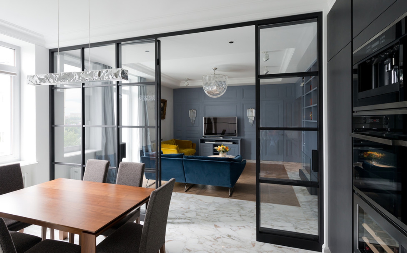 - Todas as portas devem ter inserções de vidro. Exceção: portas para o banheiro. Um efeito interessante é dado pelo jogo de contrastes: uma folha de porta leve com baguetes escuros para copos.