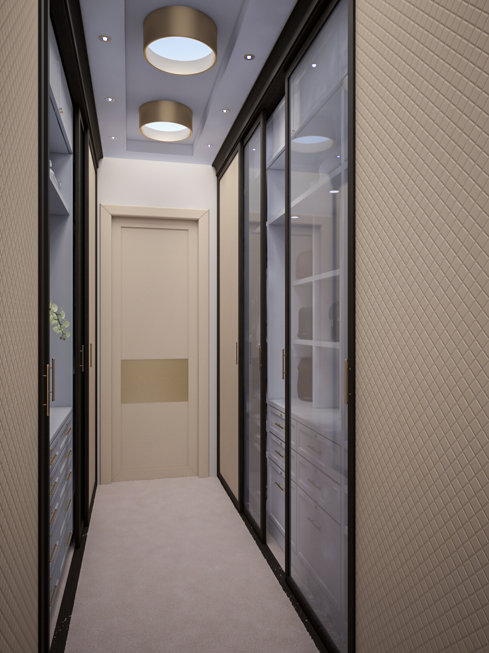 Envolva o mezanino, crie espaço de armazenamento para roupas e sapato em nichos e armazéns. Se o corredor permitir, peça um guarda-roupa estreito com suportes especiais para os tremfis localizados perpendicularmente às portas. Tais armários têm uma profundidade de apenas 35-40 cm.