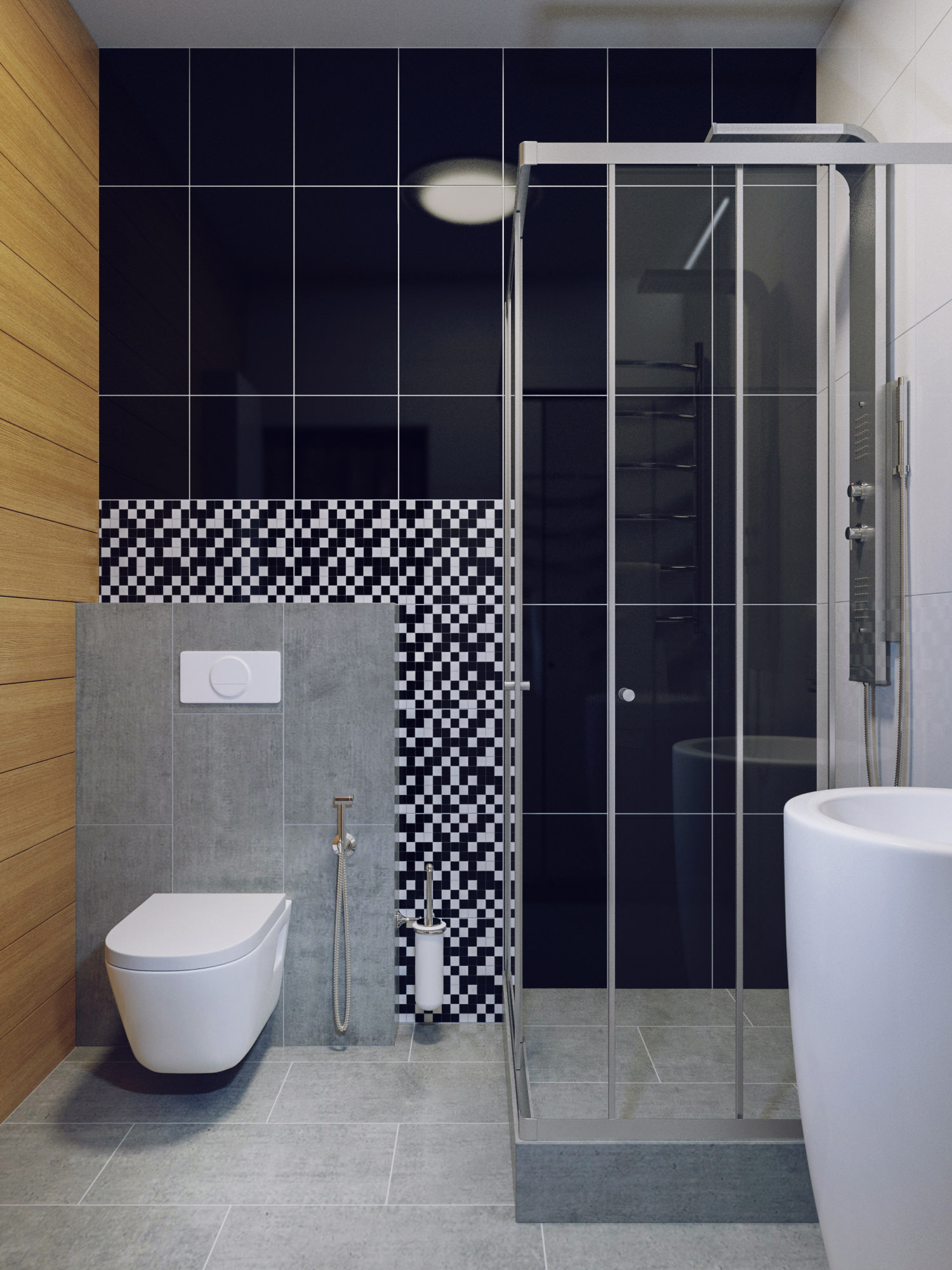 Pouco sobre segurança. Para sexo use uma telha especial com superfície antiderrapante. Luminárias de encanamento devem ser bem protegidas. Se a placa de gesso ou a comunicação plástica for costurada, instale as portas de revisão para acessar os tubos.