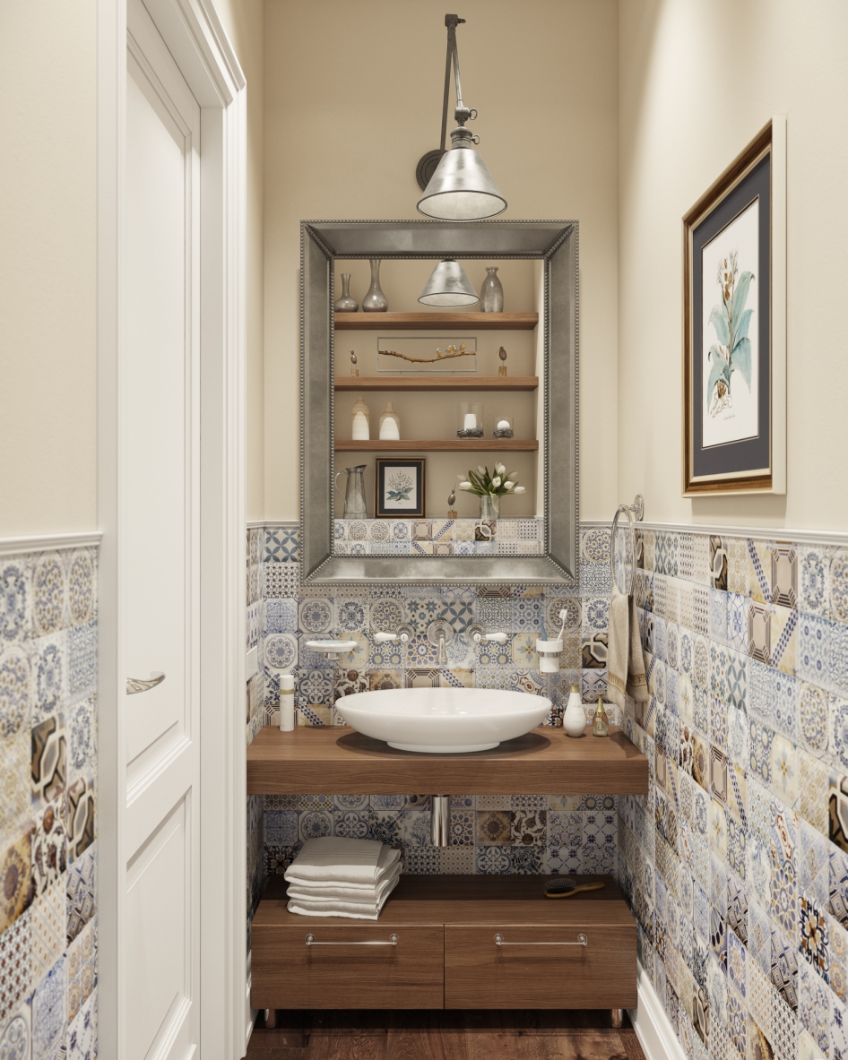Remova todos os itens pequenos nos armários. Não use o layout do fundo escuro da telha, parte superior da luz, este é o último século. Um efeito interessante é o uso de azulejos com um padrão em apenas uma parede (ao longo do banheiro ou dentro do box). Deixe as paredes restantes lisas. O espaço ficará elegante e se expandirá visualmente.
