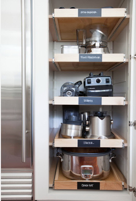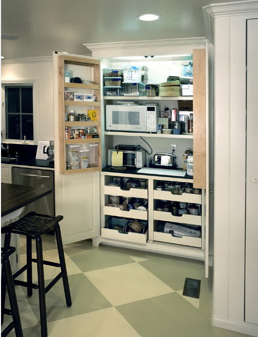 A principal coisa para eles é encontrar uma porta de armário interessante que esconda com segurança o dispositivo de olhares indiscretos. Este efeito torna a cozinha muito mais confortável e visualmente espaçosa.