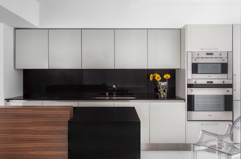 Ao projetar uma unidade de cozinha, é importante saber onde a pia será instalada. Geralmente um gabinete sob a pia montado no canto da sala. Entre ela e o fogão para deixar espaço sob a área de trabalho. O comprimento da seção na cozinha reta não deve exceder 2,5 metros. Se você quebrar essa regra, será difícil se mover entre as zonas, o que complicará o processo de cozimento.