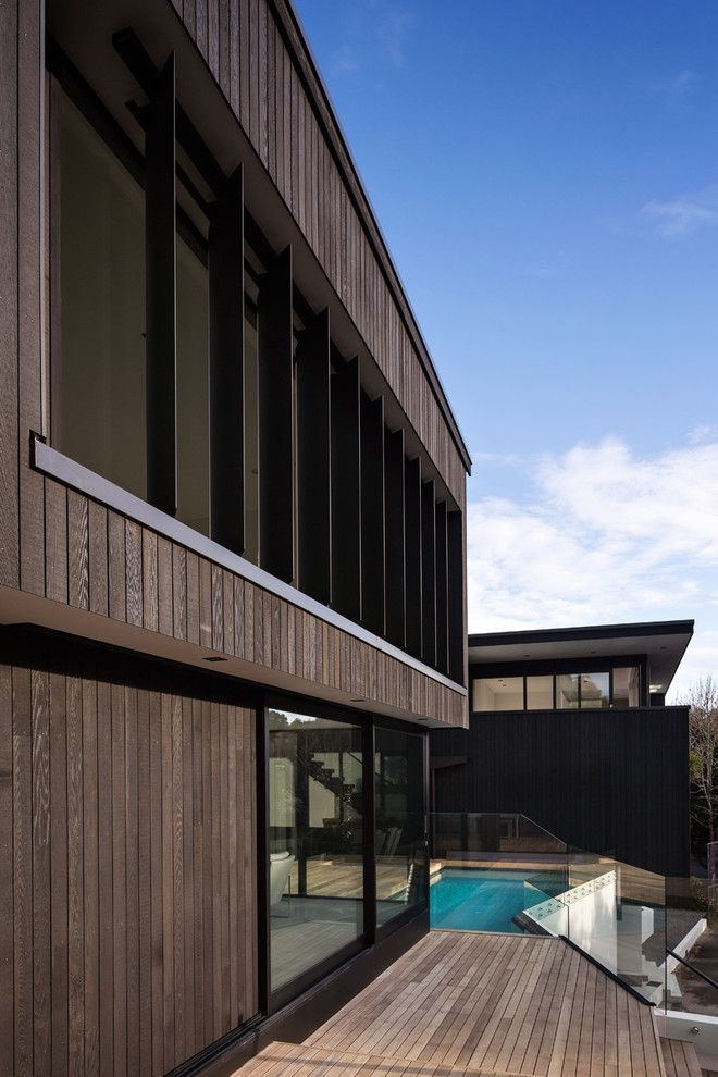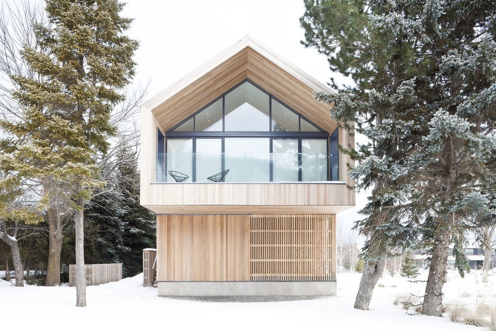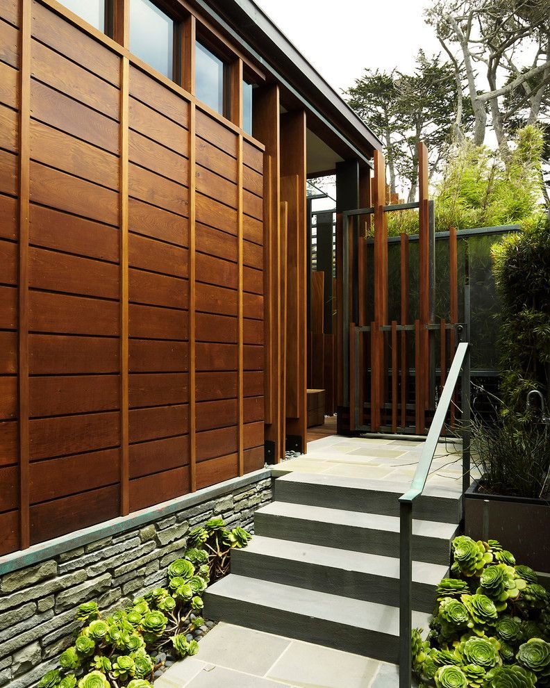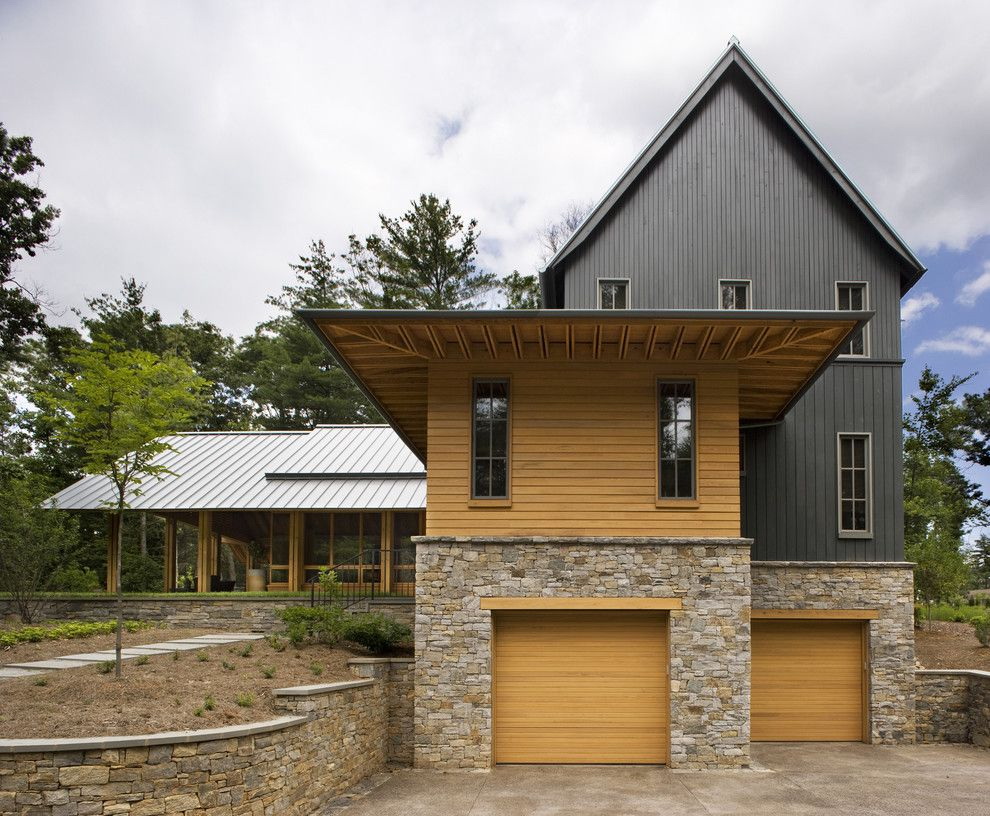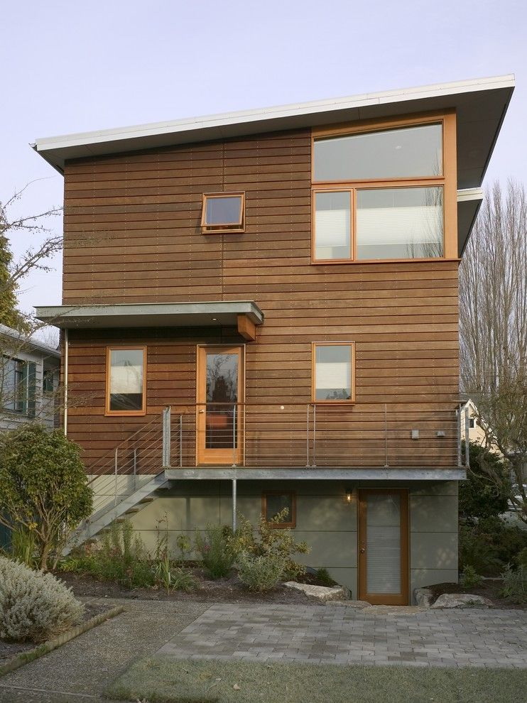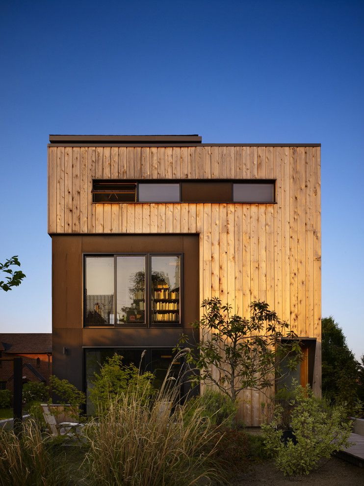 - A combinação de madeira com gesso. A fachada pode ser revestida com diferentes acabamentos. Por exemplo, painéis adequados com uma camada de gesso. Acontece uma casa com linhas suaves, elegantes e rigorosas. Sua altura aumentará visualmente devido ao ornamento "listrado".