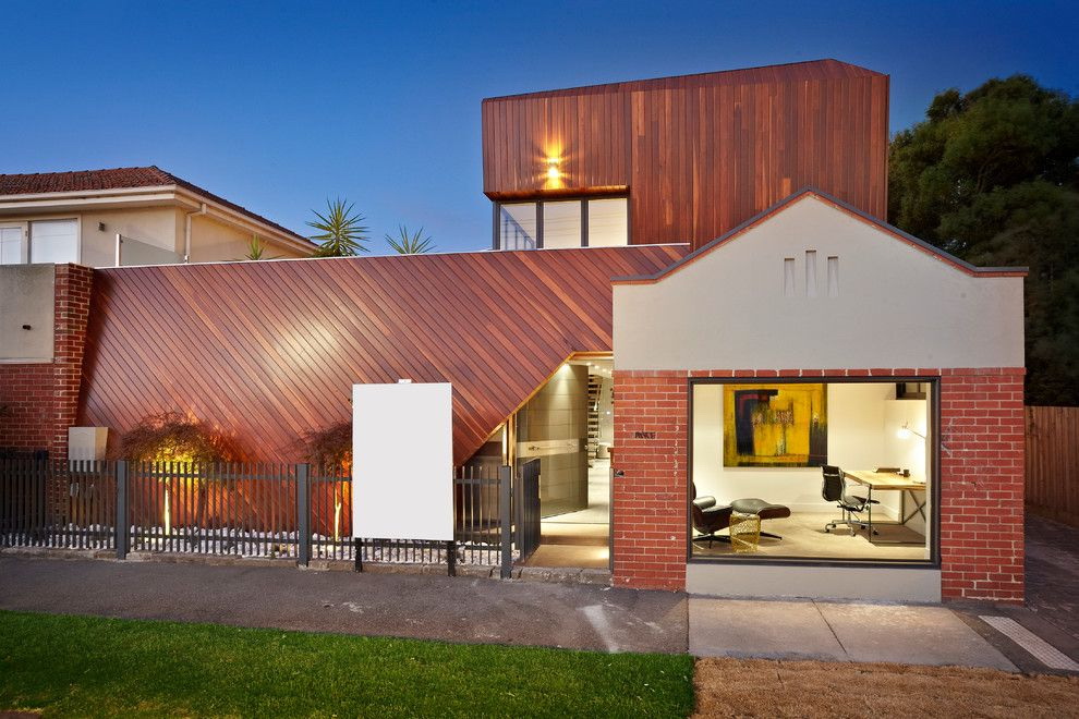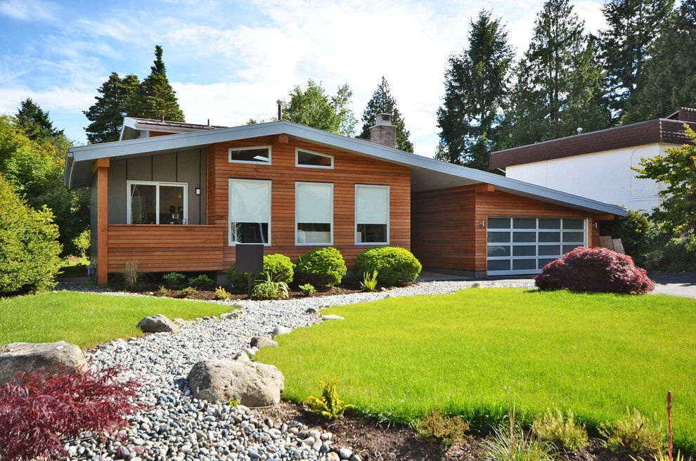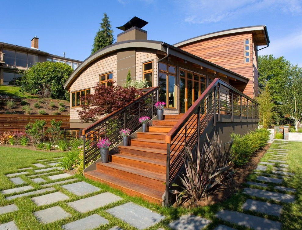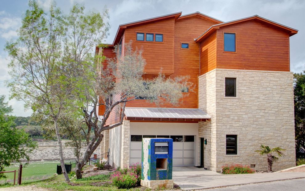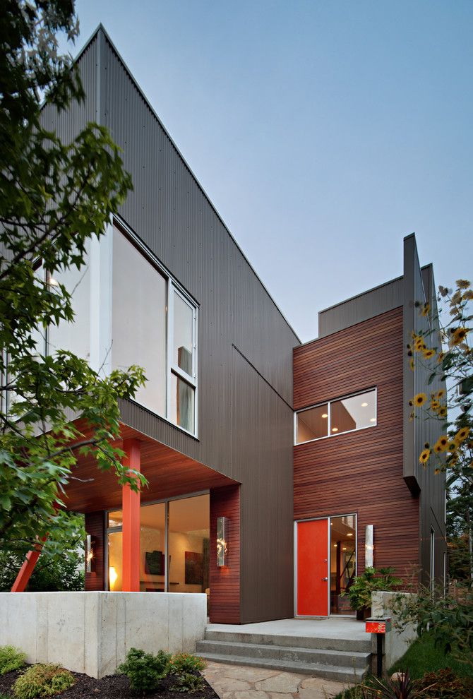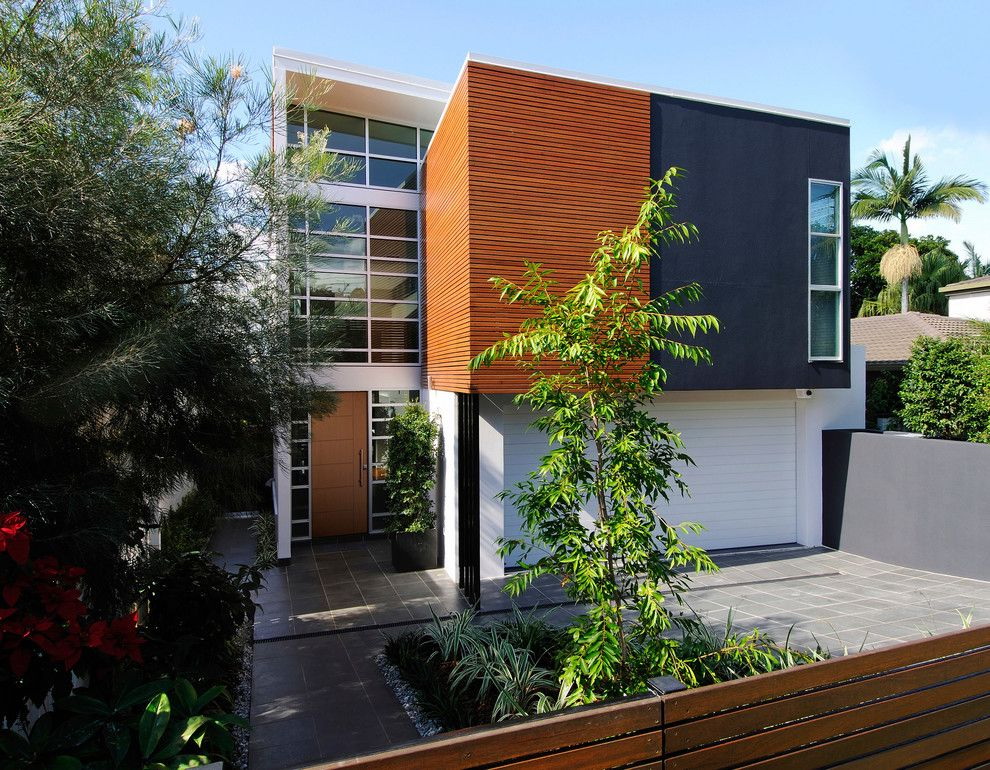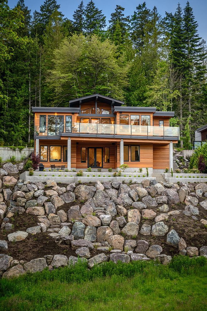 - A combinação de madeira com gesso. A fachada pode ser revestida com diferentes acabamentos. Por exemplo, painéis adequados com uma camada de gesso. Acontece uma casa com linhas suaves, elegantes e rigorosas. Sua altura aumentará visualmente devido ao ornamento "listrado".