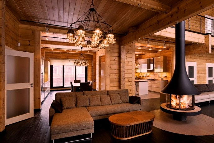 Agora painéis de madeira permitem que você crie uma sala de design no estilo de um bangalô, um chalé para caçadores, conhecedores da natureza selvagem. Tal material permite o uso de estilos etnográficos, hoje particularmente populares. Guarnição de madeira cria uma atmosfera de conforto, conforto, faz com que o interior contido e discreto.