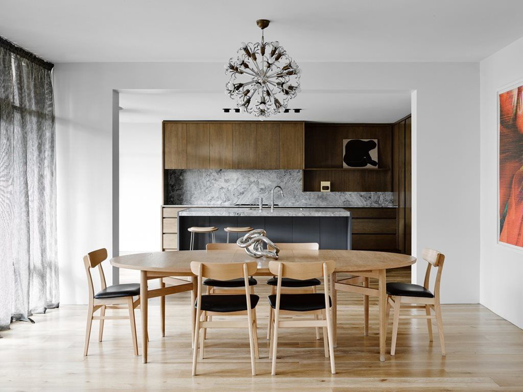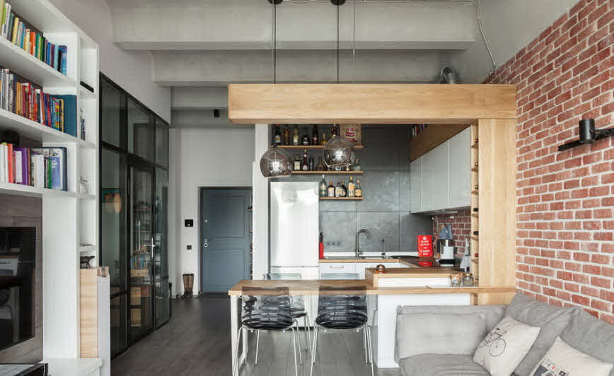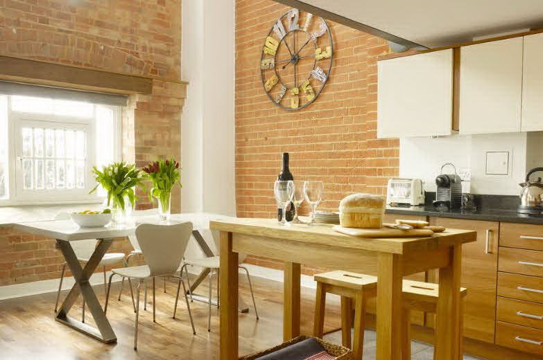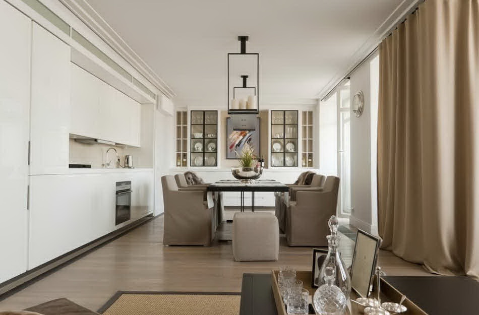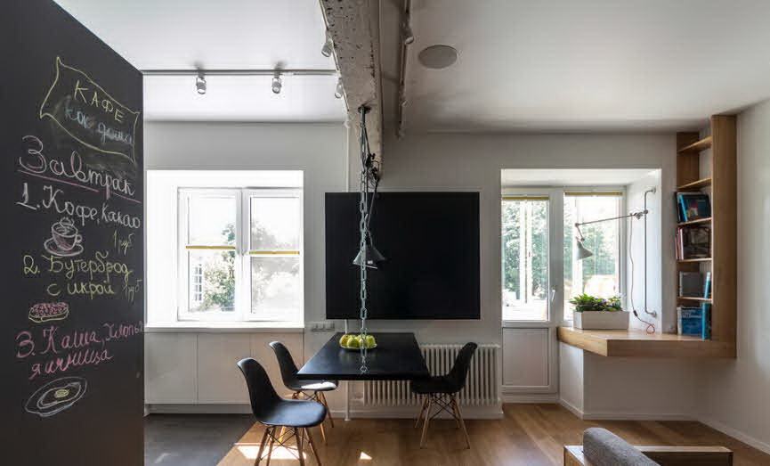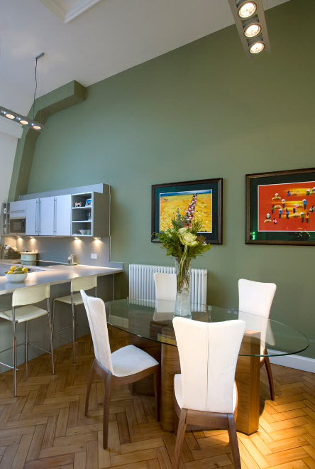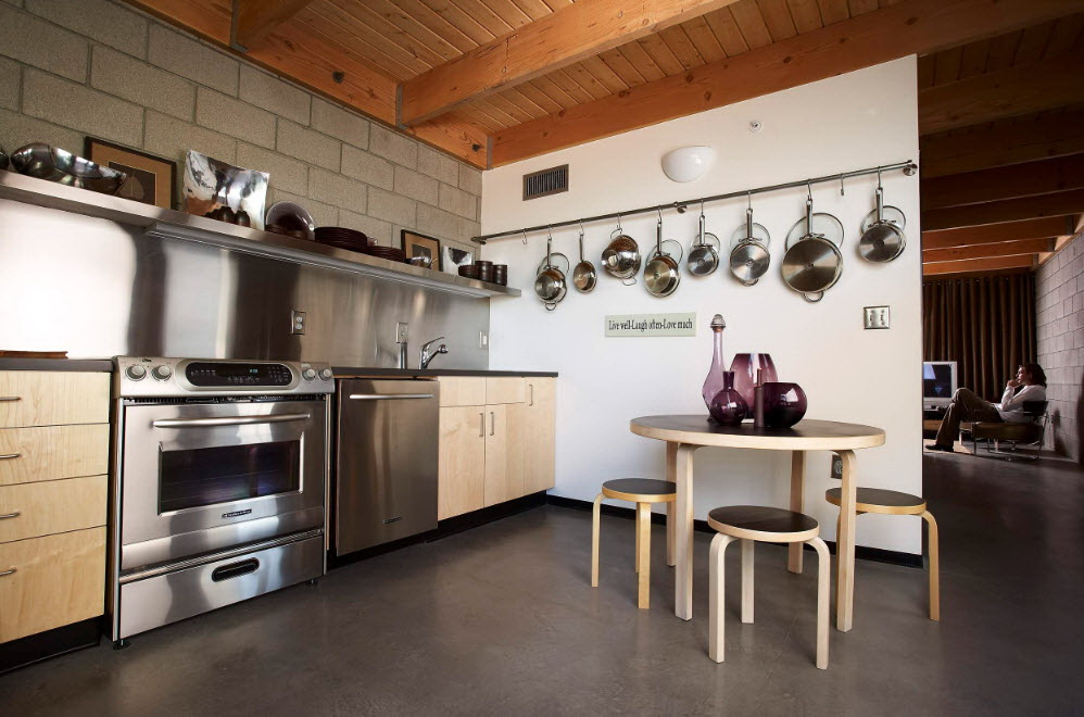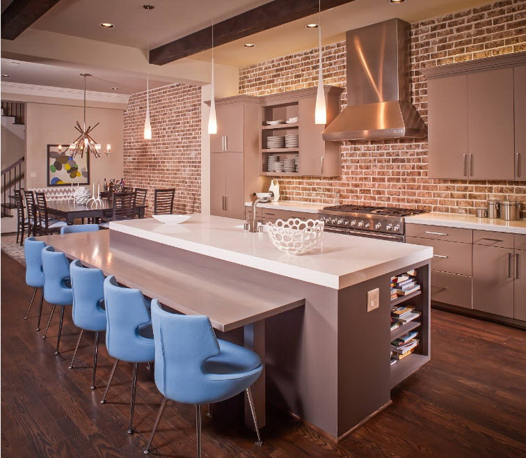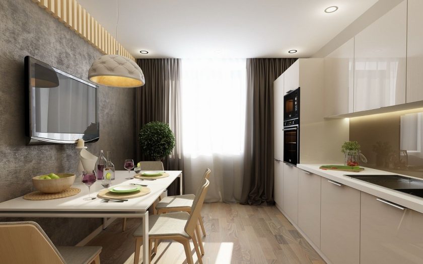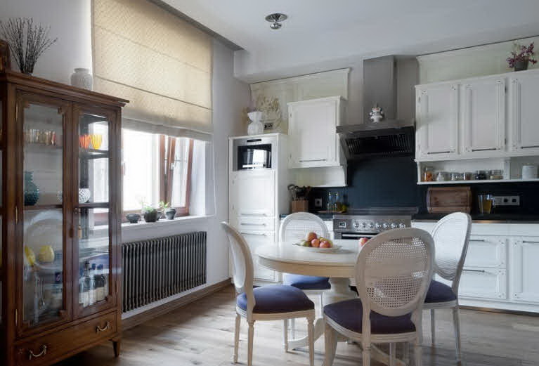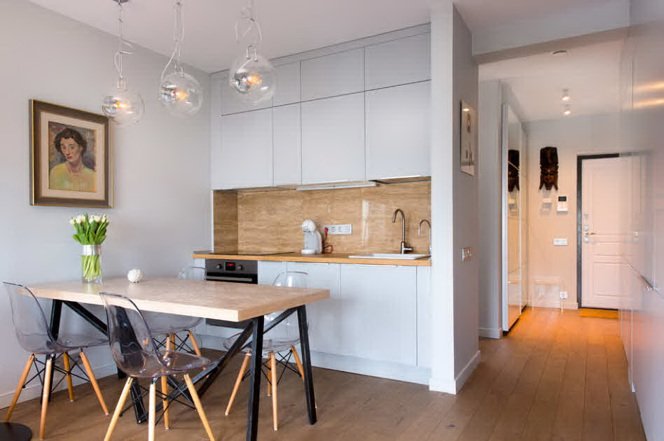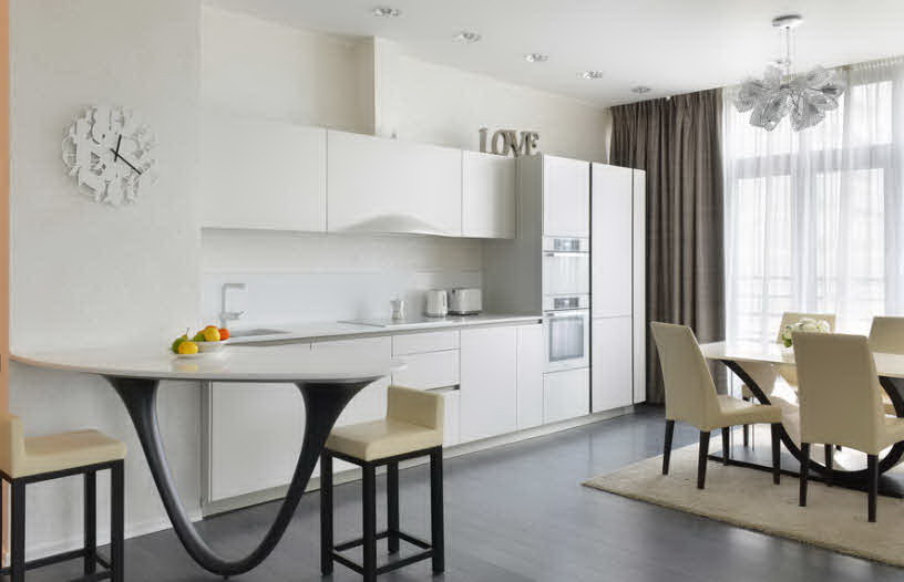 Tendo entendido os materiais, resta apenas combiná-los corretamente - levando em conta o fato de que qualquer cozinha é geralmente dividida em duas zonas, trabalhando e jantando. O material para a área de trabalho deve ser o mais resistente possível, facilitando o material para a sala de jantar.