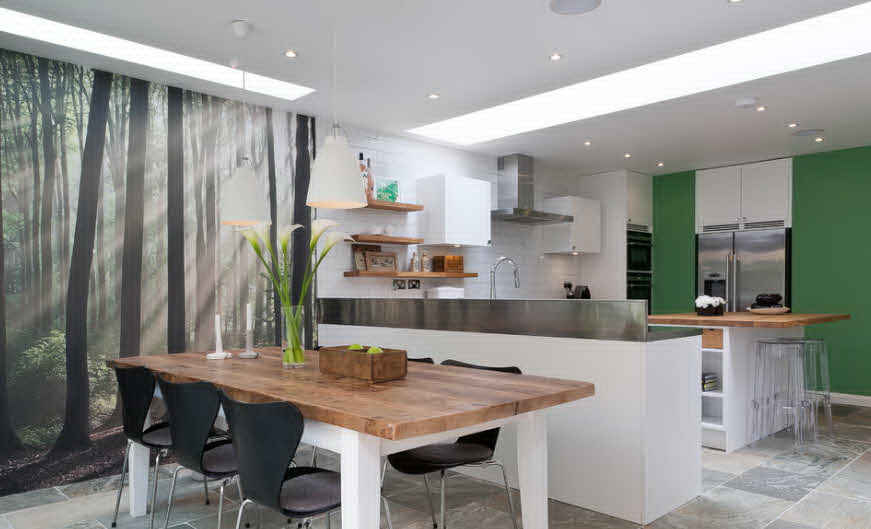 Para colocar tal necessidade na área da placa, ou acima da bateria, para que haja espaço para mudanças. Mas, em geral - a cozinha é um lugar onde a temperatura muda constantemente e os papéis de parede ao vivo podem atingir todo o seu potencial.