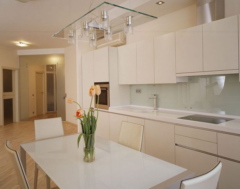 - Variedade Às vezes, vidro colorido, espelho, fosco, transparente, translúcido. Além disso, pode ser personalizado para colorir como você gosta, recebendo uma foto ou desenho que tornará a cozinha única.