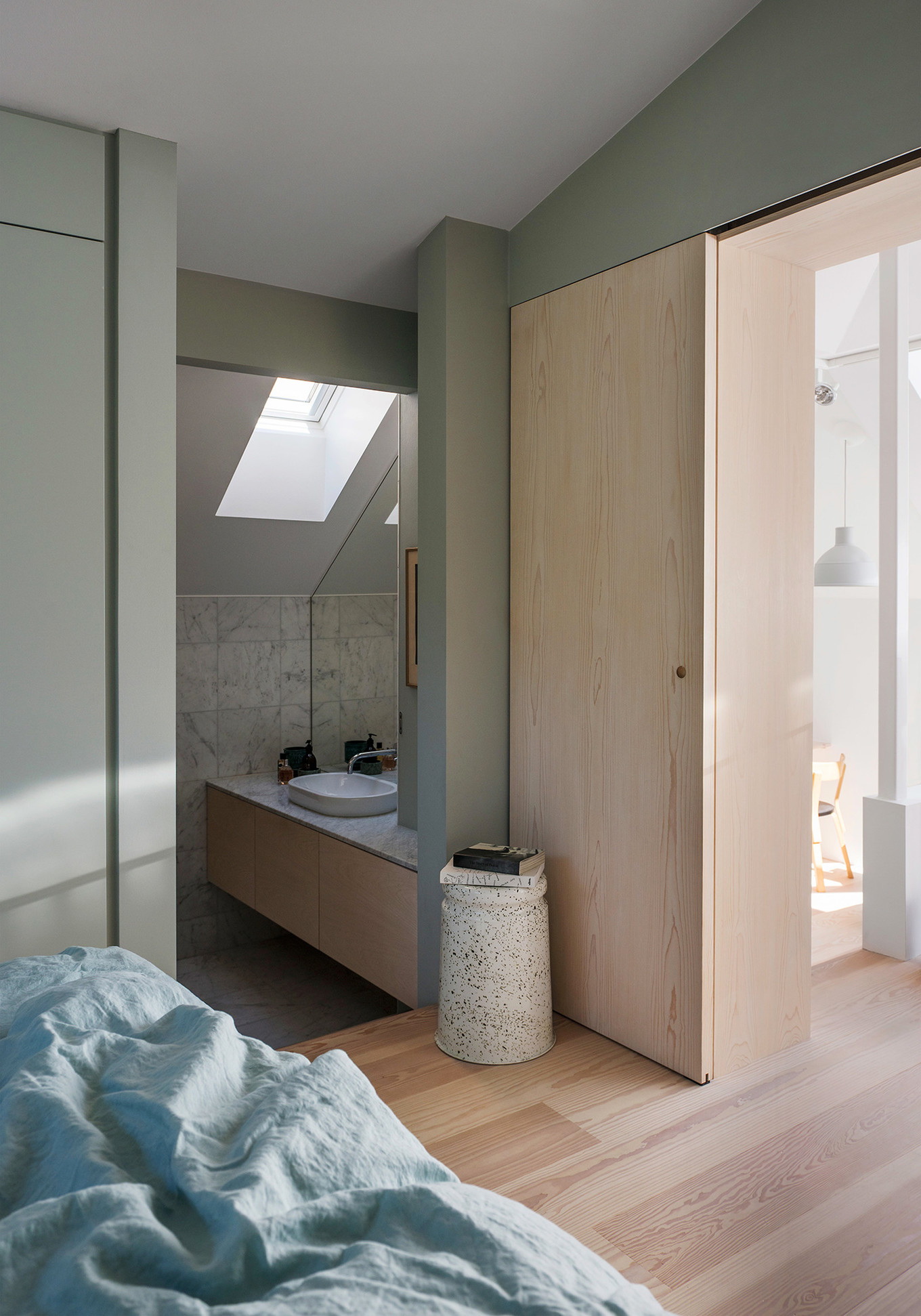 Bancadas de canto, banheiras e prateleiras em combinação com um design de luz calma são usados para expandir os quartos.