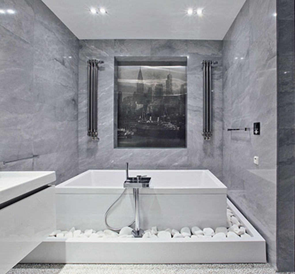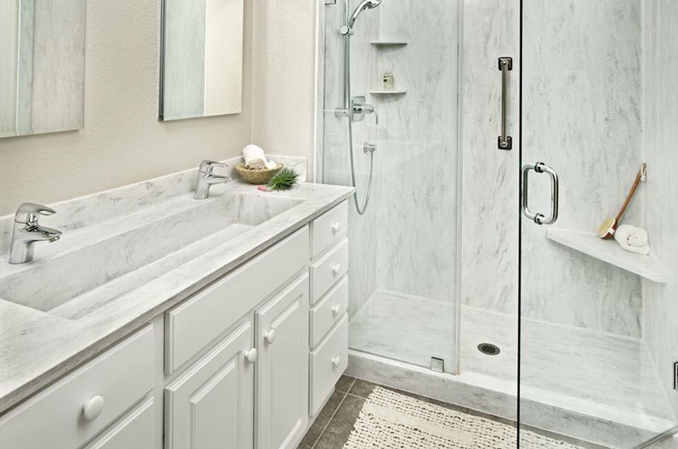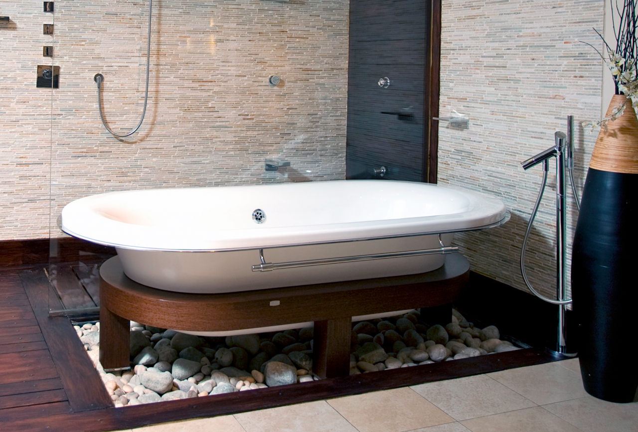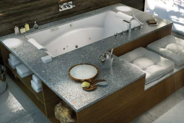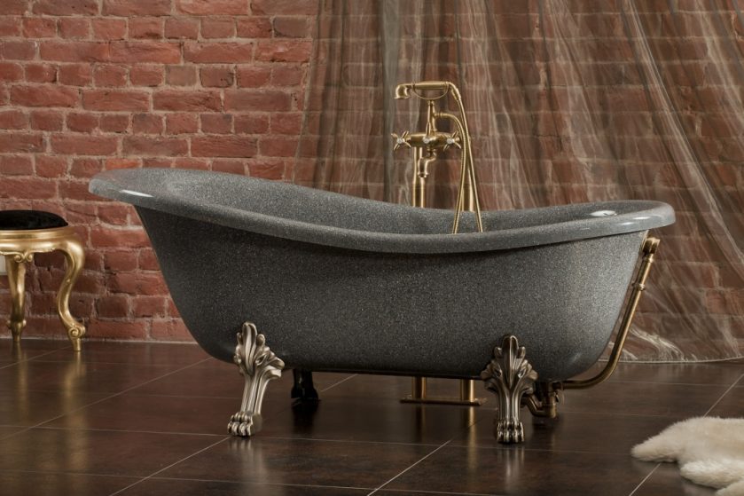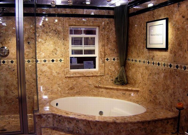 O maior item no banheiro é o banho em si. Mesmo esse atributo pode ser feito de pedra artificial.