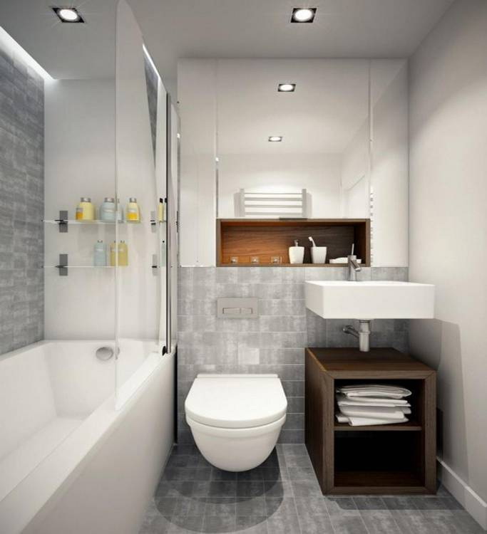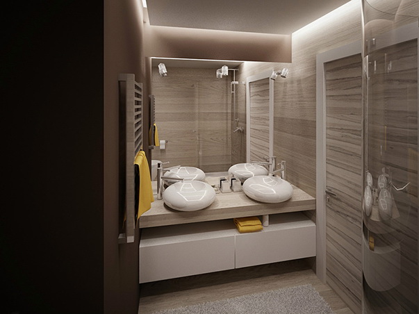 - Aumentar o número de fontes de luz. Mesmo tons claros de luz refletem a luz e reduzem o grau de iluminação do banheiro. Portanto, a luz deve ser adicionada.