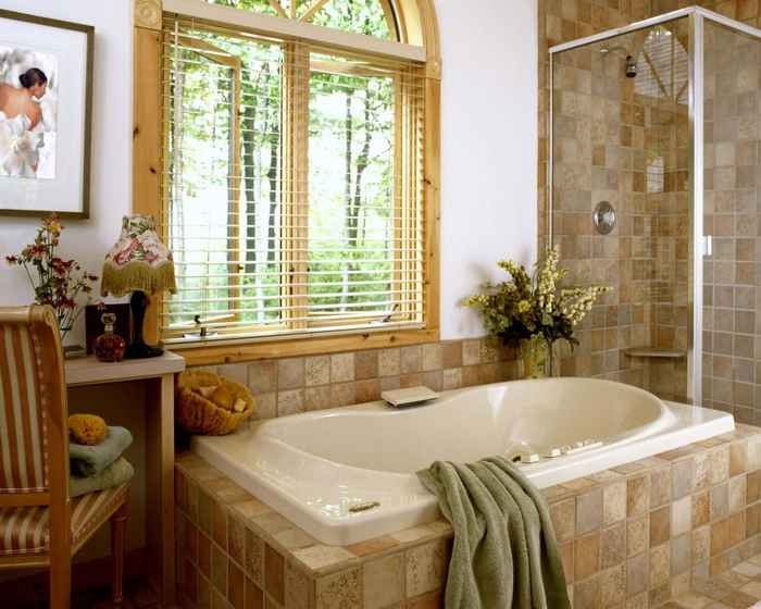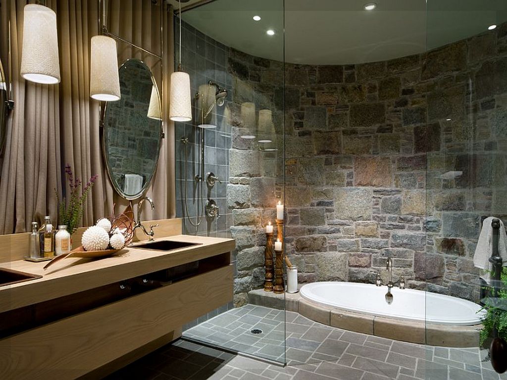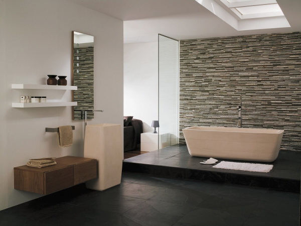 - Imitação de pedra natural em perfeita harmonia com superfícies de madeira.Mas ao escolher tal acabamento para o banheiro, você precisa tomar cuidado para que a madeira tenha uma impregnação especial com proteção contra a água.