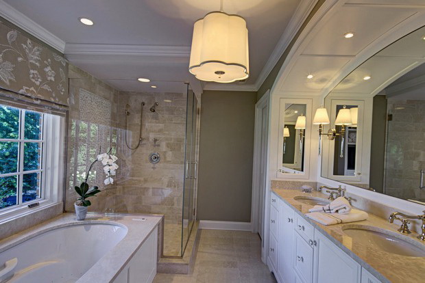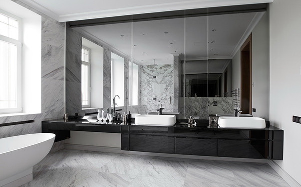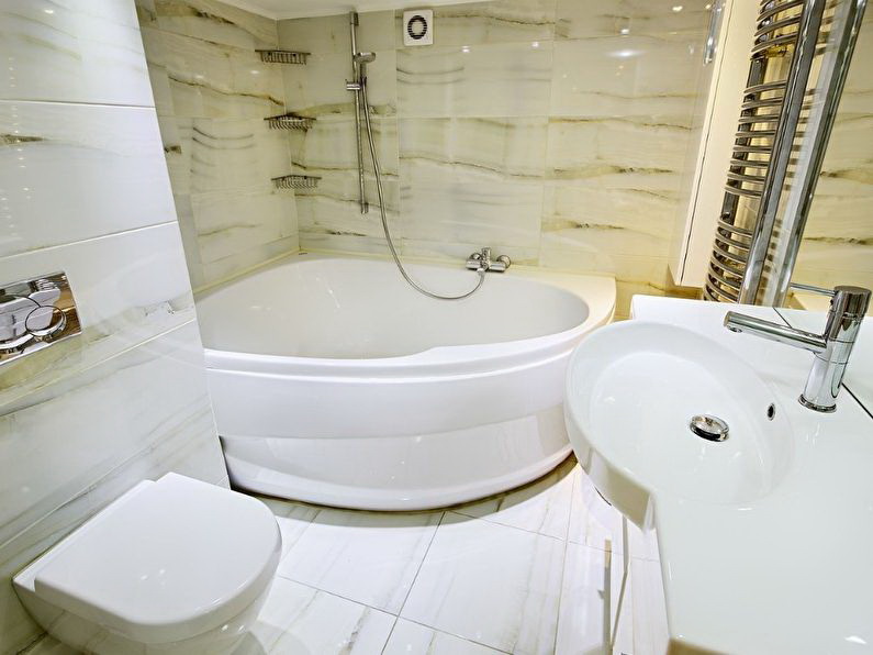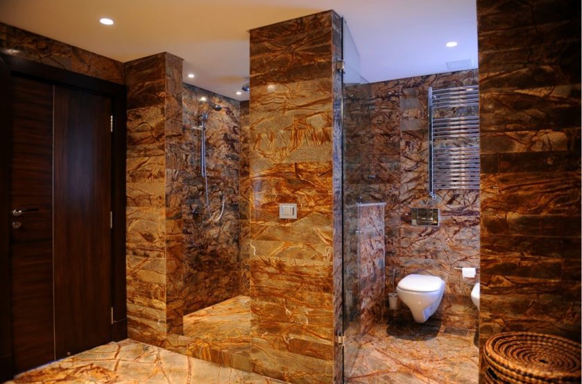 Apartamentos reais de luxo no banheiro podem ser feitos usando mármore ou granito de alvenaria. Escolha para isso você precisa de um azulejo de tons neutros ou tons pastel.