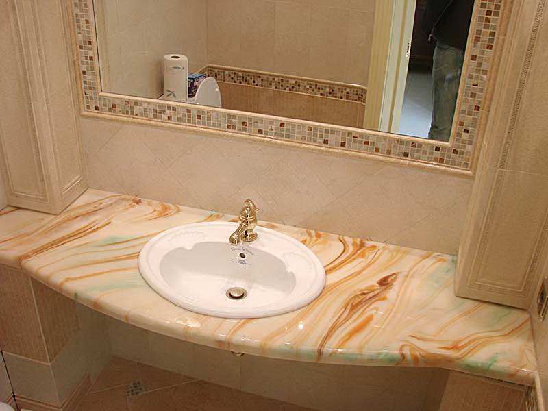 - Pedra acrílica - o material mais adequado para criar bancadas para o banheiro. Este material é baseado em resinas acrílicas com a adição de pigmentos e cargas minerais. Ele pode ser usado para criar designs perfeitos de qualquer forma com uma superfície lisa e sem poros.