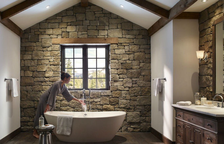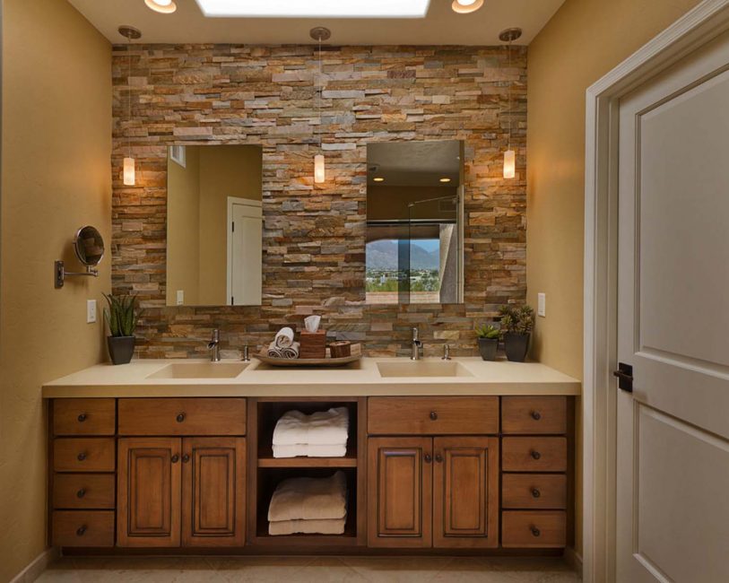 Decoração de casa de banho com pedra artificial - uma nova alternativa original aos habituais azulejos. A superfície, aparada com pedra, sempre parece luxuosa, rica e elegante. Além disso, o material protege a sala de forma confiável contra a aparência de umidade e mofo. O melhor lugar para acomodar esse material seria um banheiro ou um banheiro combinado.