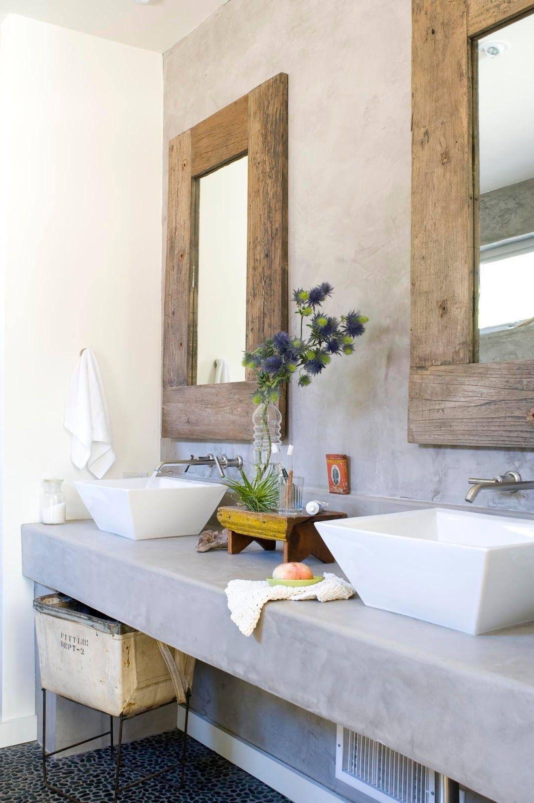 - A escolha da gama de cimento no acabamento da casa de banho torna o ambiente desta sala masculino e brutal. Este design com a localização de um grande espelho e detalhes que combinam com o tom da cor principal, mais parecido com o estilo minimalismo.