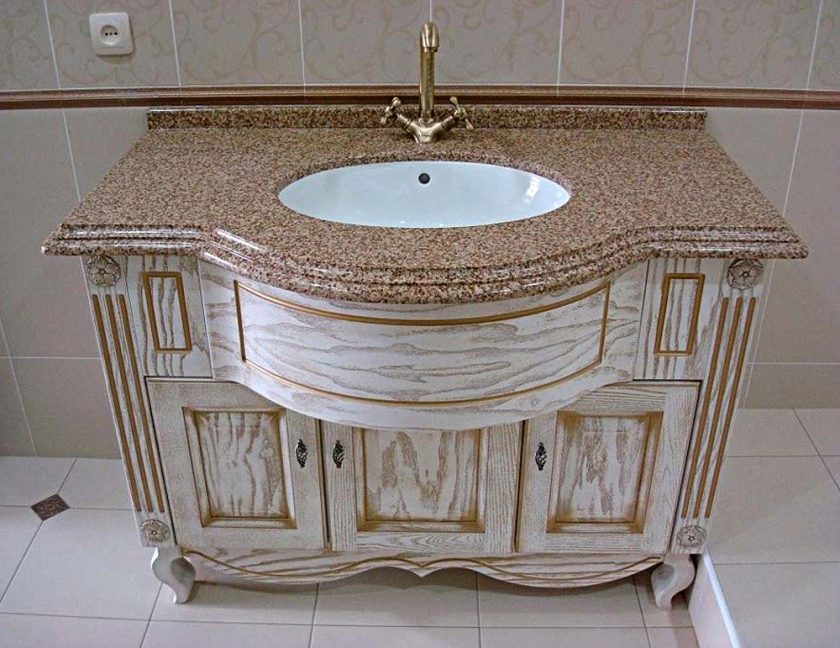 - Plano sólido de nível único, adequado para armazenamento conveniente de vários itens no banheiro. Pode conter um suplemento na forma de suportes, ganchos. O lavatório nesta variedade é como se estivesse afogado nele.