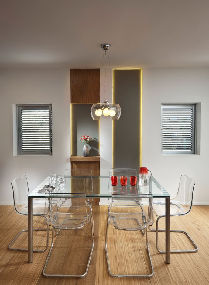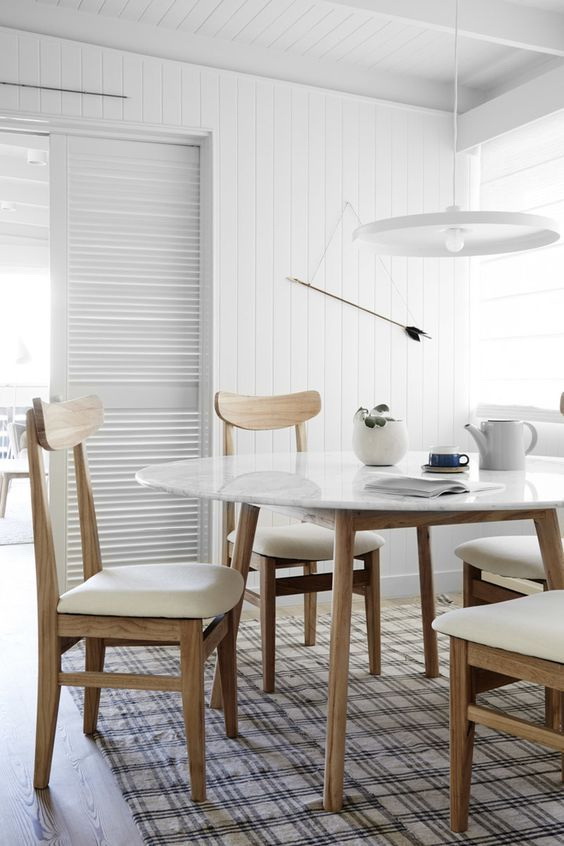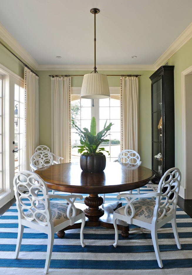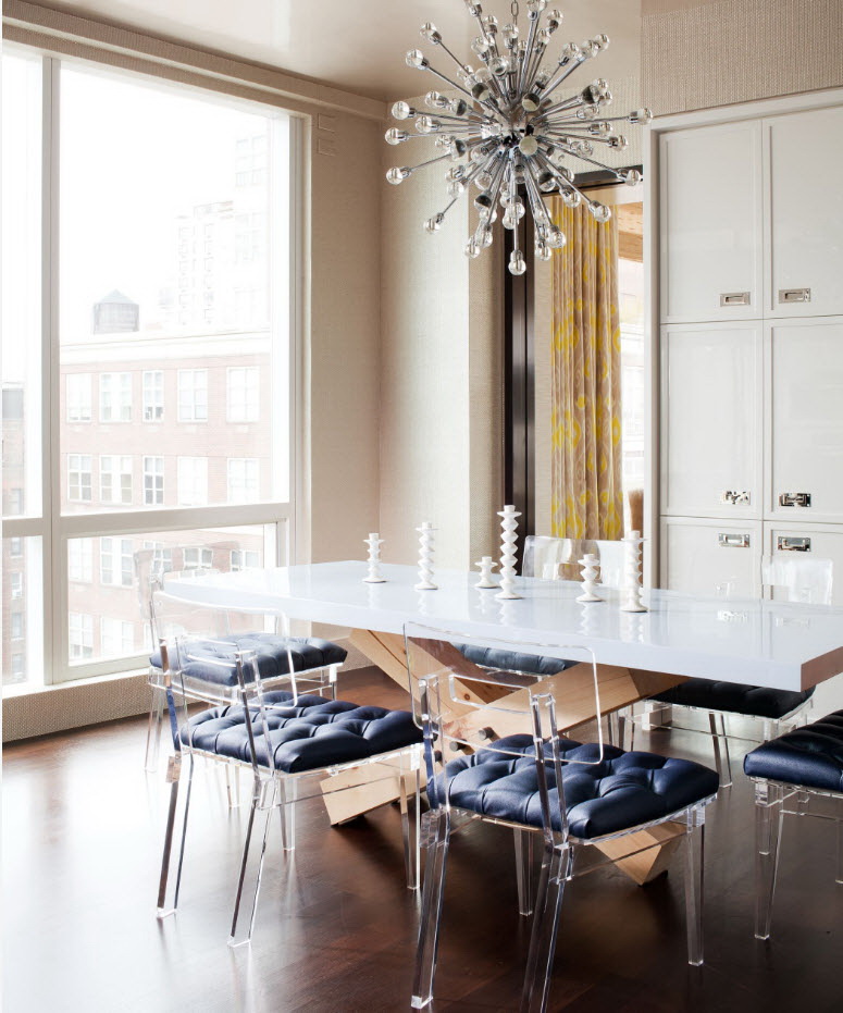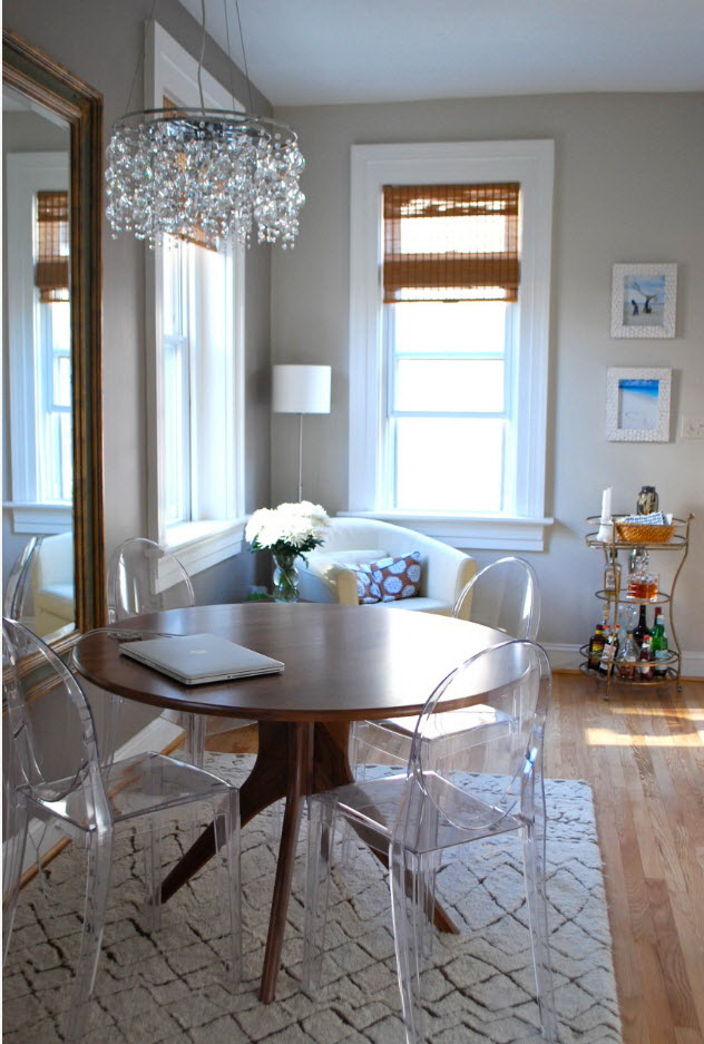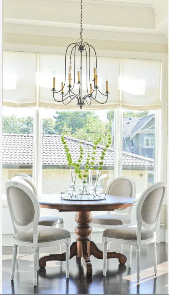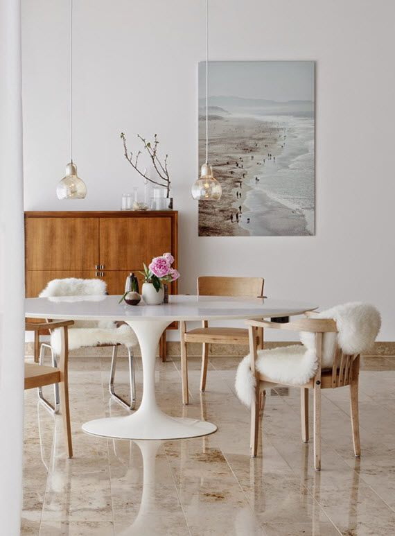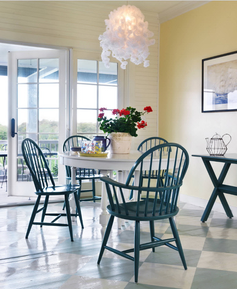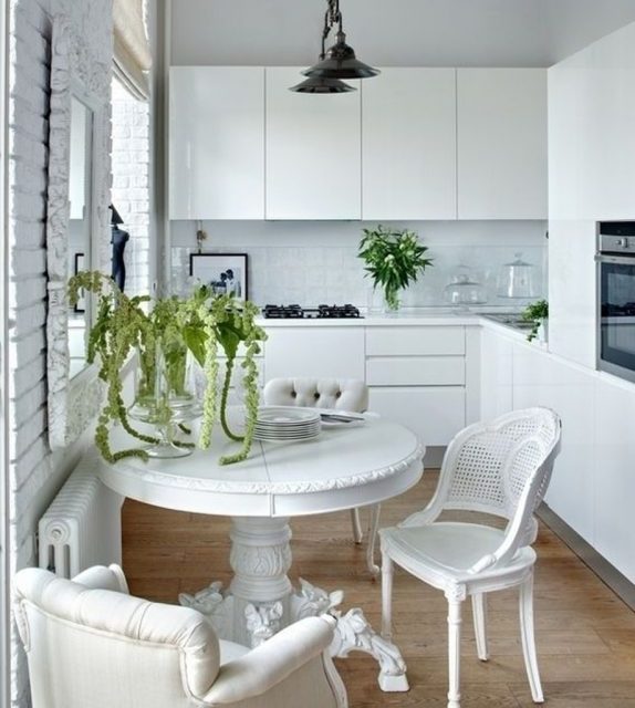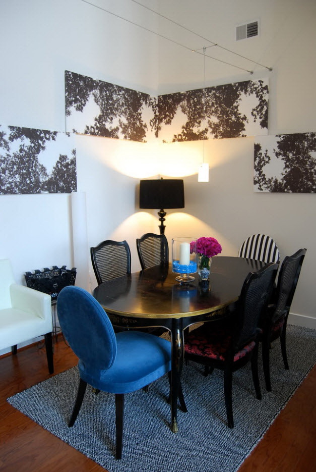 - os objetos têm diferentes tonalidades, harmoniosamente combinados entre si (mesa branca / cadeiras azul-claras, castanho mesa /bege cadeiras). É importante que o esquema de cores se encaixe no interior;