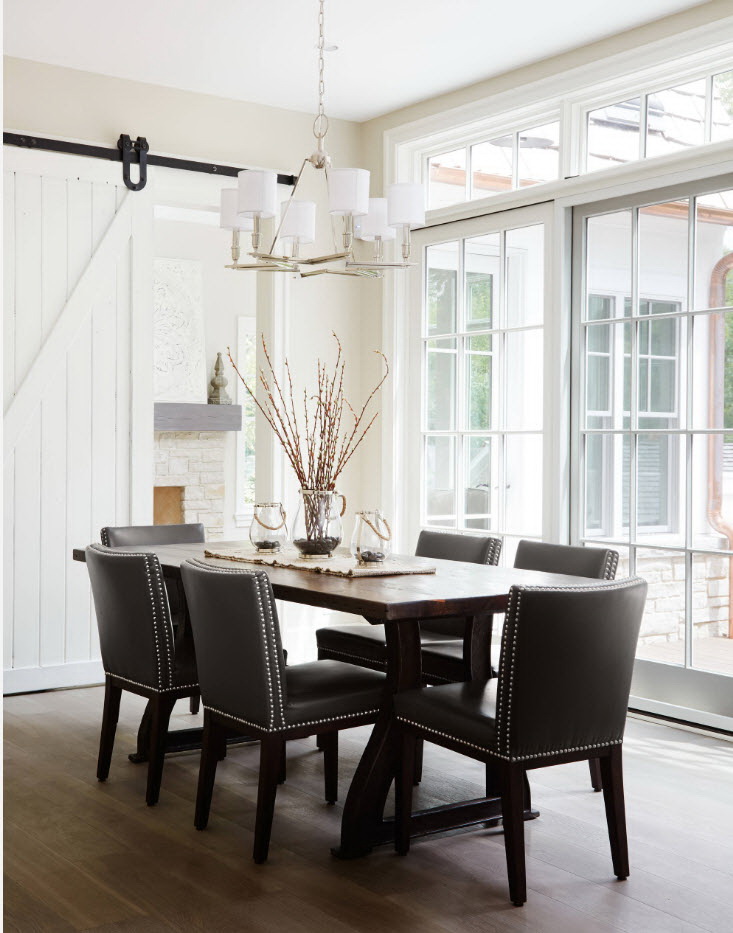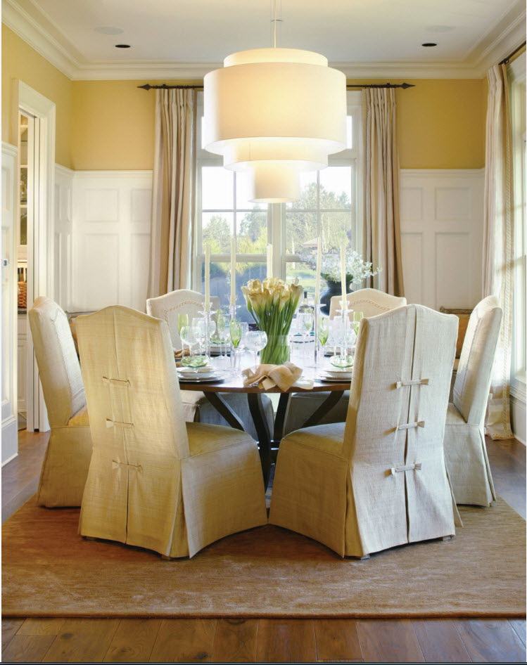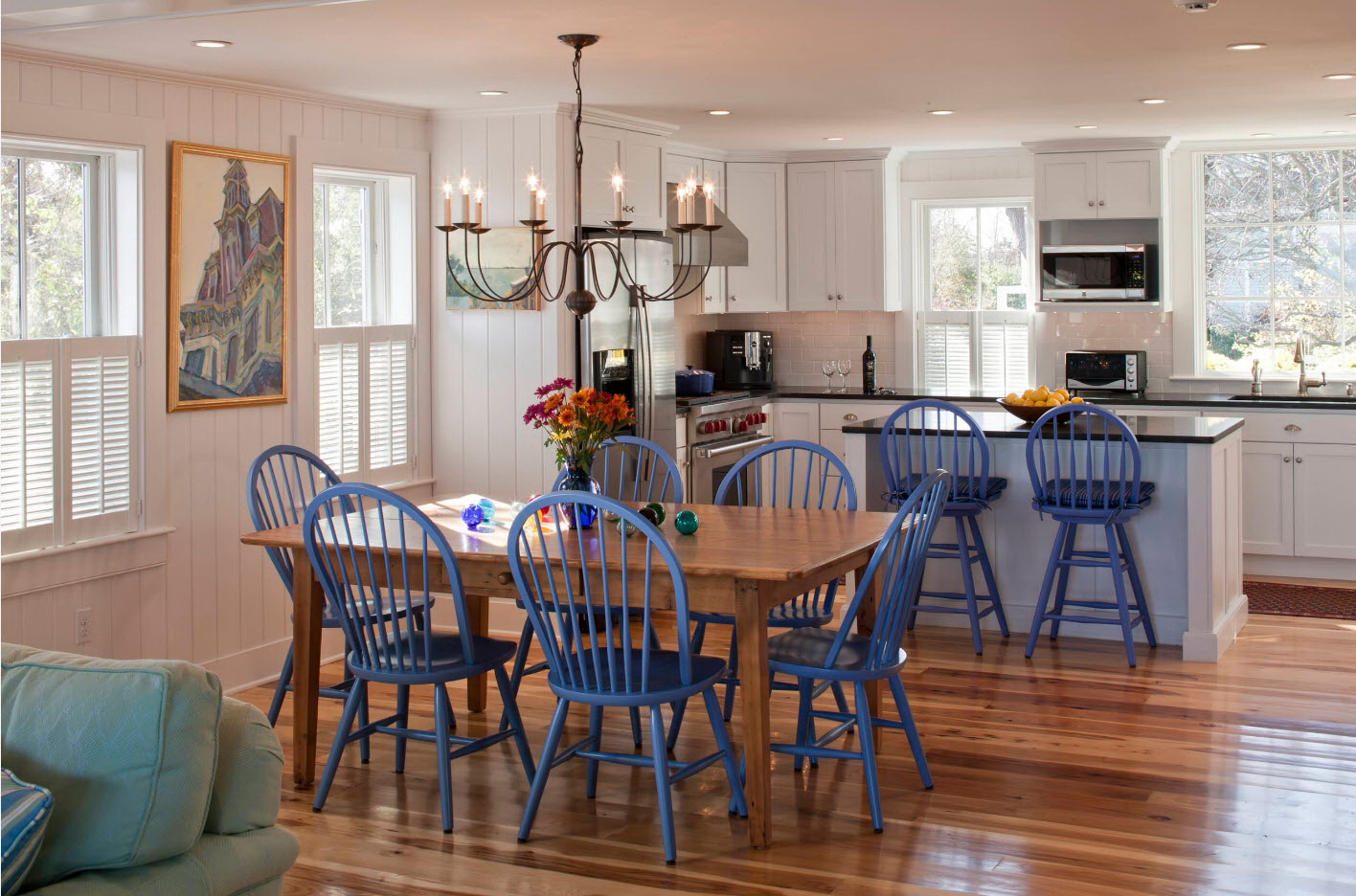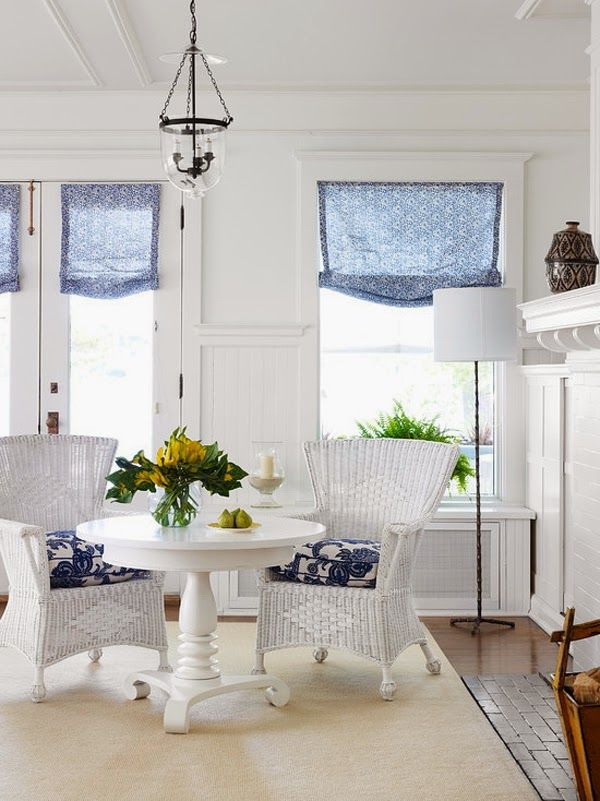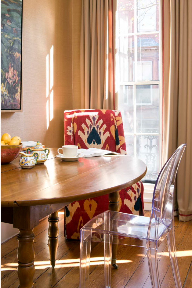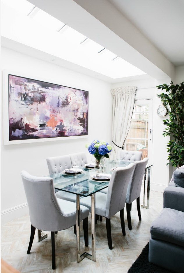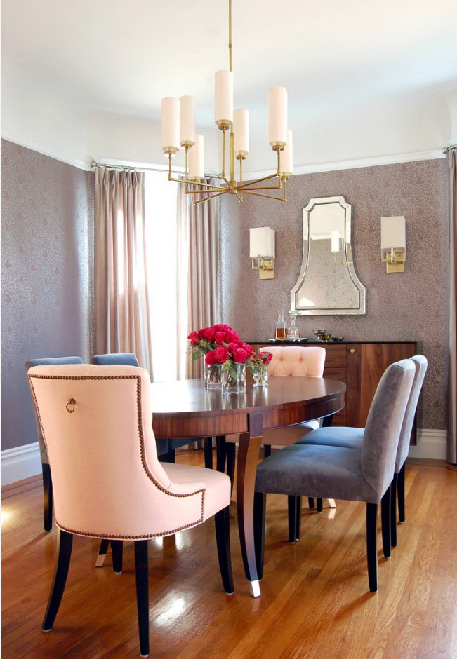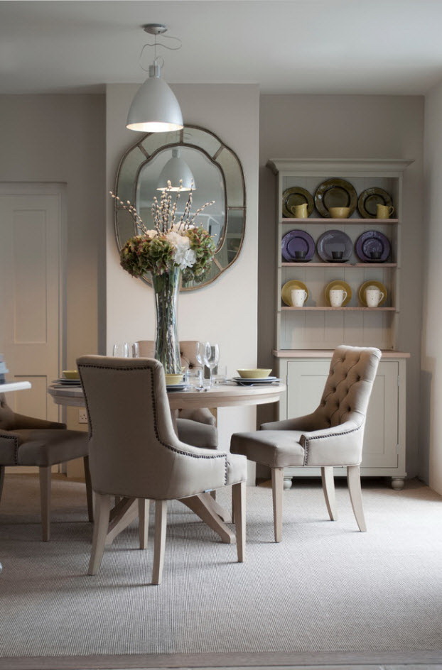 - os objetos têm diferentes tonalidades, harmoniosamente combinados entre si (mesa branca / cadeiras azul-claras, castanho mesa /bege cadeiras). É importante que o esquema de cores se encaixe no interior;
