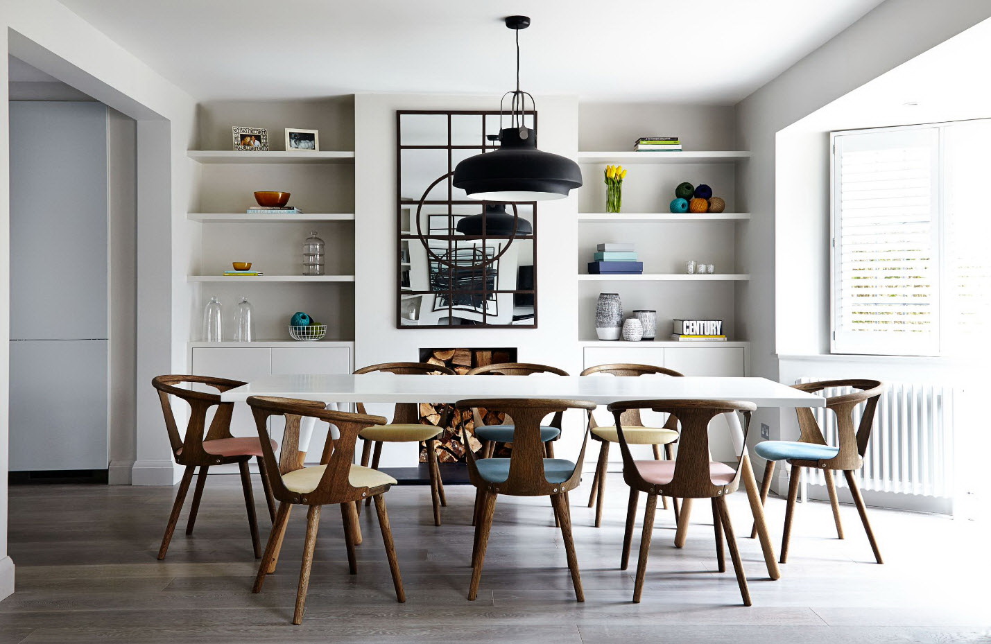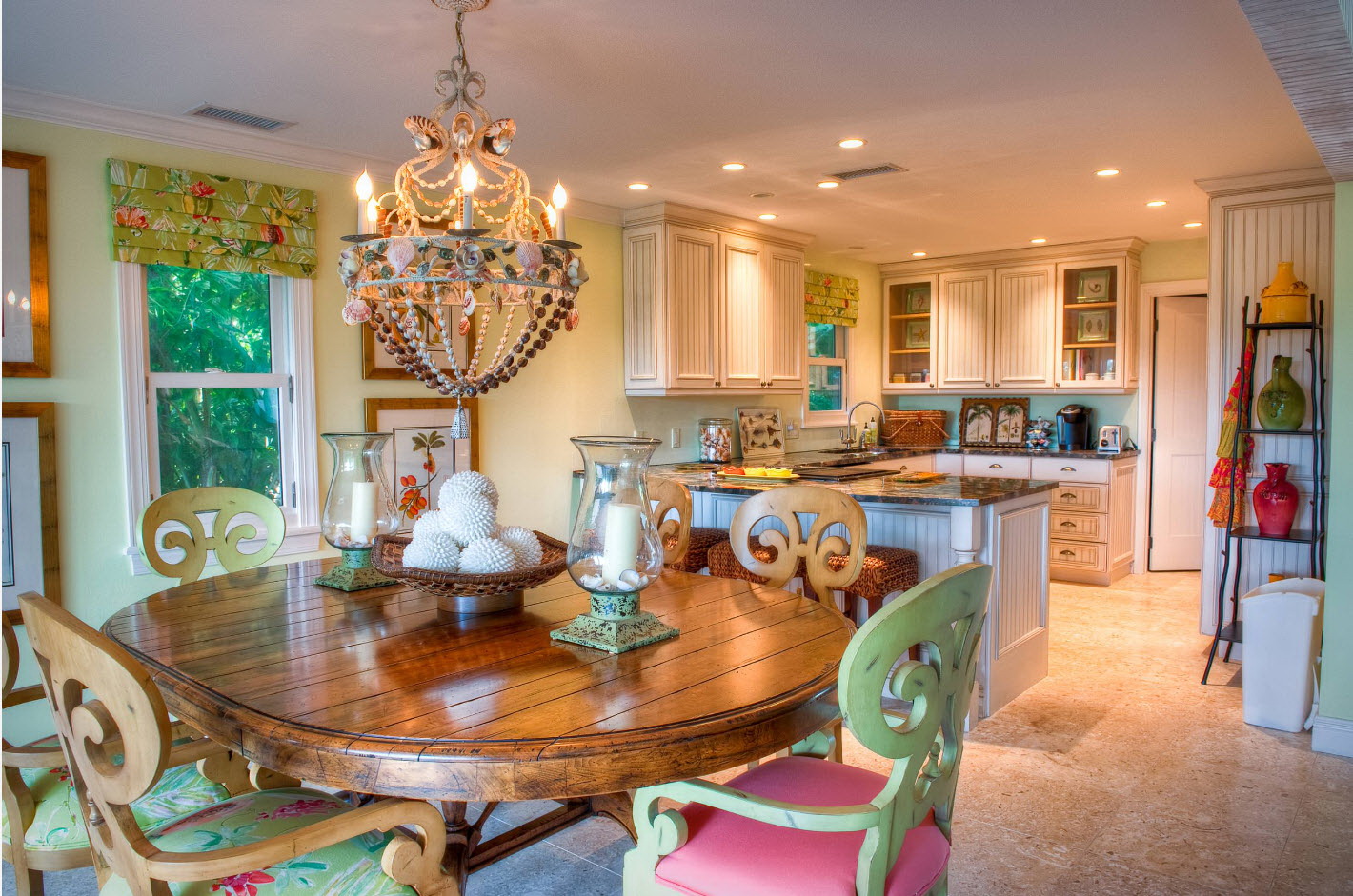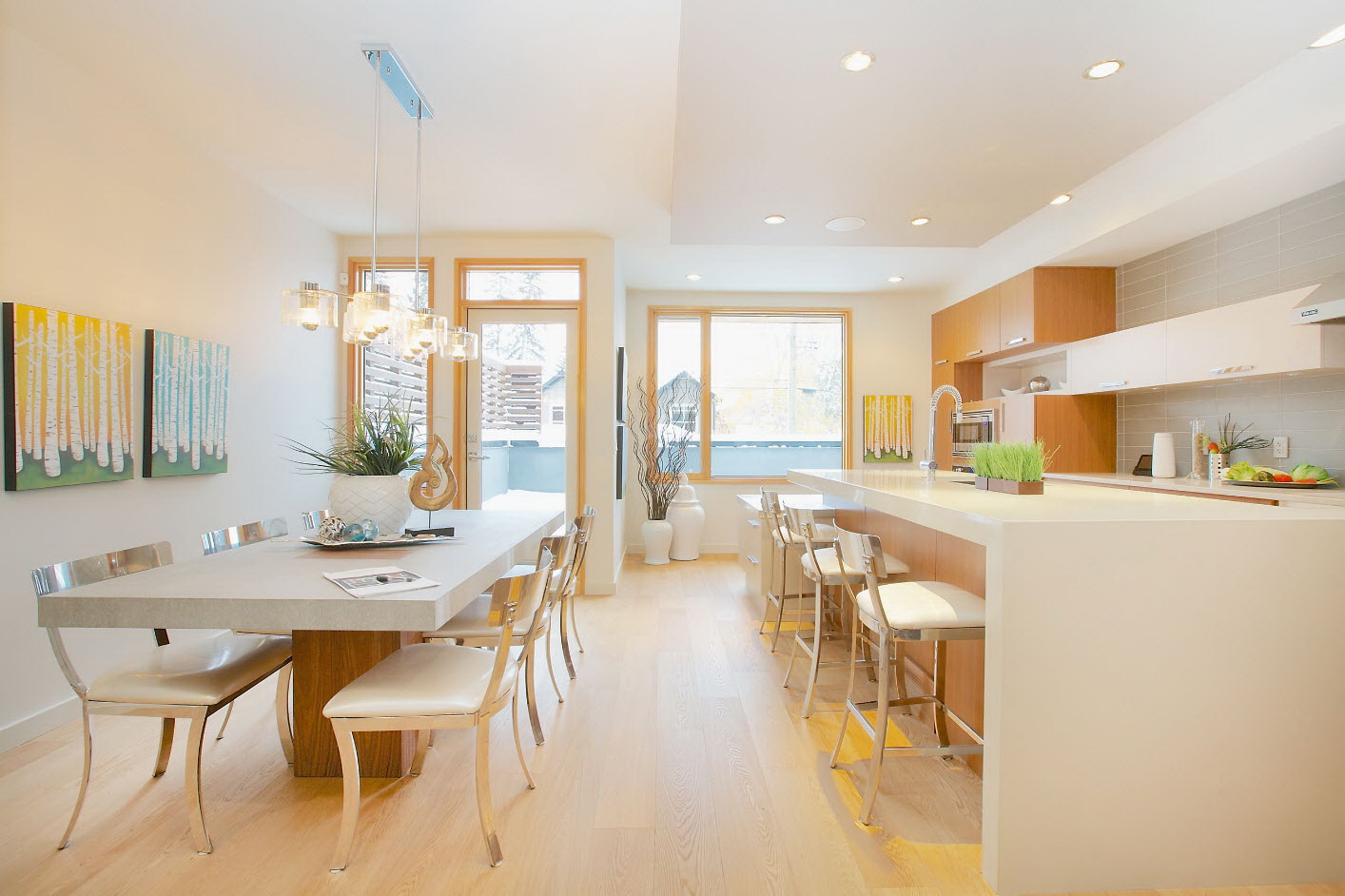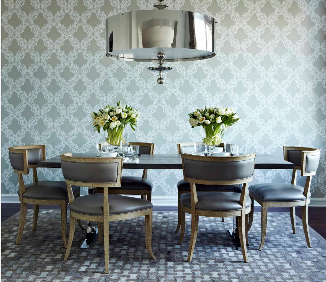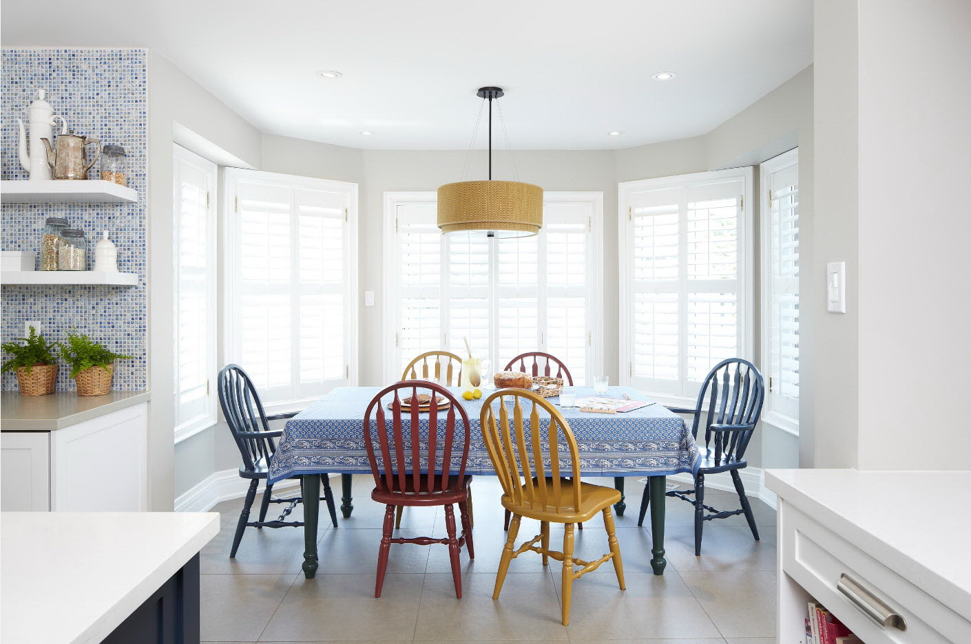 - os objetos têm diferentes tonalidades, harmoniosamente combinados entre si (mesa branca / cadeiras azul-claras, castanho mesa /bege cadeiras). É importante que o esquema de cores se encaixe no interior;