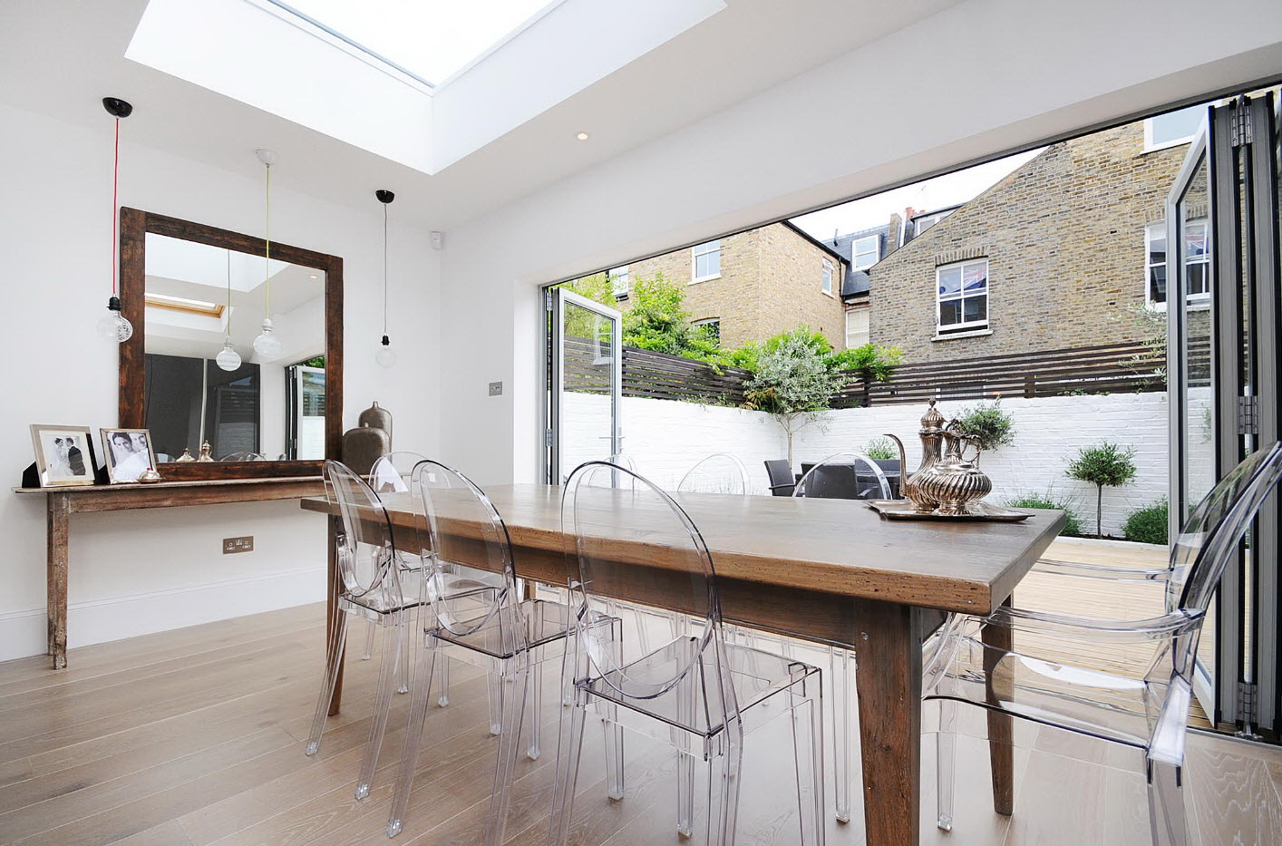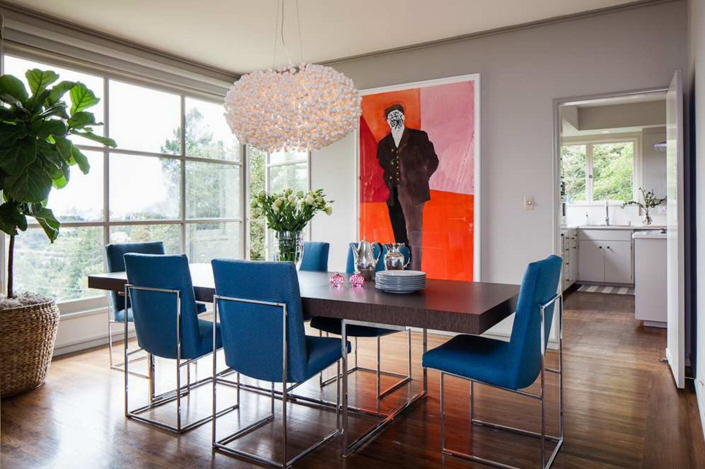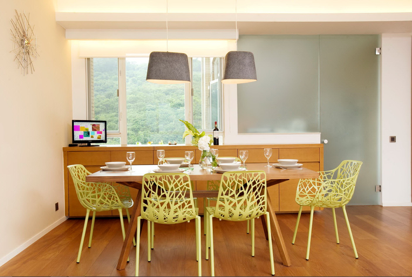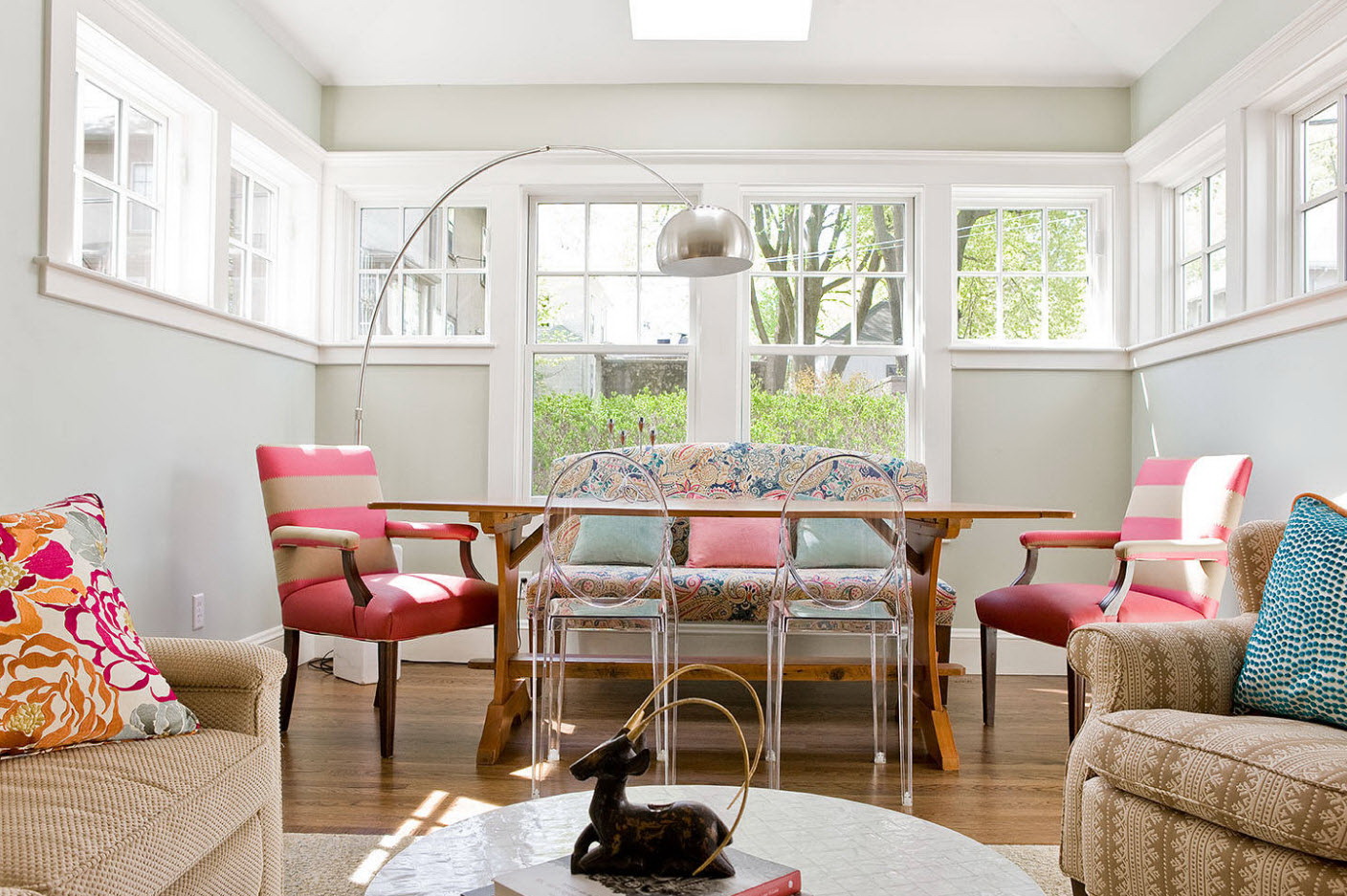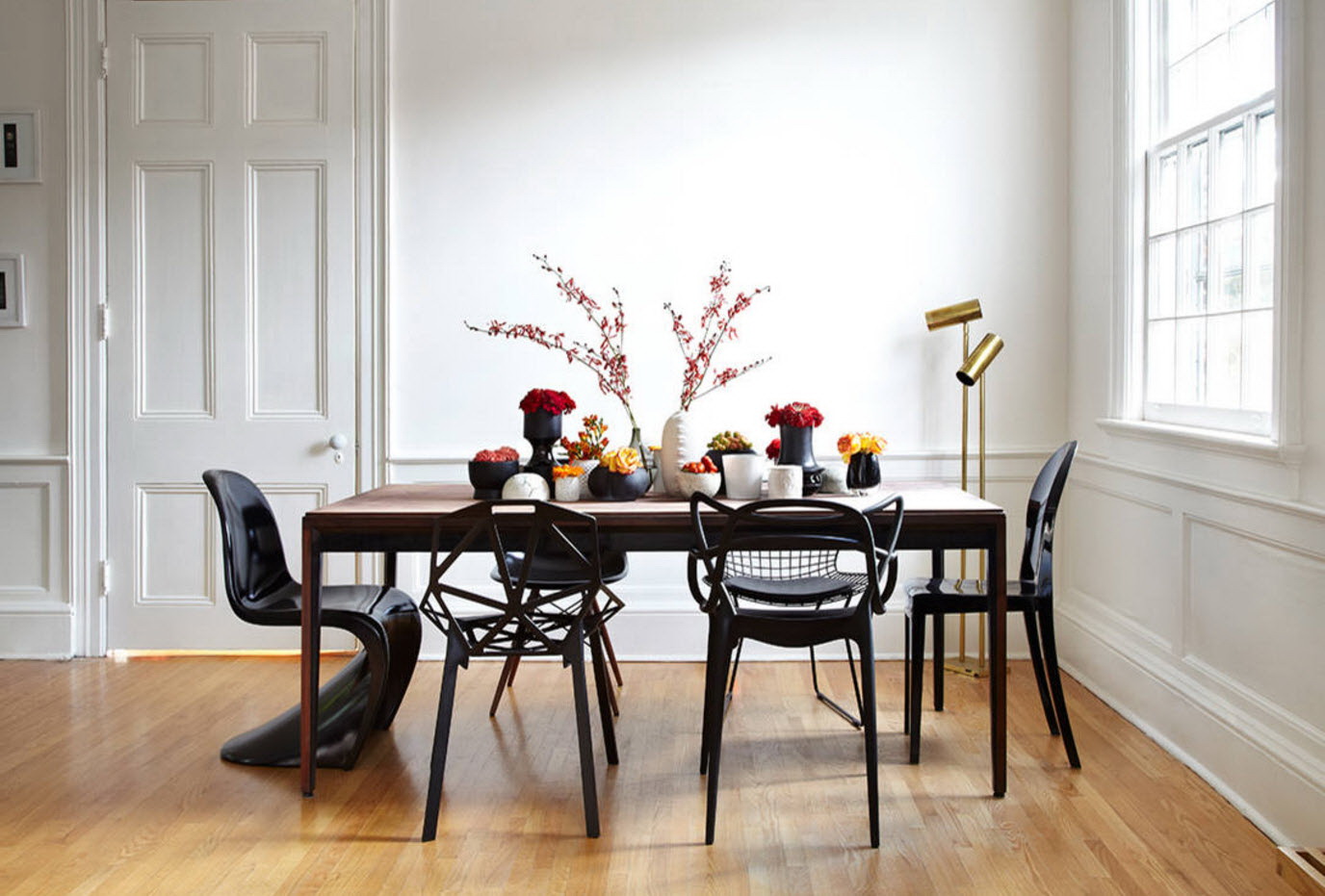 - os objetos têm diferentes tonalidades, harmoniosamente combinados entre si (mesa branca / cadeiras azul-claras, castanho mesa /bege cadeiras). É importante que o esquema de cores se encaixe no interior;