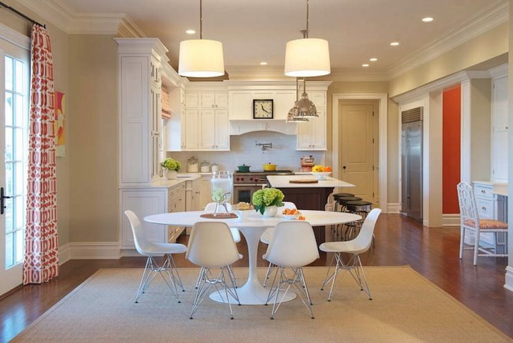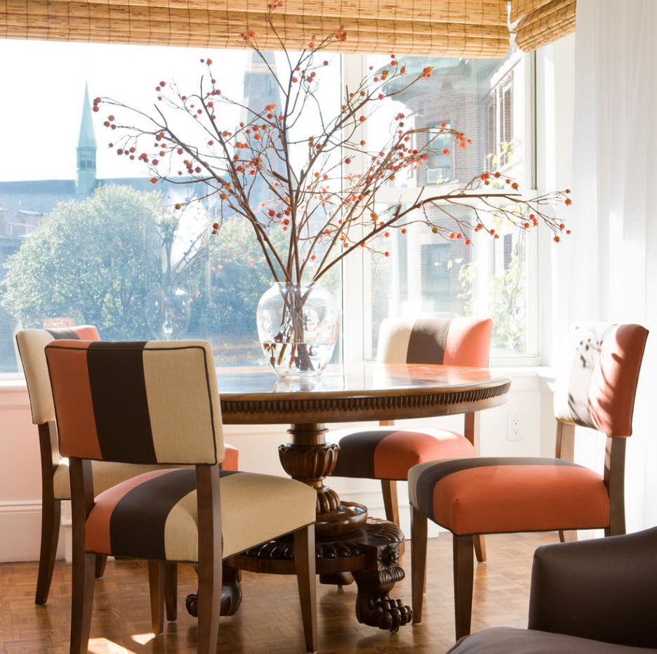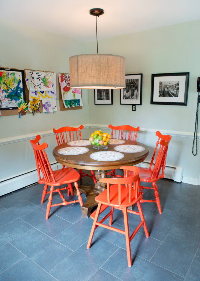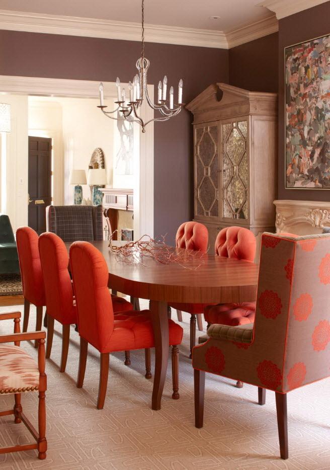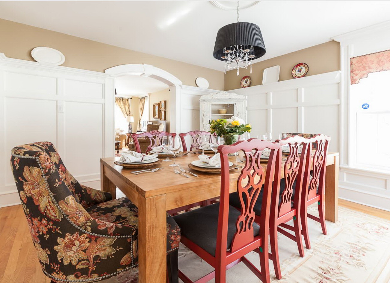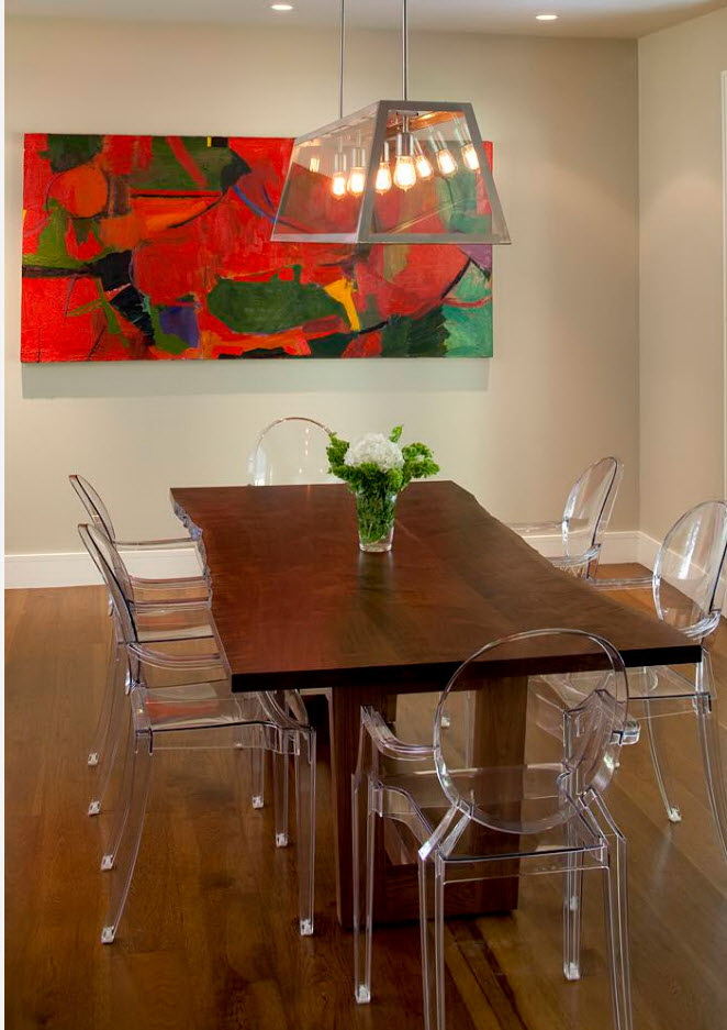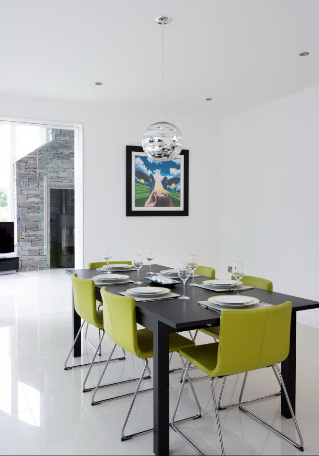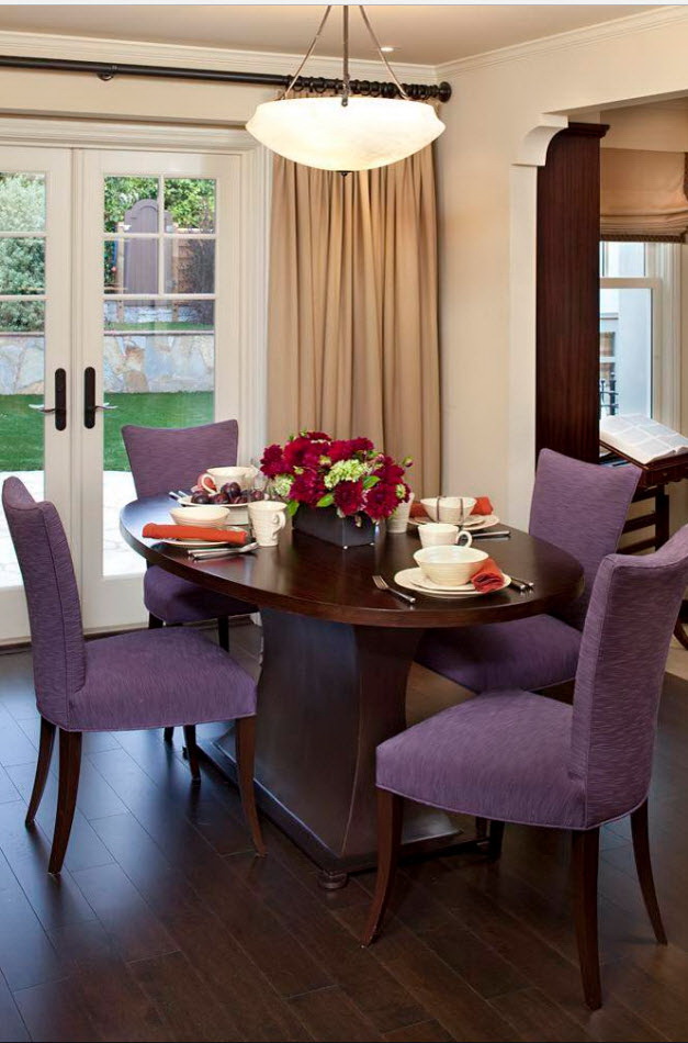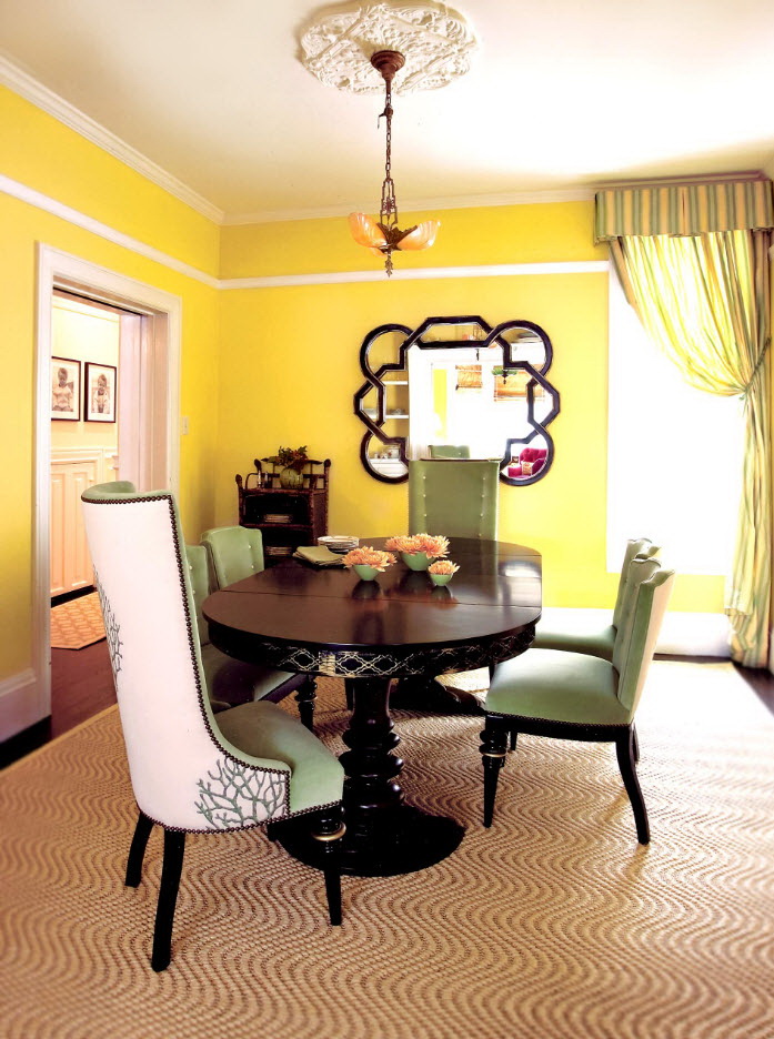 A abundância de tons no interior pode estragar a atmosfera da sala. Às vezes é difícil escolher combinações de tons, e coisas de cores adequadas nem sempre são encontradas. Portanto, a opção popular e tradicional - a instalação de móveis sólidos. O lado negativo de tais decisões de projetos - um olhar chato que parece desinteressante. Estilistas lembram que na tendência - cores brilhantes e combinações contrastantes. No entanto, não devemos esquecer que a mesa não é a única peça de mobiliário. O conjunto de restaurantes será parecido com um único grupo, se você seguir estas regras: