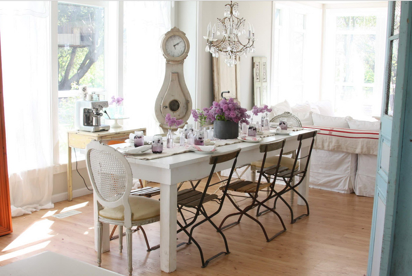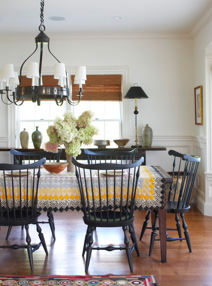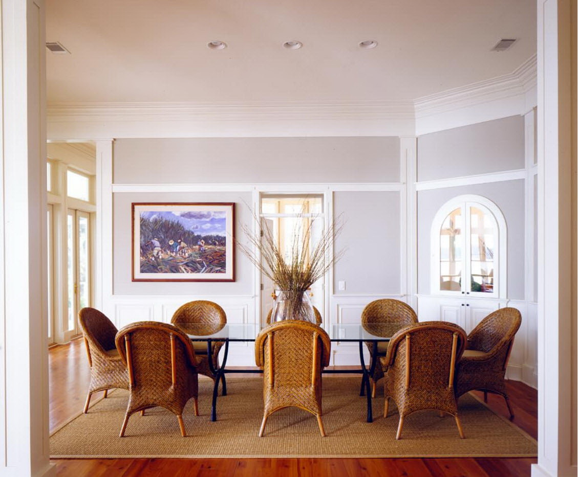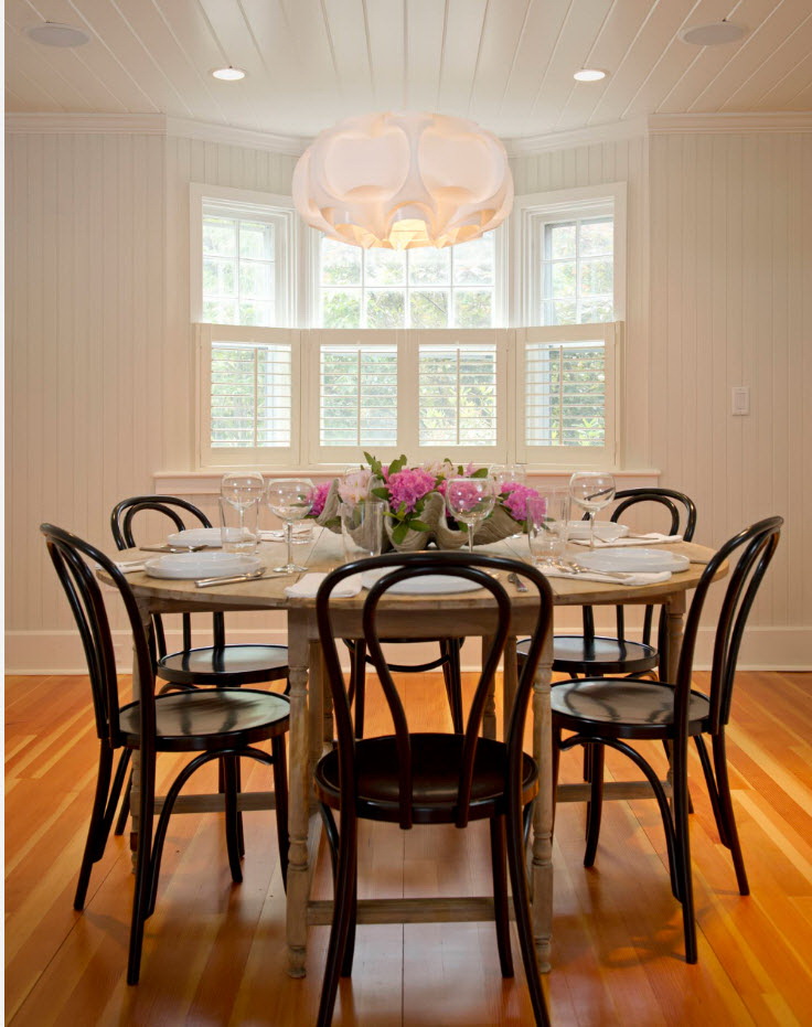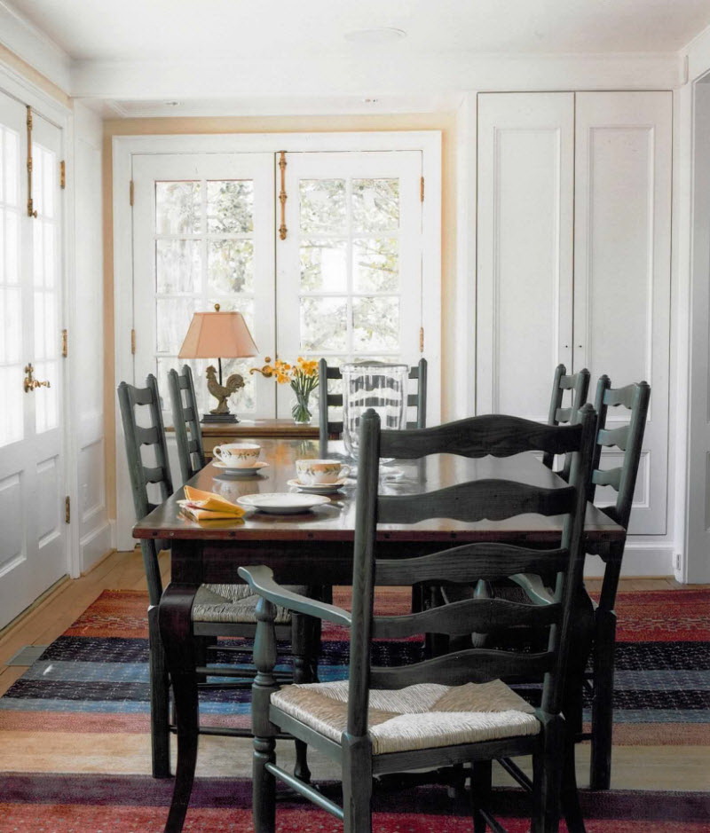 Toalhas de linho branco, guardanapos de vime, vasos de vidro com flores silvestres são enfatizados. Designers oferecem para completar o grupo de jantar com produtos diferentes: uma mesa oval branca em quatro pernas e cadeiras feitas de tons de madeira escura.