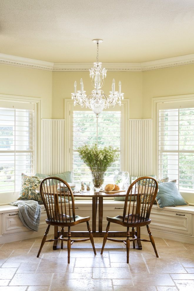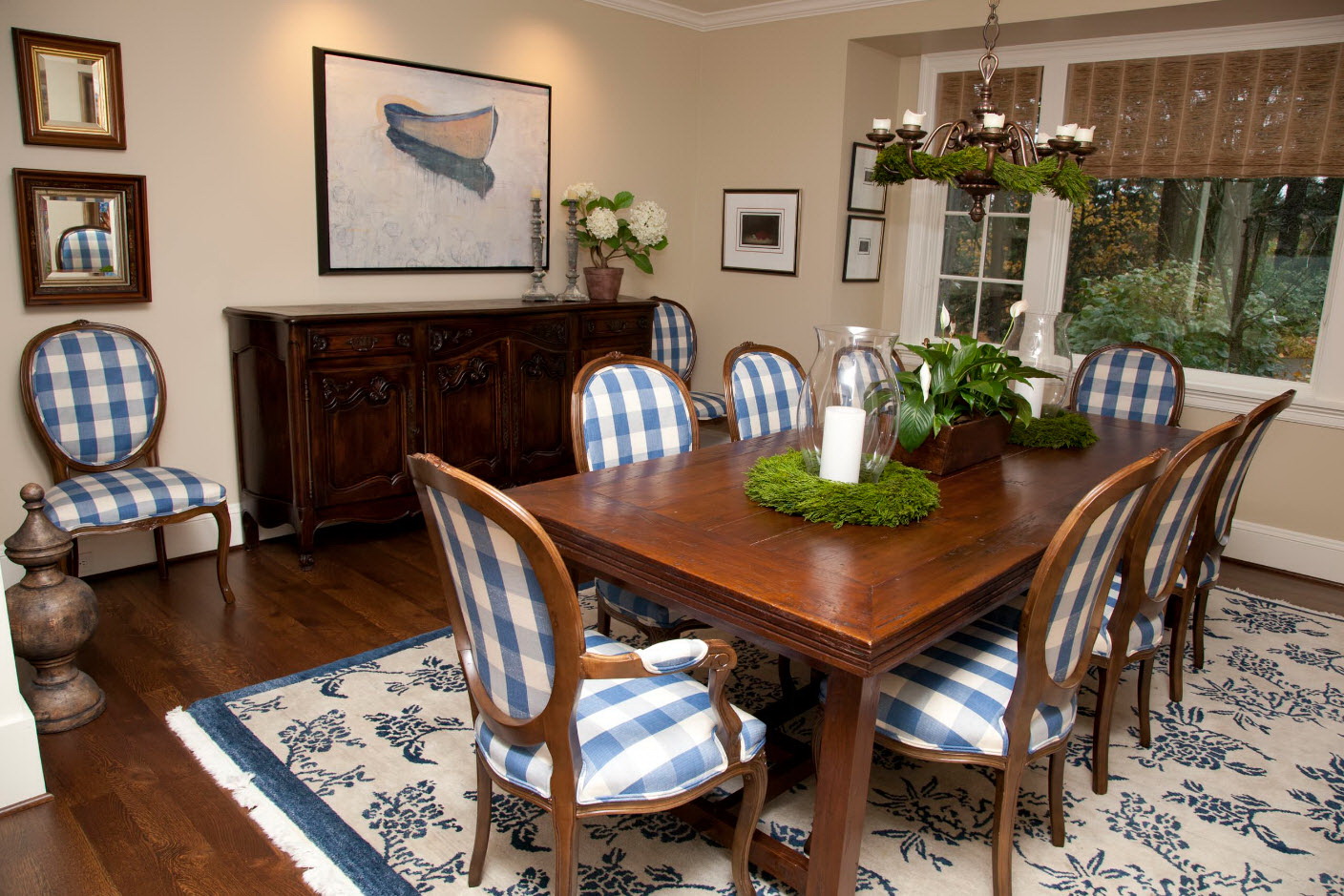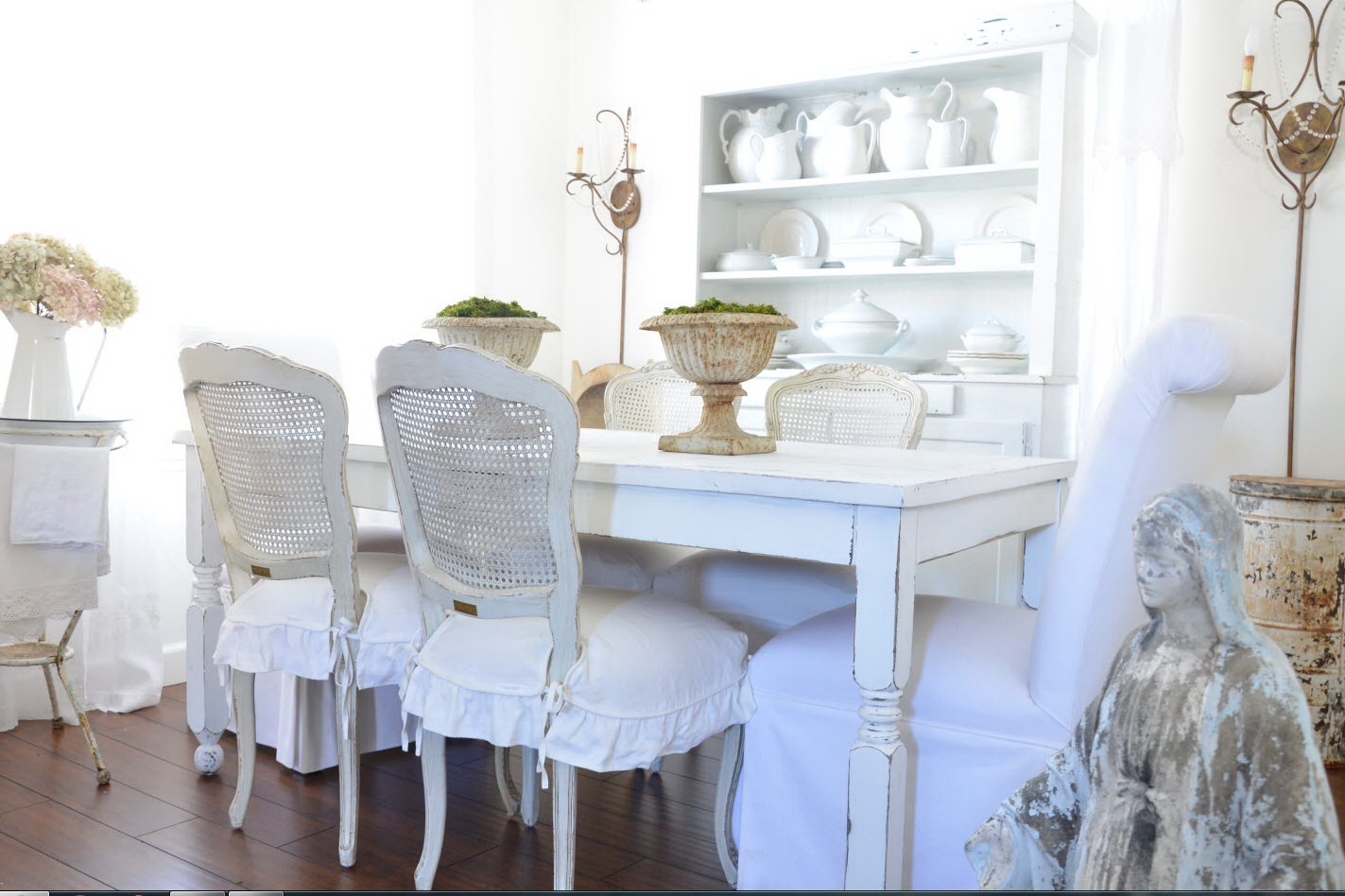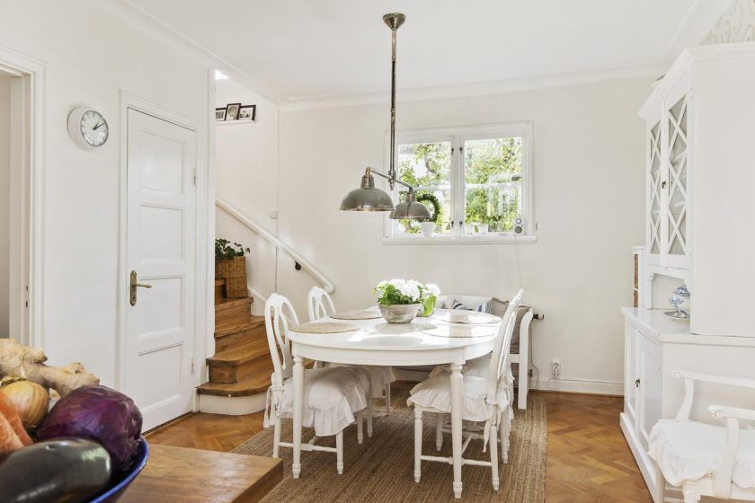 Toalhas de linho branco, guardanapos de vime, vasos de vidro com flores silvestres são enfatizados. Designers oferecem para completar o grupo de jantar com produtos diferentes: uma mesa oval branca em quatro pernas e cadeiras feitas de tons de madeira escura.