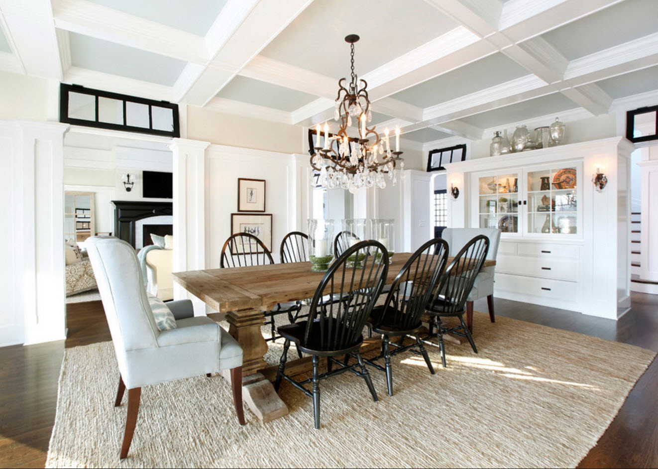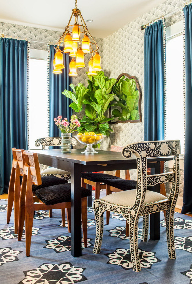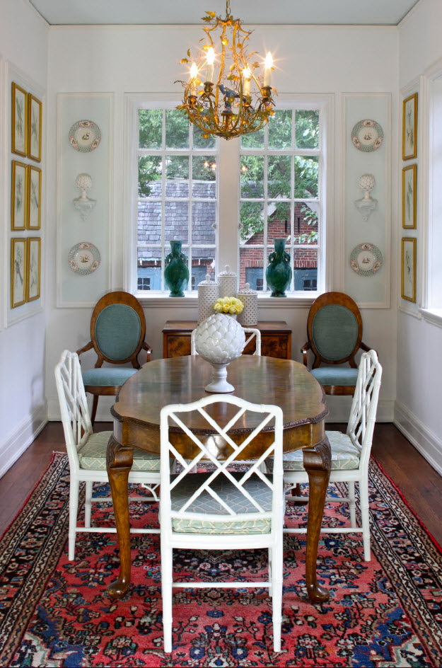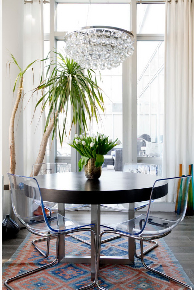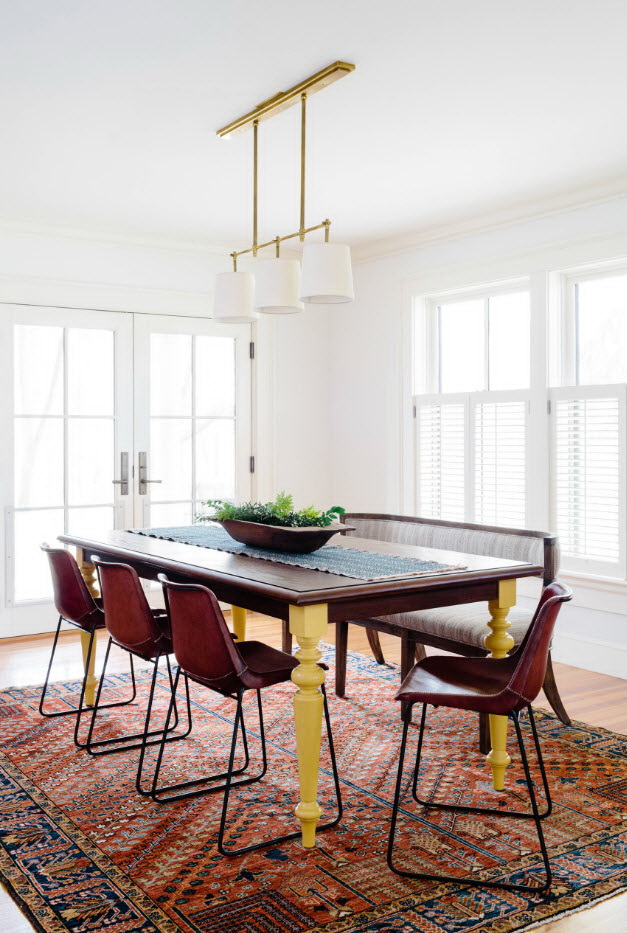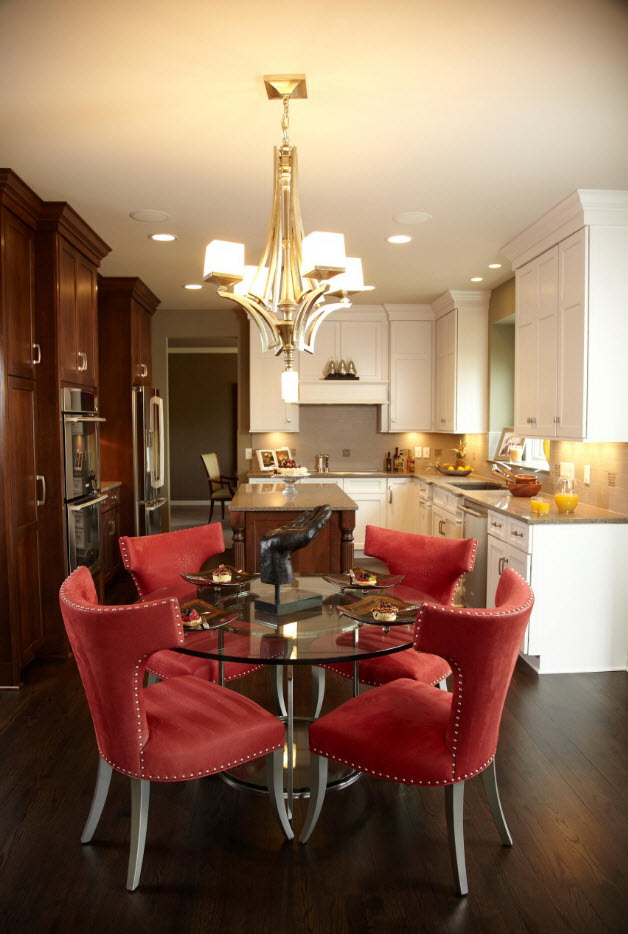 Pode acontecer que a mesa categoricamente não se encaixe no conjunto da cozinha.. Se o objeto é difícil de recusar, então é necessário delimitar visualmente as zonas. E desafiadoramente lindamente enfatizar a área de jantar - carpete no chão, interessante candelabro.