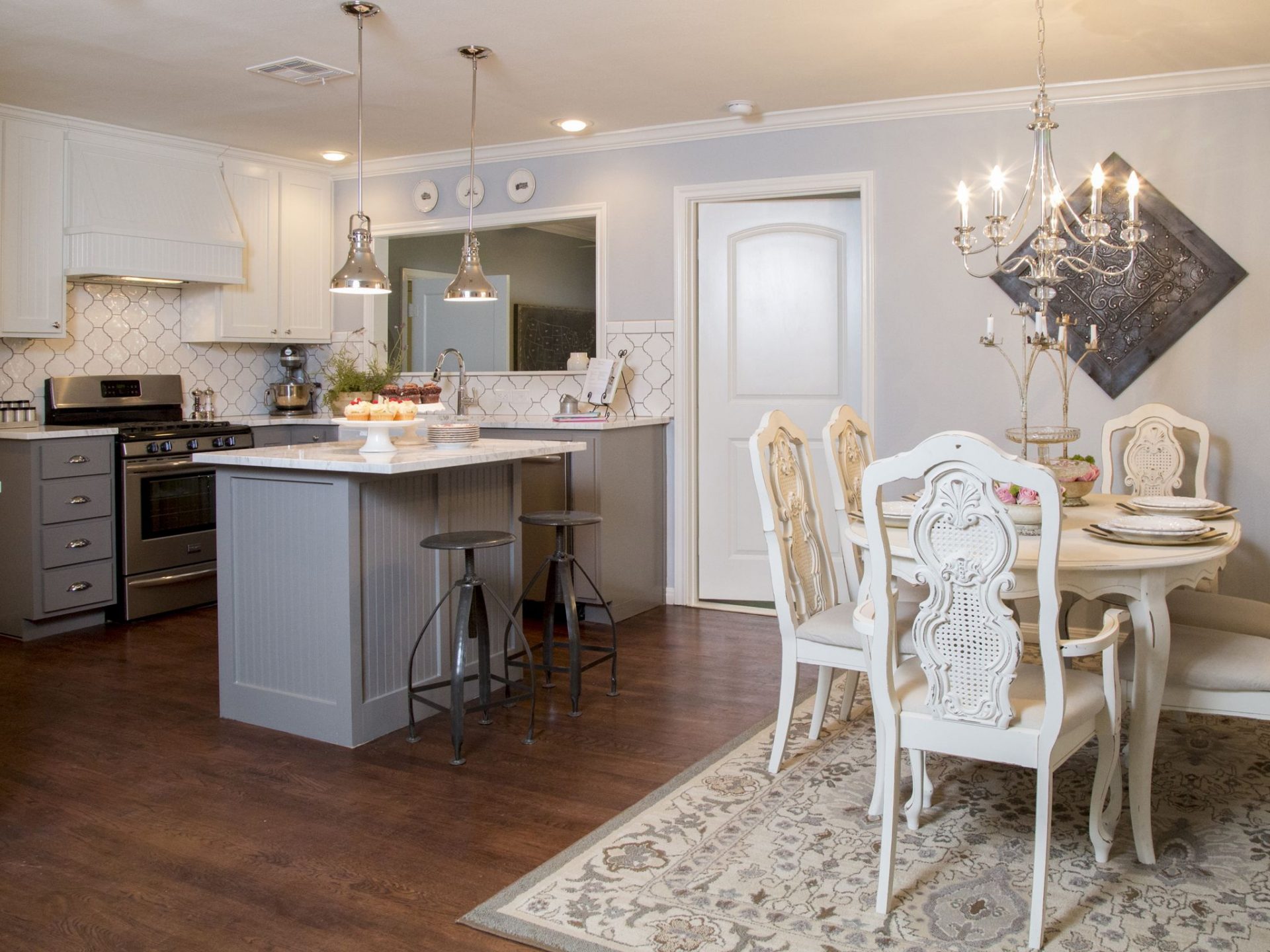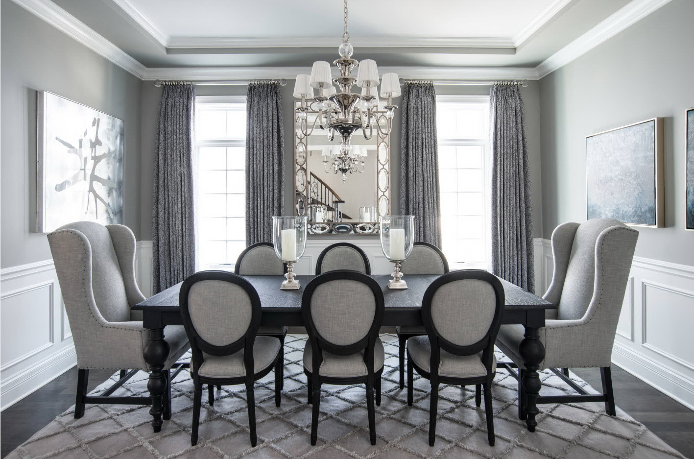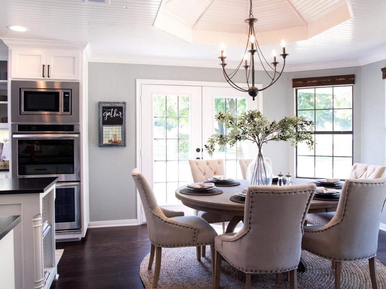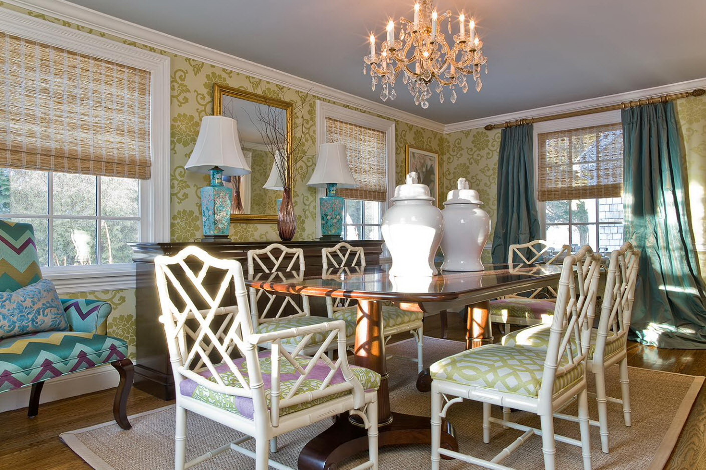Pode acontecer que a mesa categoricamente não se encaixe no conjunto da cozinha.. Se o objeto é difícil de recusar, então é necessário delimitar visualmente as zonas. E desafiadoramente lindamente enfatizar a área de jantar - carpete no chão, interessante candelabro.