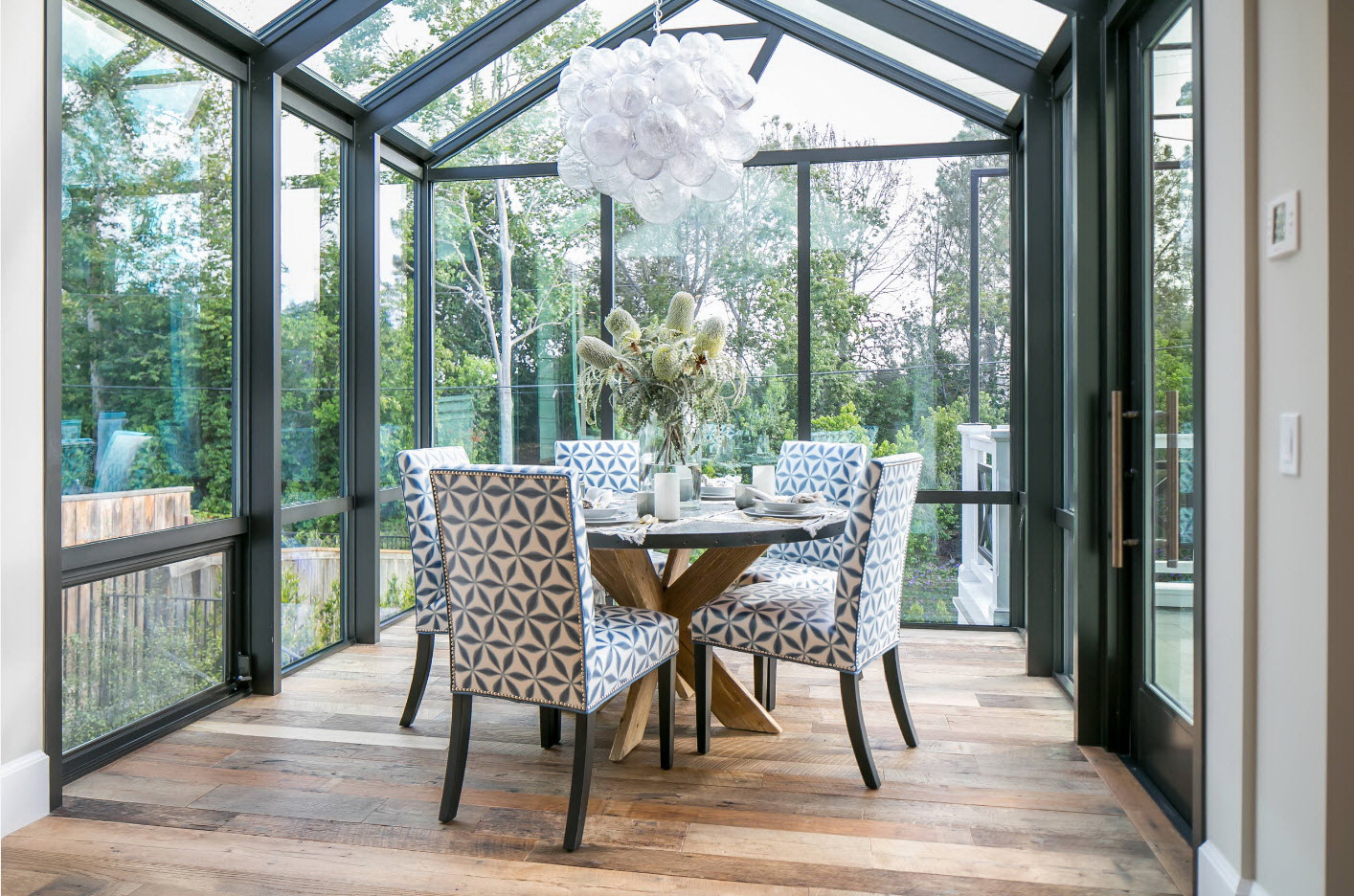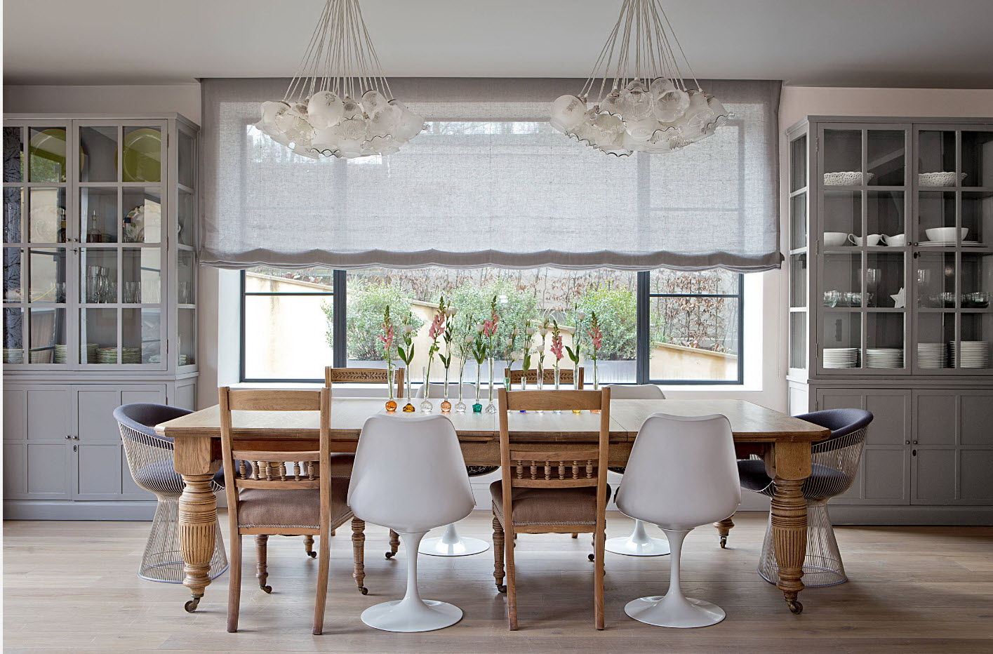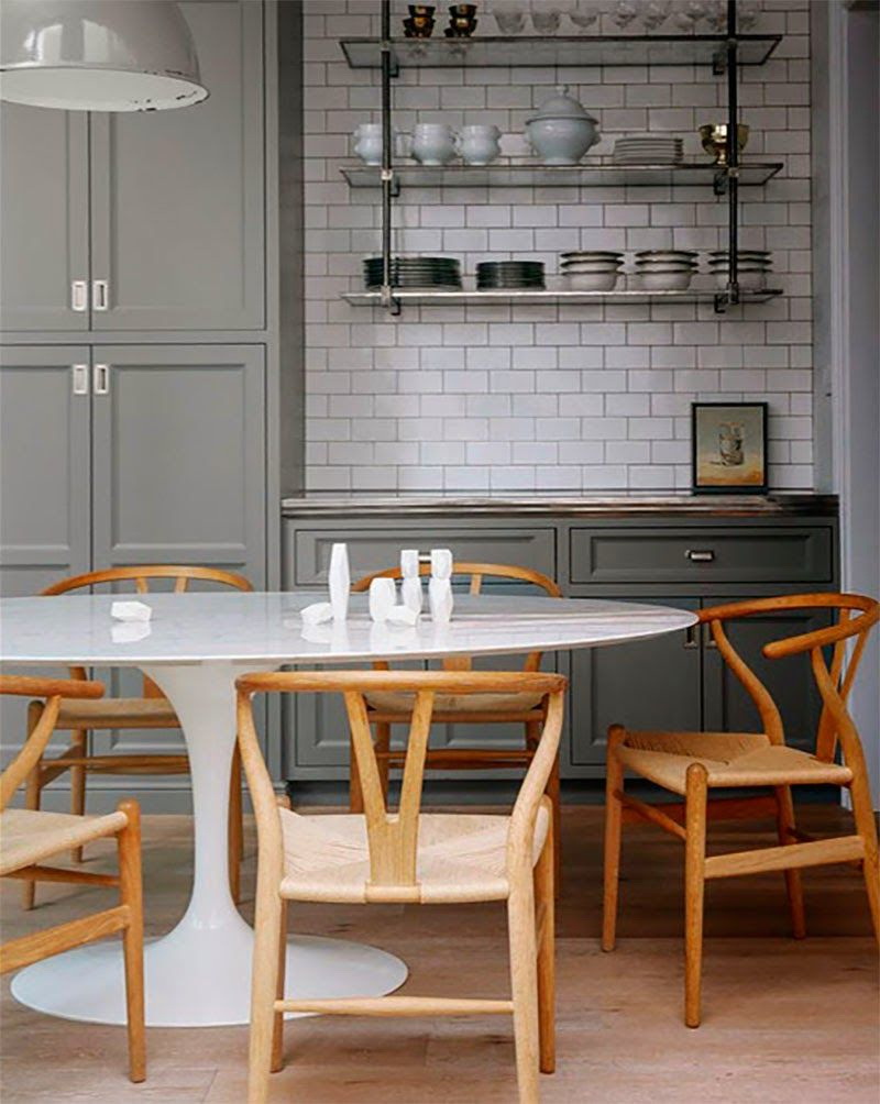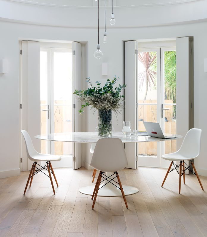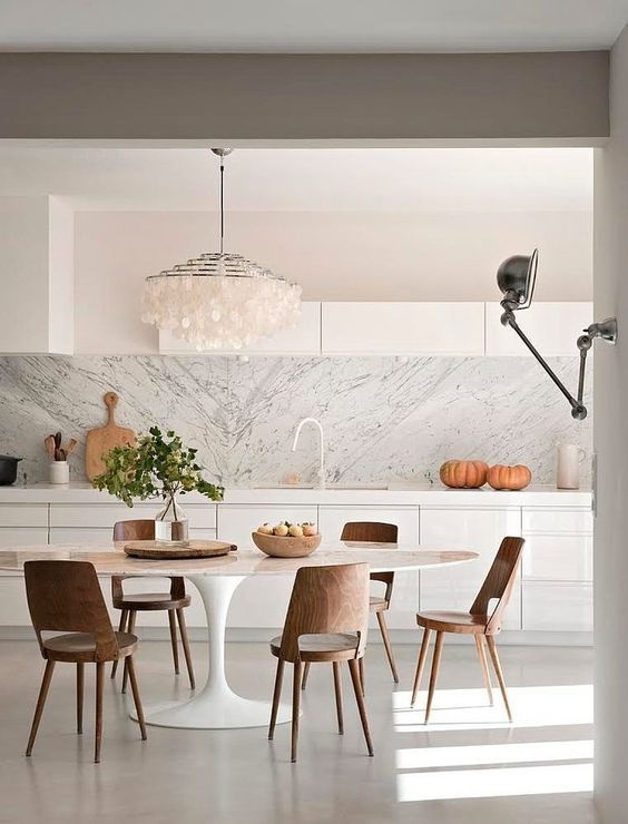 Uma mesa oval sobre uma base de metal branco na forma de uma perna vítrea coexistirá elegantemente com cadeiras com costas de arame. O kit parece conciso e até um pouco ascético.