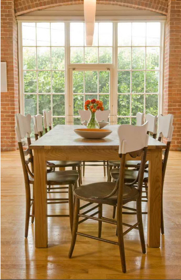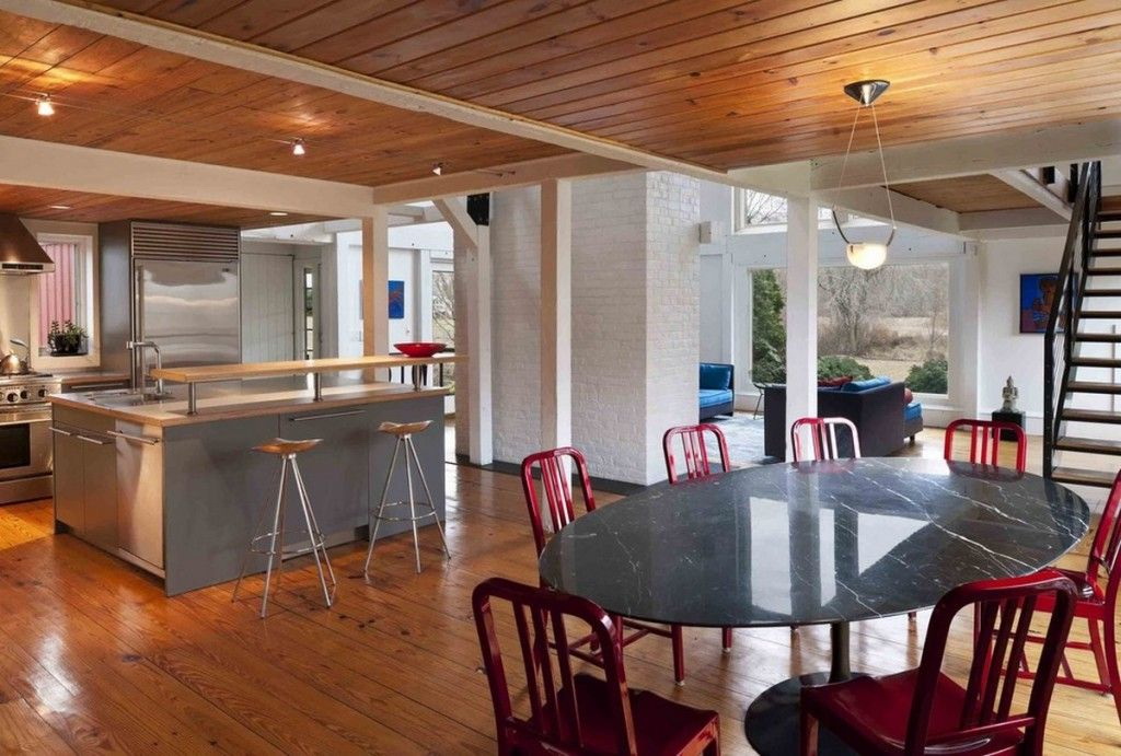 A funcionalidade e simplicidade do interior enfatizará o grupo de jantar de madeira natural. Produtos de pinho de forma simples, cobertos com verniz incolor atraem a atenção com uma estrutura natural. É interessante olhar para as mesas com detalhes contrastantes: pernas ou apenas uma mesa coberta com tinta branca.