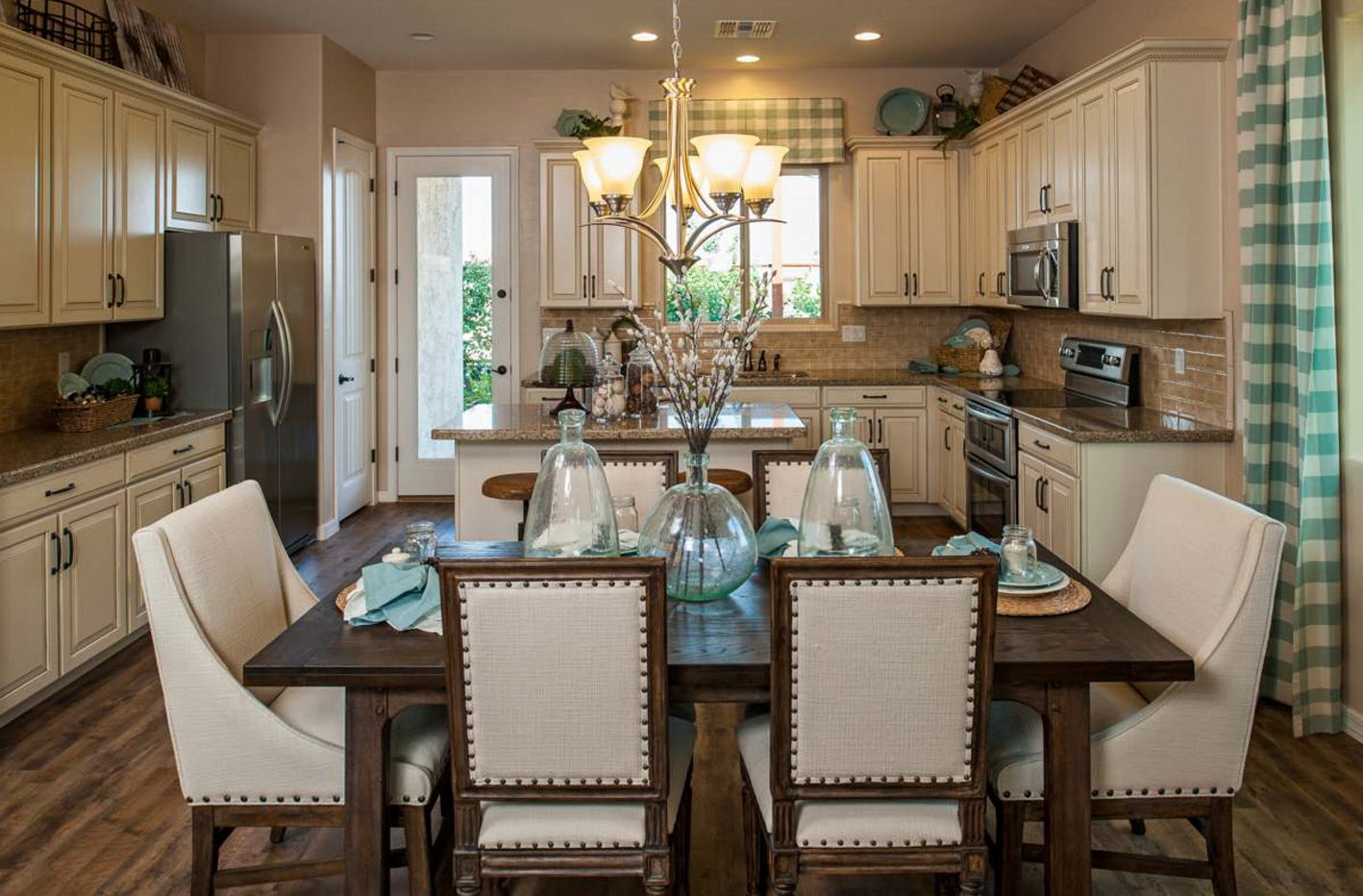 No cativeiro da vida agitada da cidade, há uma crescente necessidade de calma e conforto. E é bem possível criar um canto tão tranquilo na cozinha. Materiais naturais, tons suaves naturais criam um ambiente simples e descontraído. A mesa oval em estilo country é feita de madeira natural e difere em potência e tamanho. Portanto, tais móveis apenas em salas espaçosas estarão "em seu lugar".