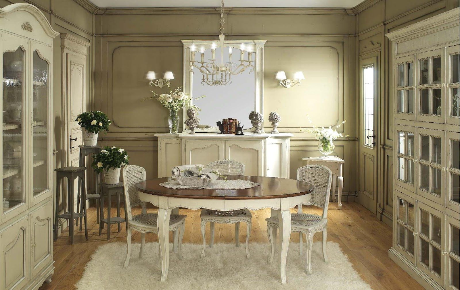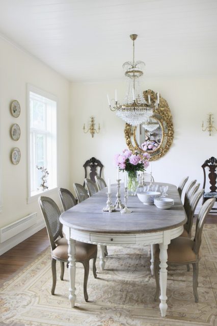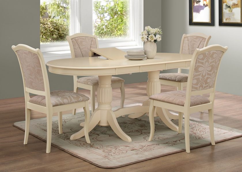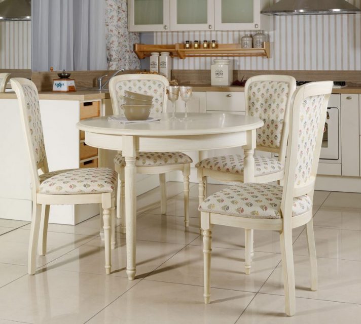 Graças às cores claras dos tons pastel (azulados, arenosos, leitosos) os objetos tornam-se visualmente mais finos e leves. As pernas curvas dão à mobília um chique francês especial. A mesa oval com bancada envelhecida artificialmente tornou-se uma tendência real. Para criar um efeito semelhante é usado lixa, que é pernas ligeiramente aparadas, a borda da superfície de trabalho.